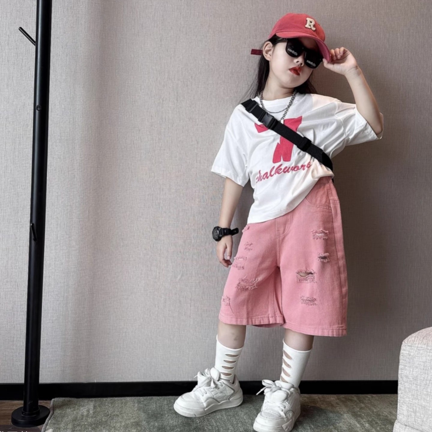 • 흰색 반팔 + 분홍색 찢어진 반바지