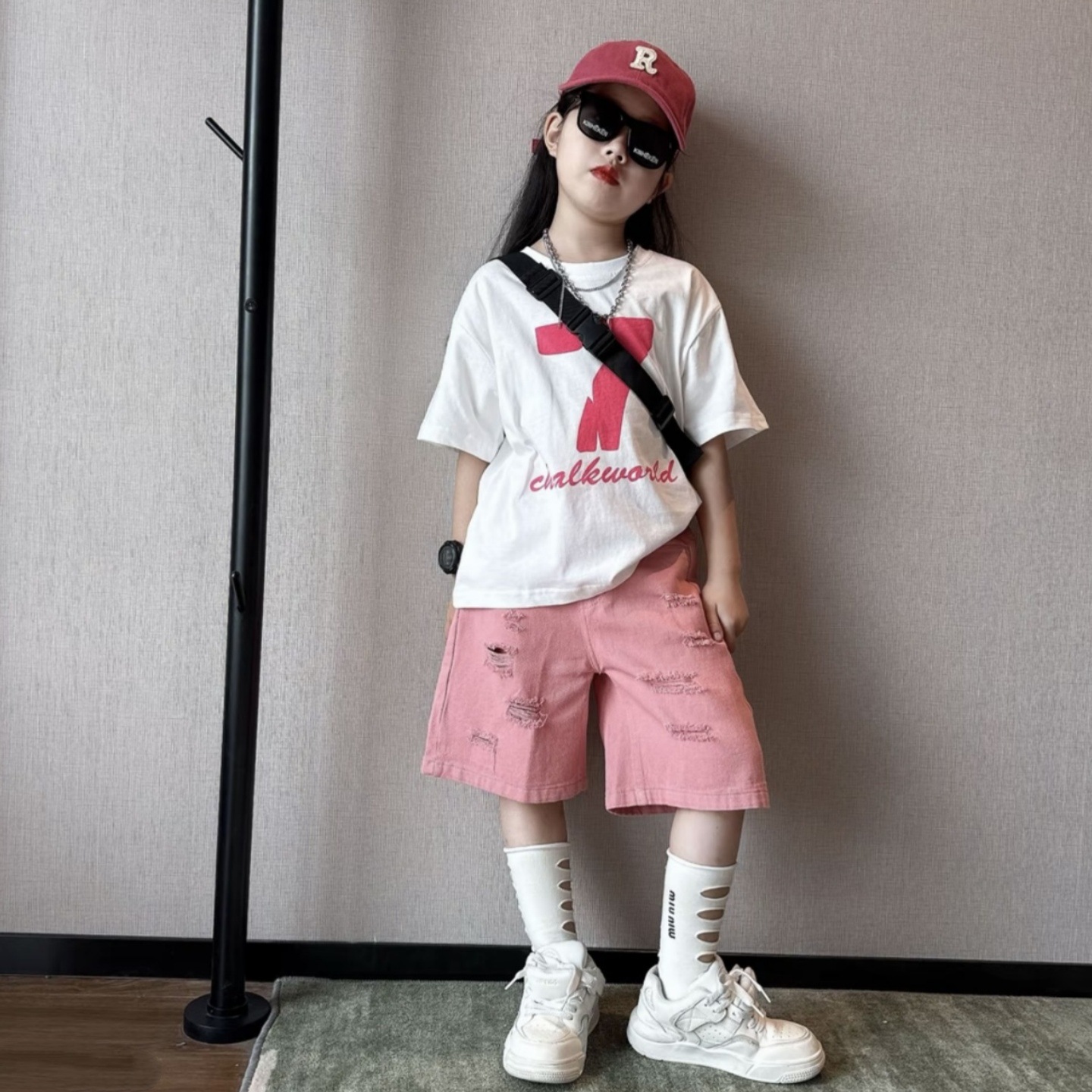 여아 여름 캐주얼 스타일 찢어진 중간 바지, 스타일리시한 중학생 심플 루즈 7자 반팔 티셔츠 투피스 트렌디 세트스토어 가기