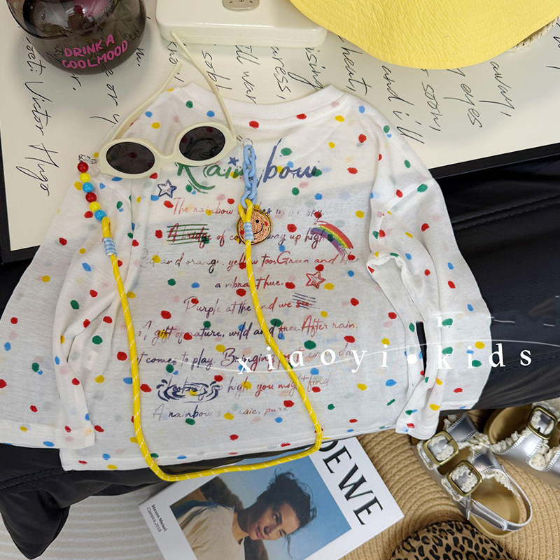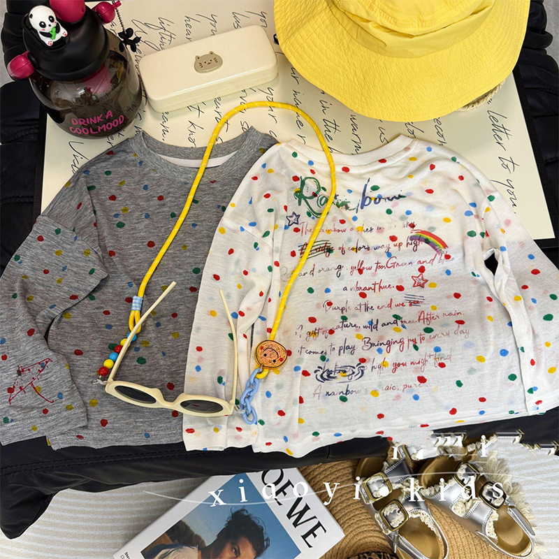 얇고 시원한 도파민 컬러풀한 폴카 도트 라운드 넥 긴팔 티셔츠 여아 2025 여름 신작 자외선 차단 셔츠 탑