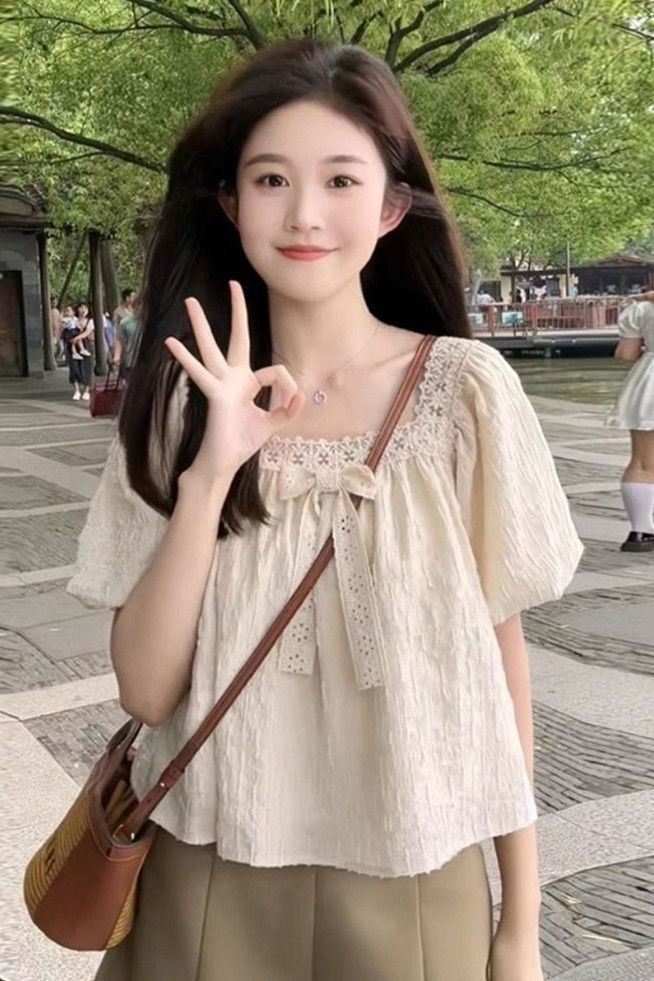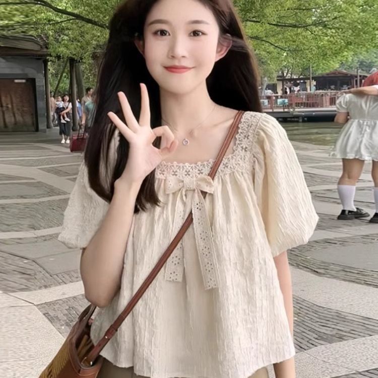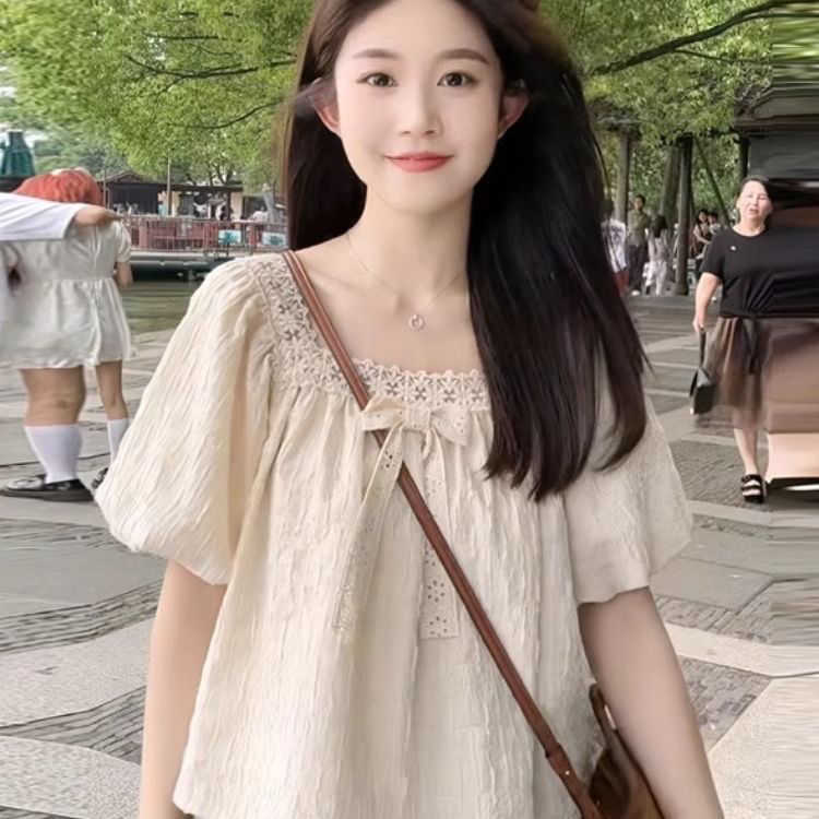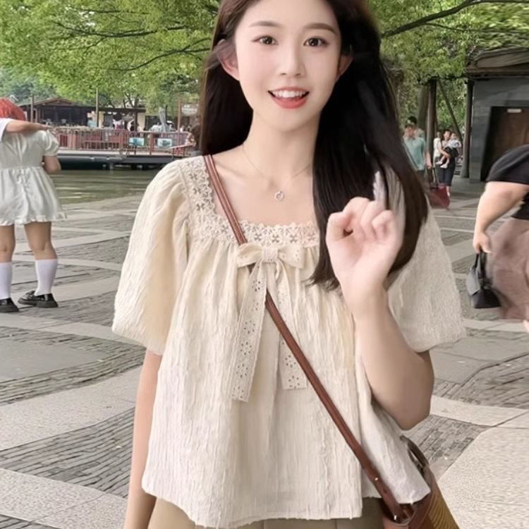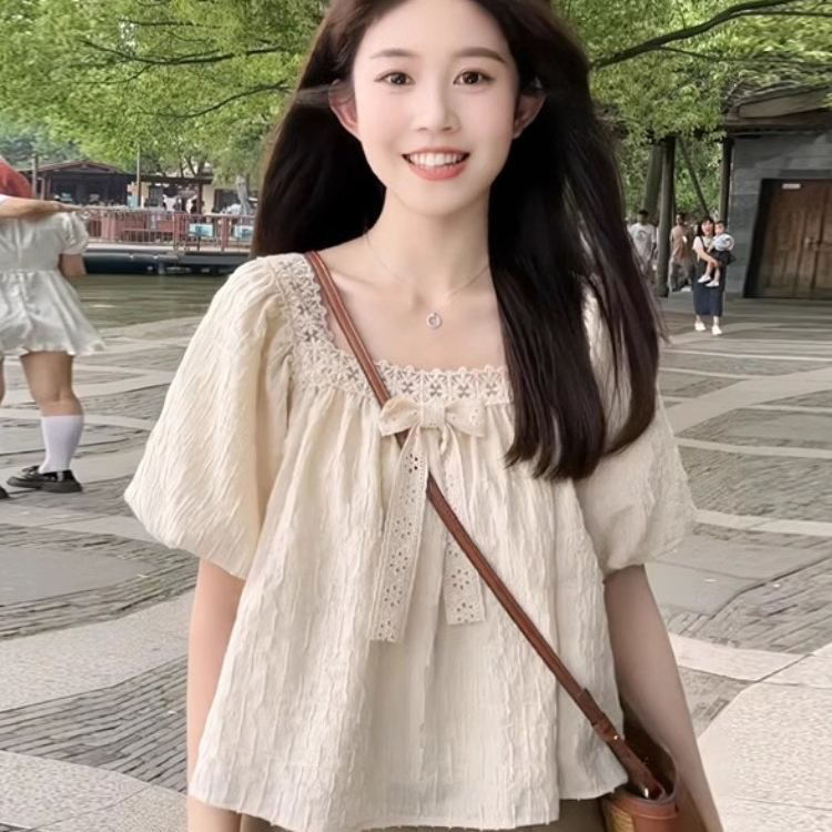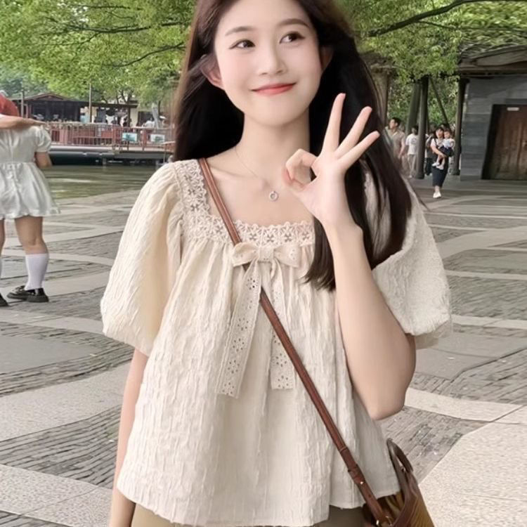 여름 여성을 위한 프렌치 레이스 쉬폰 셔츠, 하이엔드 슬리밍 퍼프 슬리브 쇼트 탑, 틈새 디자인스토어 가기