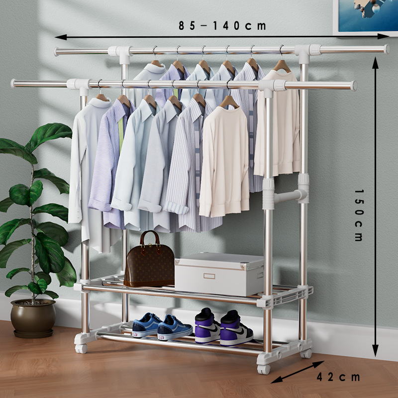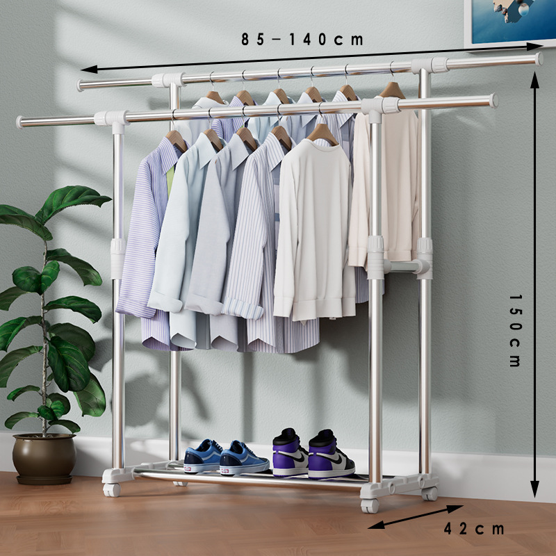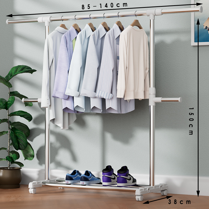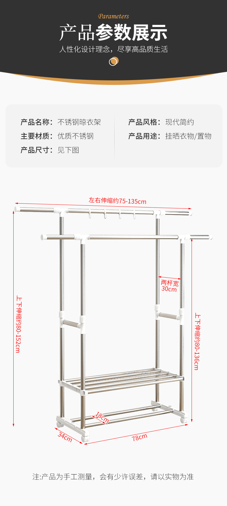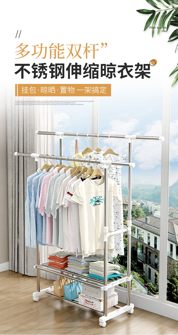 이중봉 옷걸이, 가정용 스테인리스 이동식 접이식 옷걸이, 간편형 옷걸이, 발코니 침실 건조대