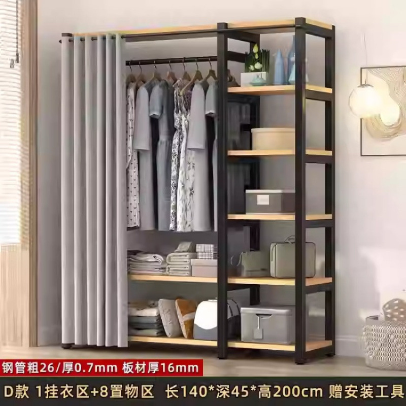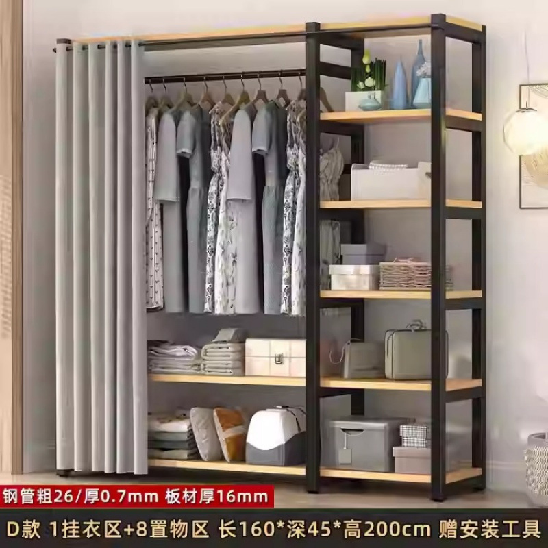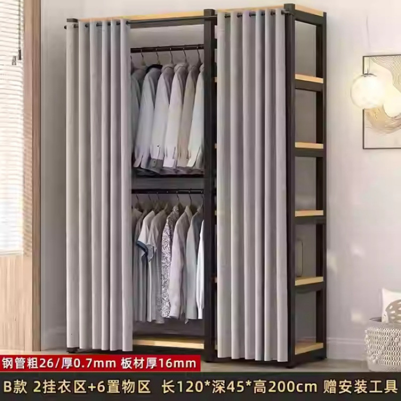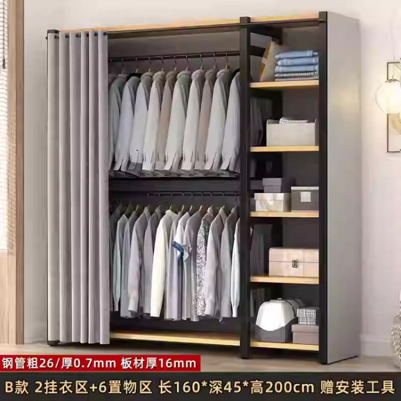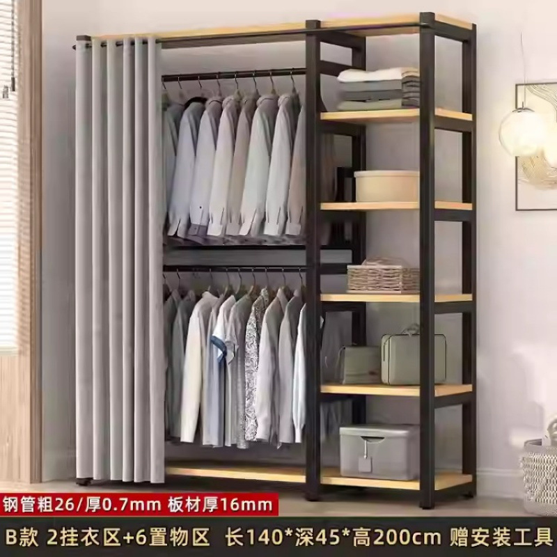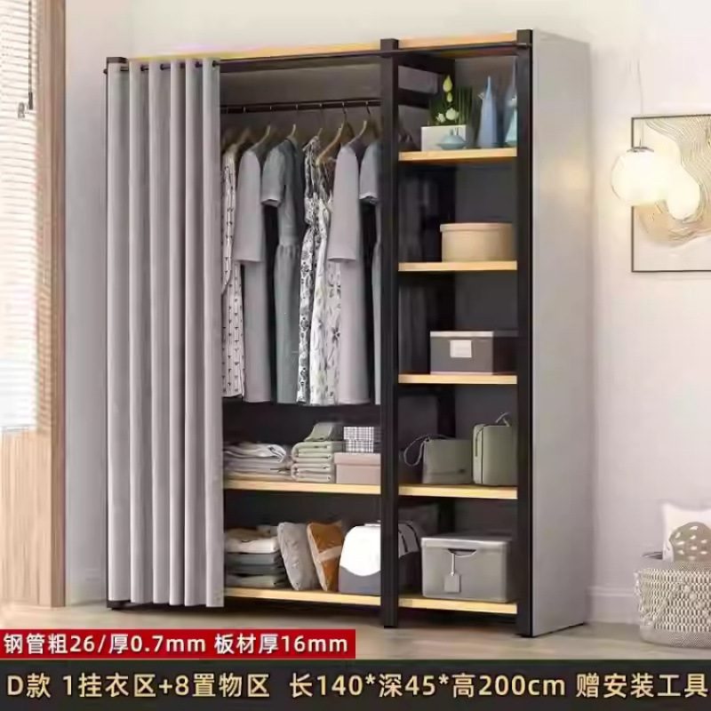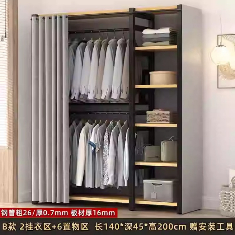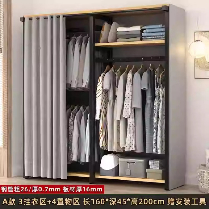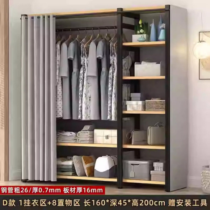 금속 옷장 홈 침실 간단한 조립 강철 프레임 단단한 나무 강력하고 내구성이 뛰어난 작은 아파트 천 옷장 옷걸이