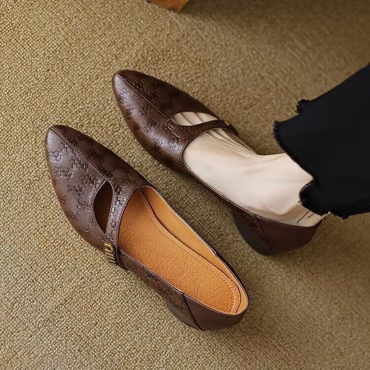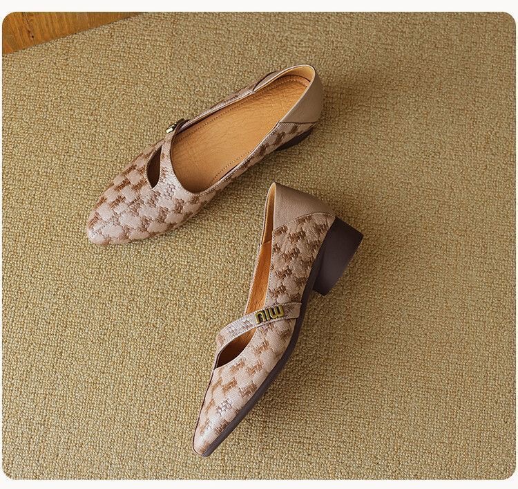 2025 봄 문학 복고풍 로우 힐 슈즈 브라운 체크 무늬 중공 뾰족한 발가락 펌프스 플랫 사계절 펌프스 슈즈