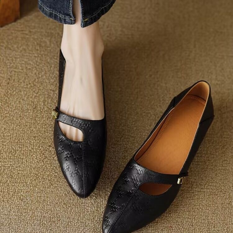2025 봄 문학 복고풍 로우 힐 슈즈 브라운 체크 무늬 중공 뾰족한 발가락 펌프스 플랫 사계절 펌프스 슈즈스토어 가기