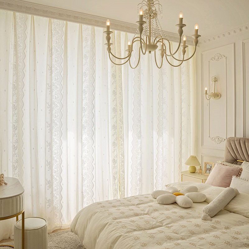 실이 있는 더블 레이어 공주 창 침실 스타일의 가벼운 고급 웨이브 프렌치 거즈 커튼, 빛을 투과하지 않고 레이스 크림 커튼