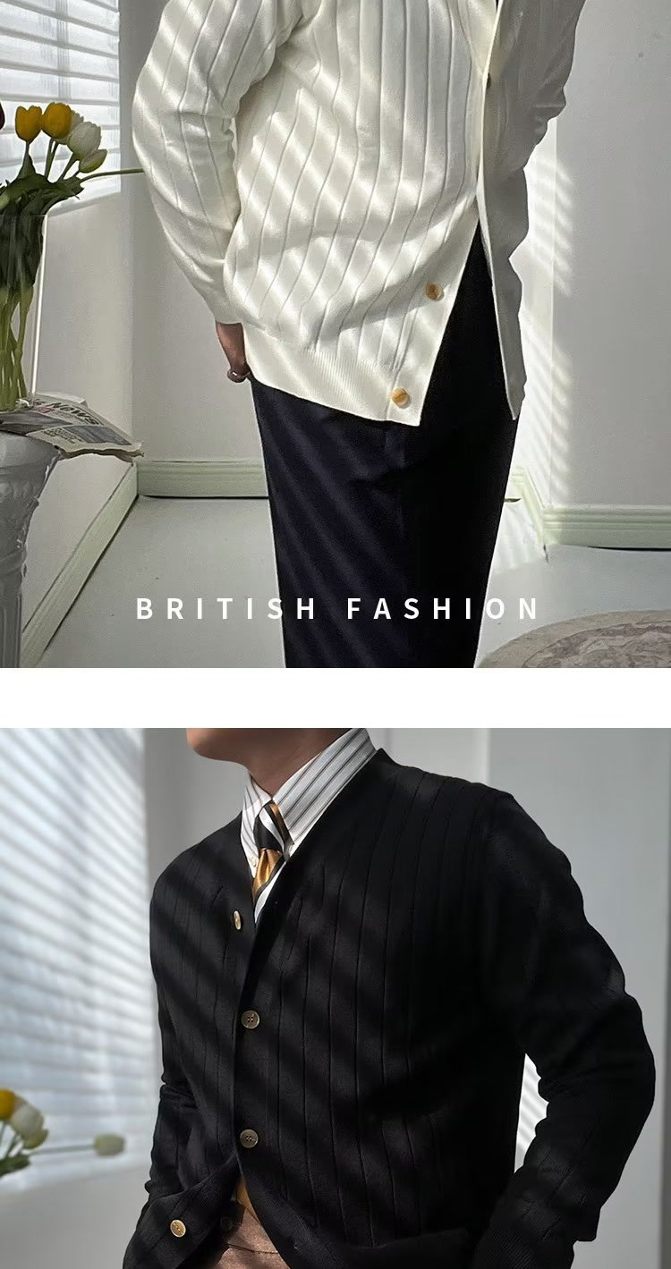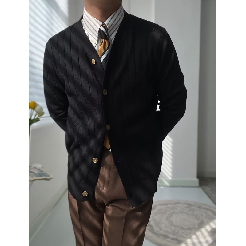 2025 가을 슬림 텍스처 얇은 카디건 니트 패션 심플 트렌디 남성 스트라이프 v 넥 스웨터 스몰 코트스토어 가기