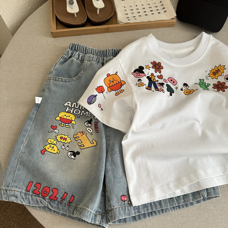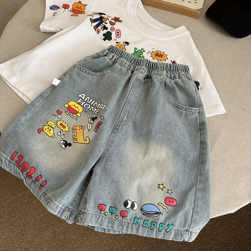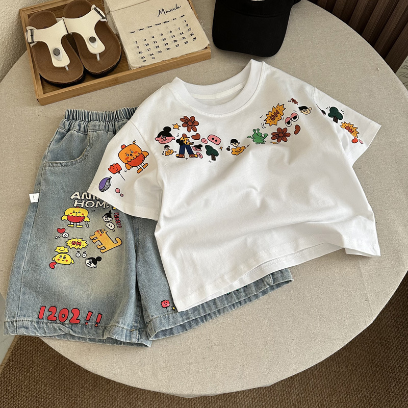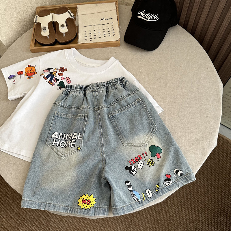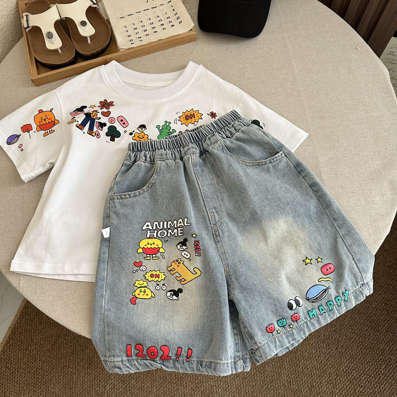 인기 있는 어린이 여름 정장 새로운 반팔 데님 바지 소년과 어린이를위한 느슨한 만화 투피스 세트스토어 가기