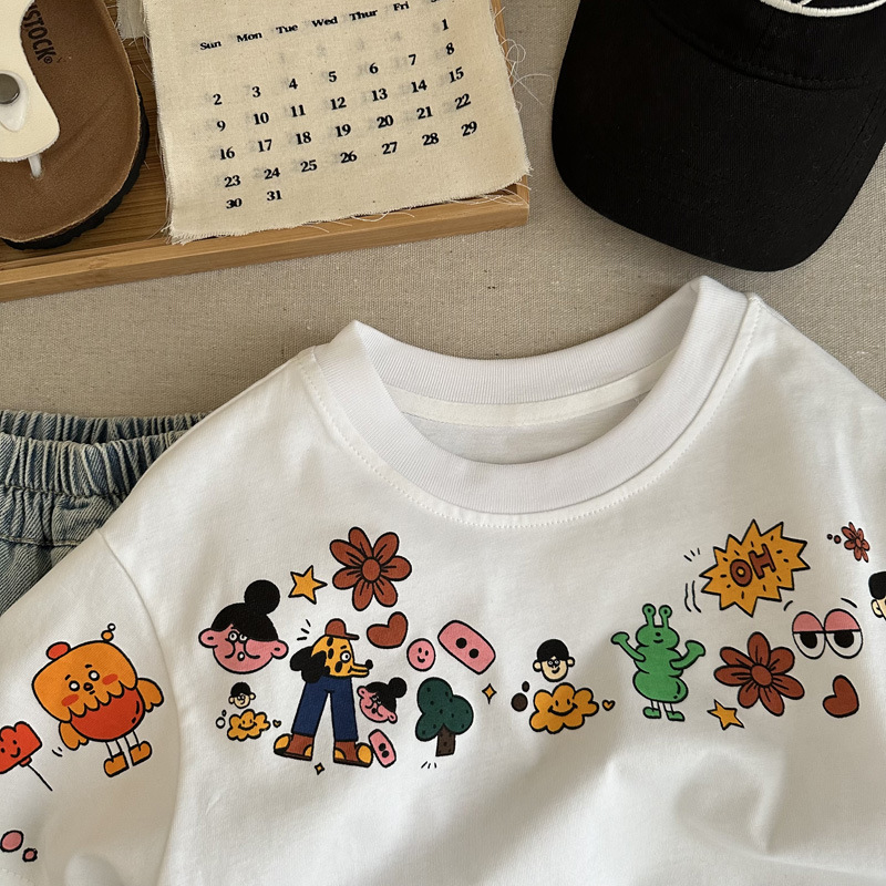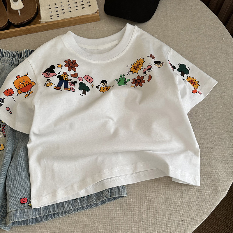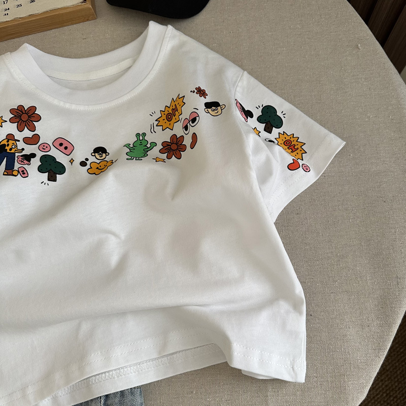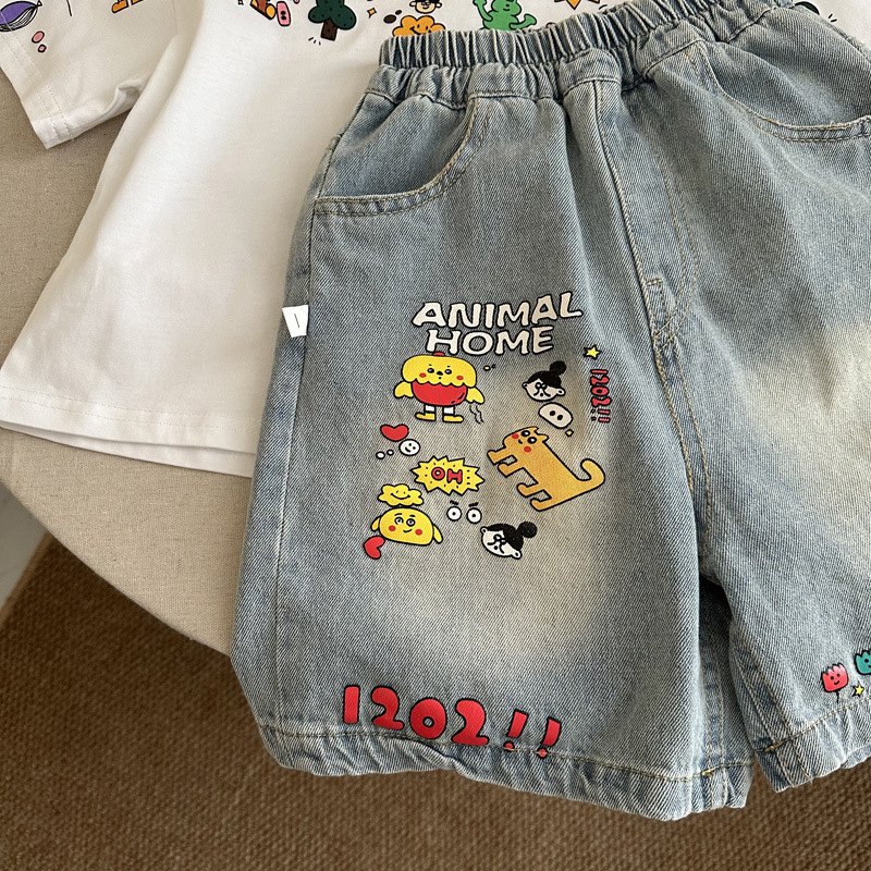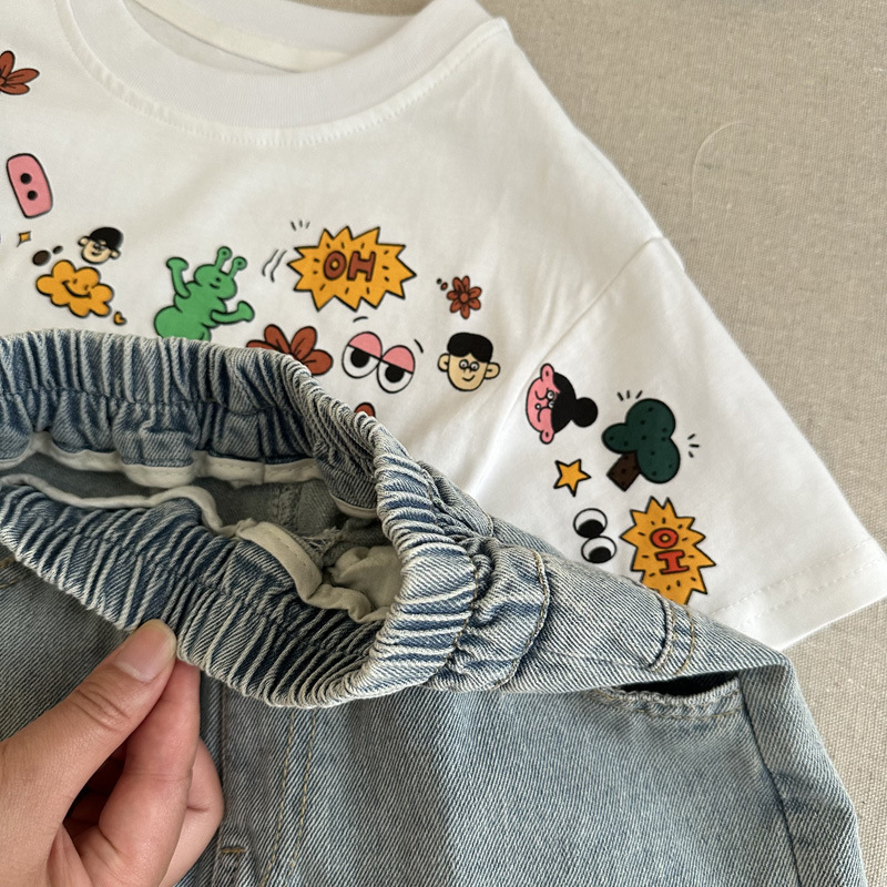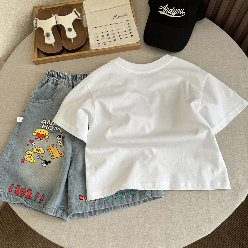 인기 있는 어린이 여름 정장 새로운 반팔 데님 바지 소년과 어린이를위한 느슨한 만화 투피스 세트스토어 가기