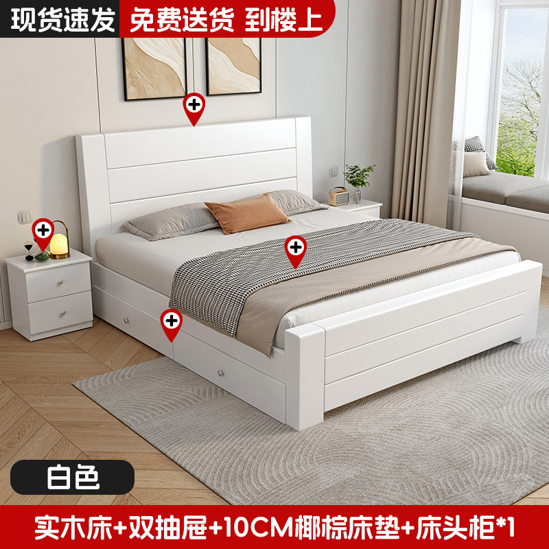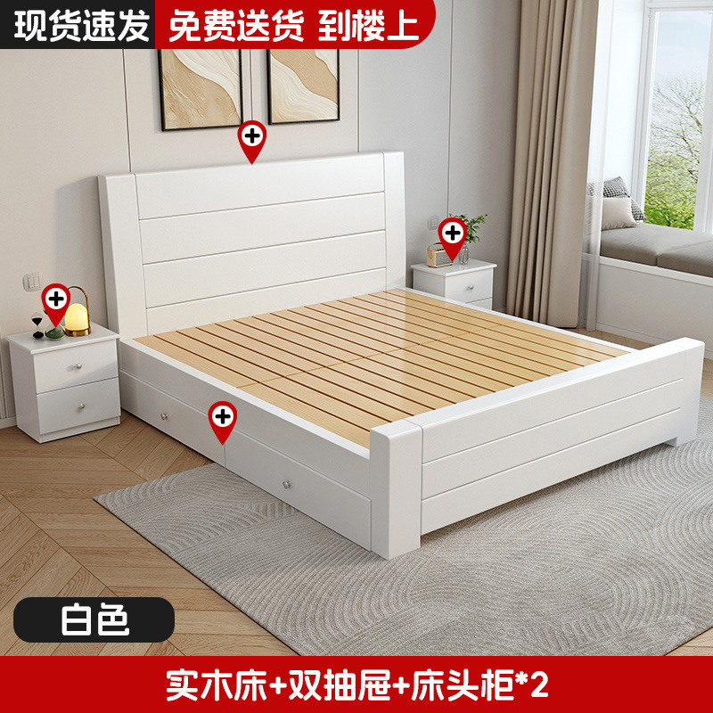 • 【따뜻한 흰색.】원목 침대 + 침대 옆 탁자 2개