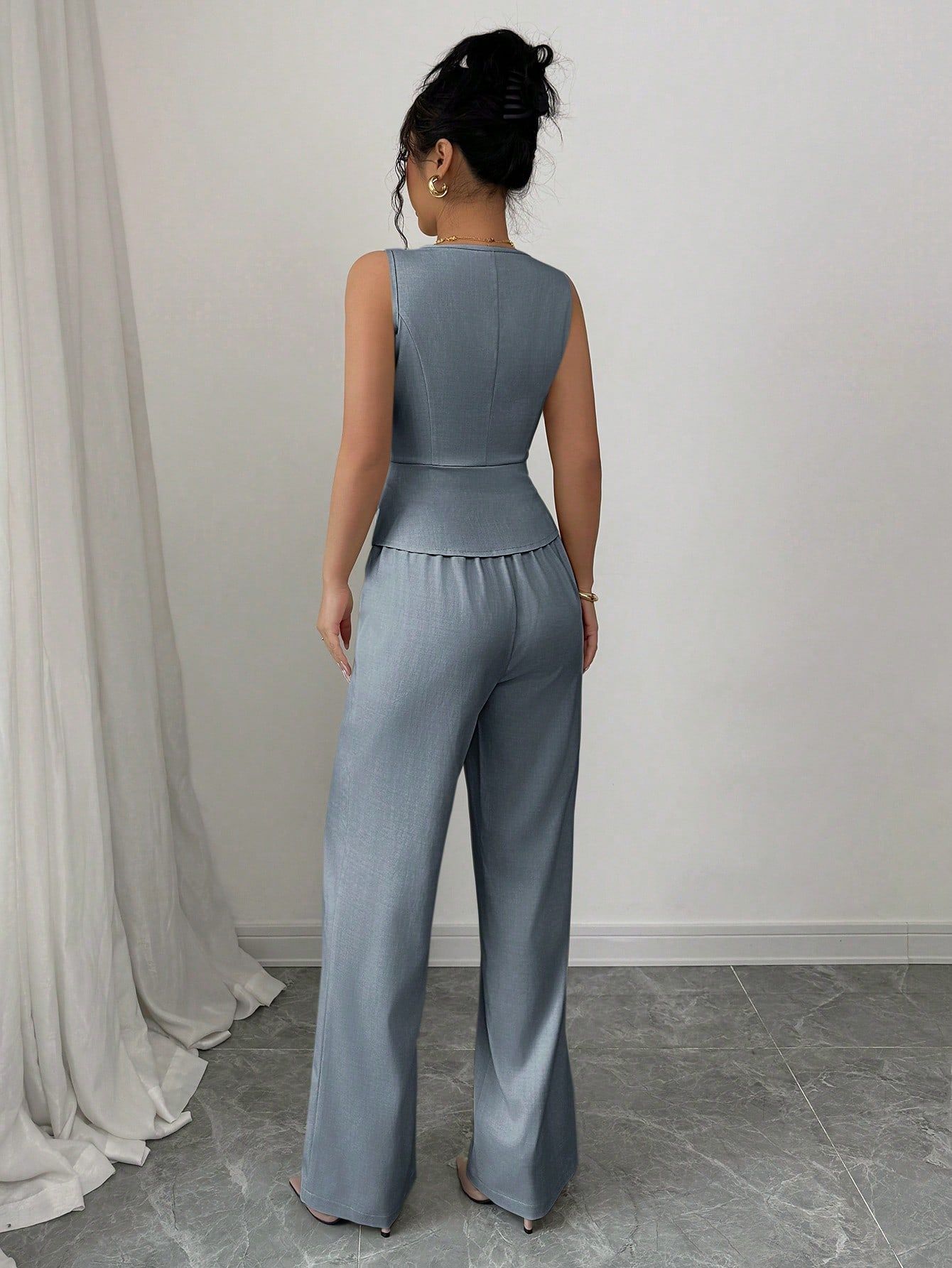 2025 여름 새로운 유럽과 미국의 아마존 국경 간 여성 솔리드 컬러 민소매 슬림 조끼 하이 웨이스트 바지 투피스 세트