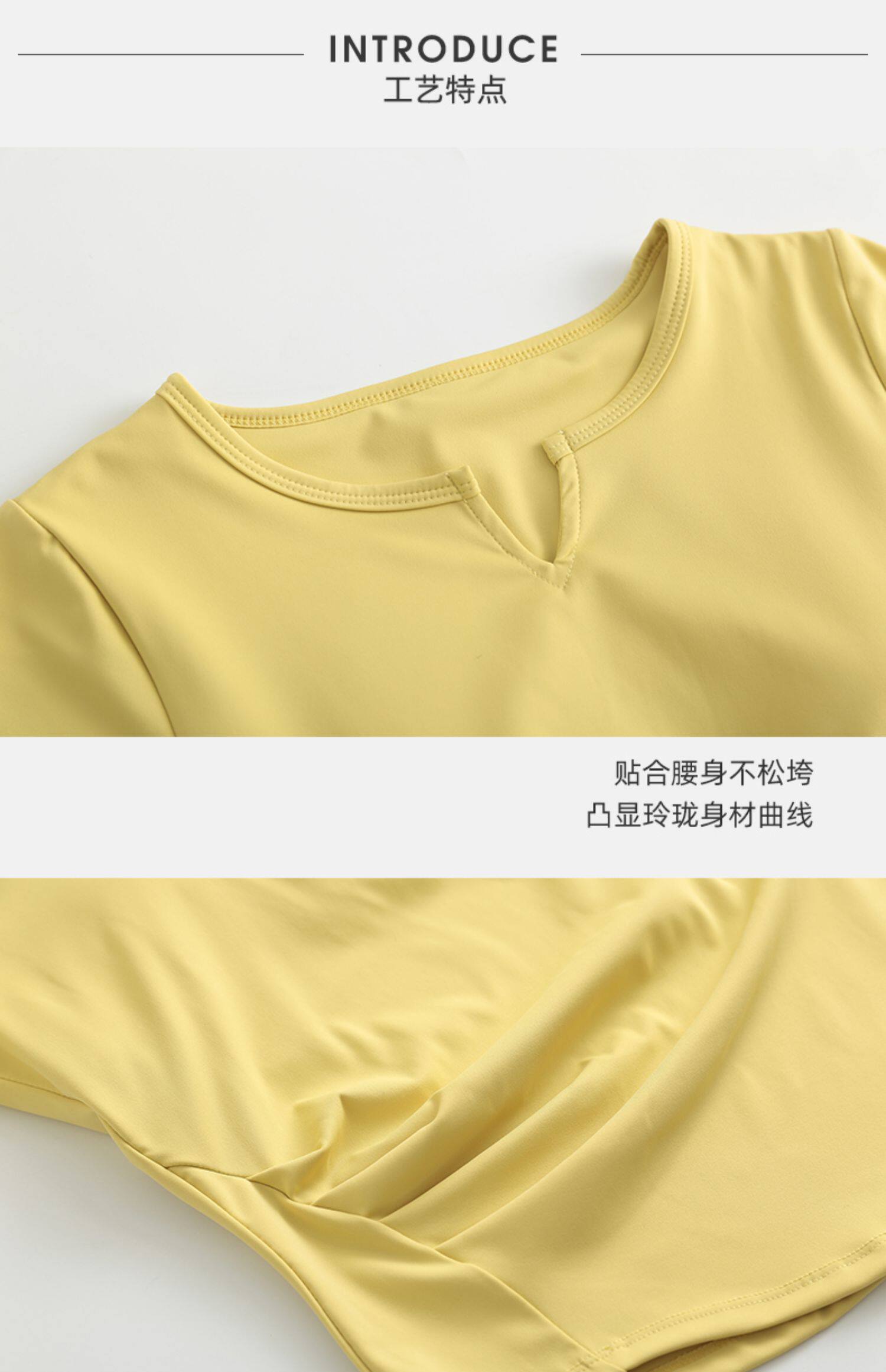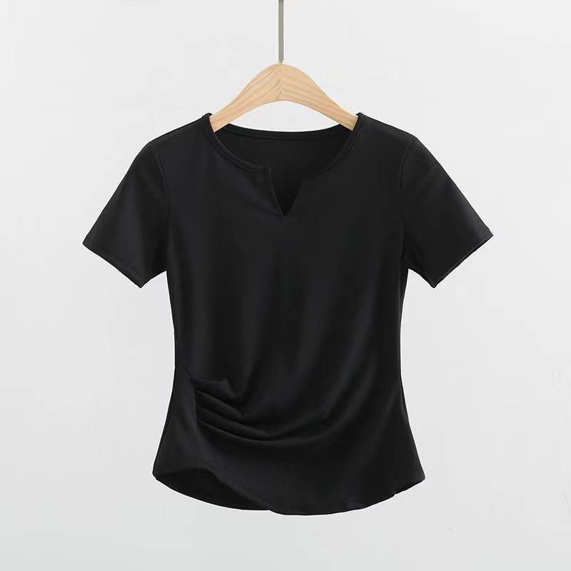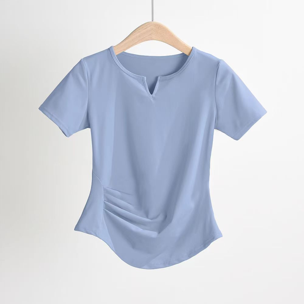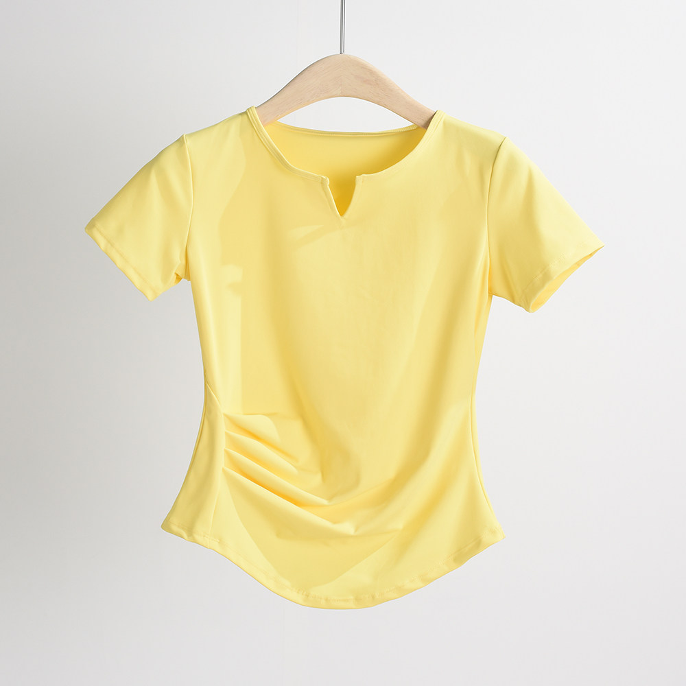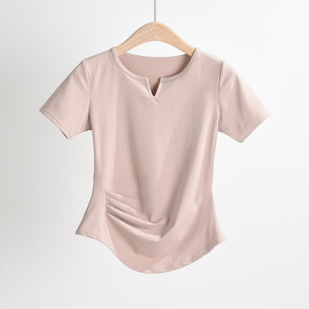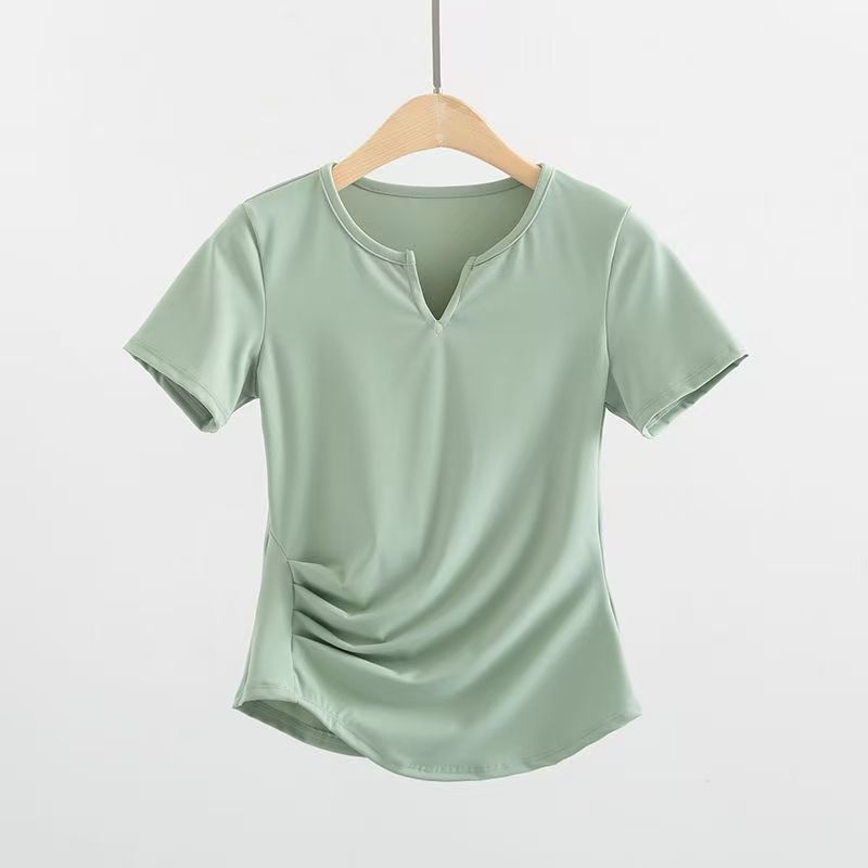 제이지펜 V넥 속건 반팔 티셔츠 주름 장식 허리 스포츠웨어 여름 러닝 피트니스 요가복 통기성 속건