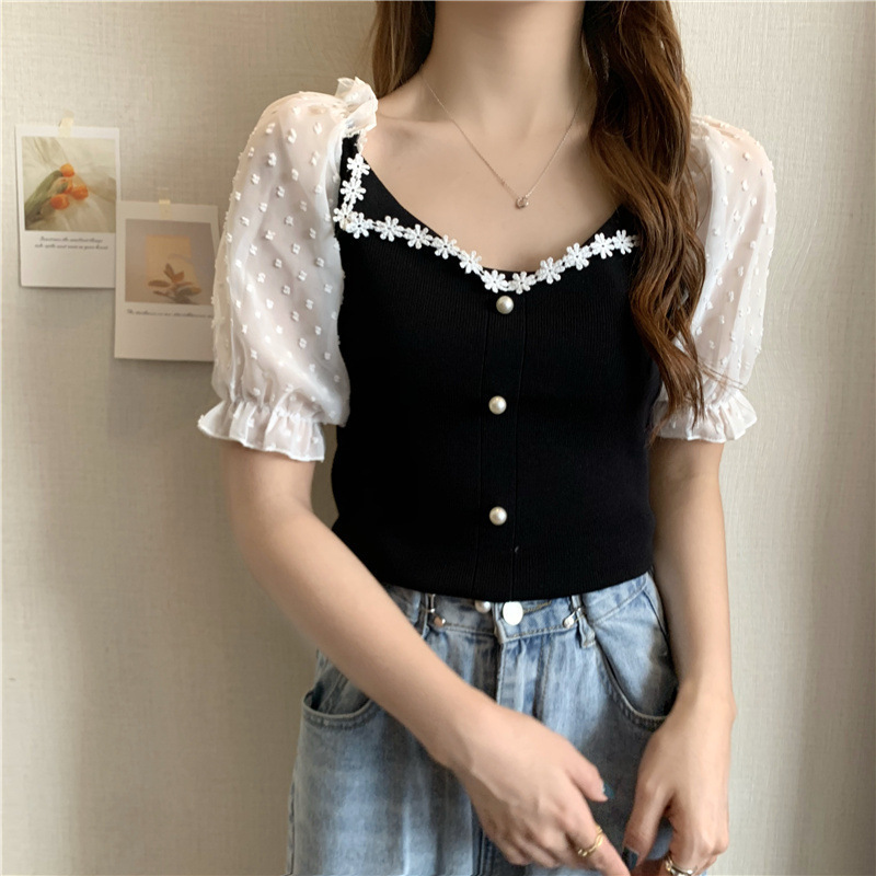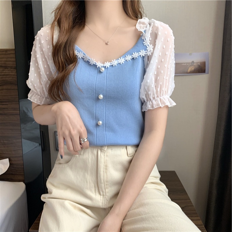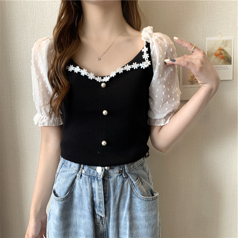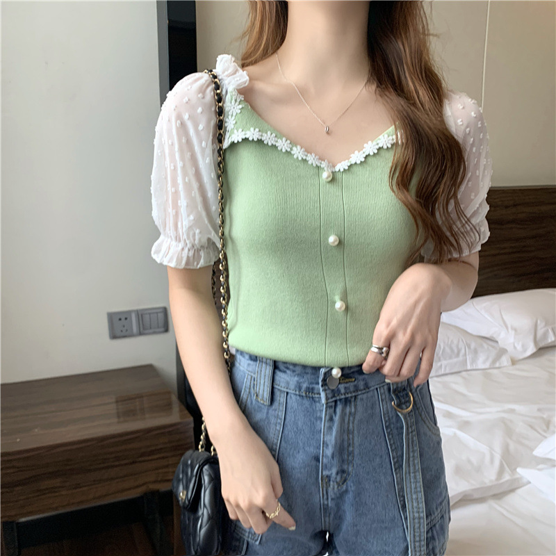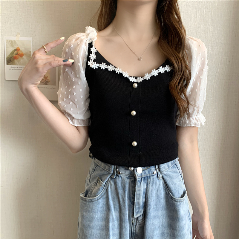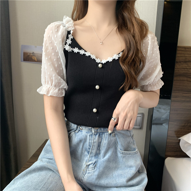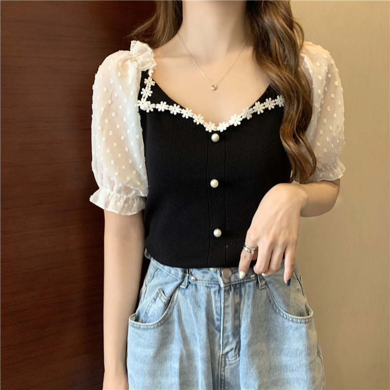 레이스 스플 라이스 퍼프 슬리브 2025 뉴 여름 스퀘어 넥 반팔 티셔츠 여성스러운 짧은 스웨터