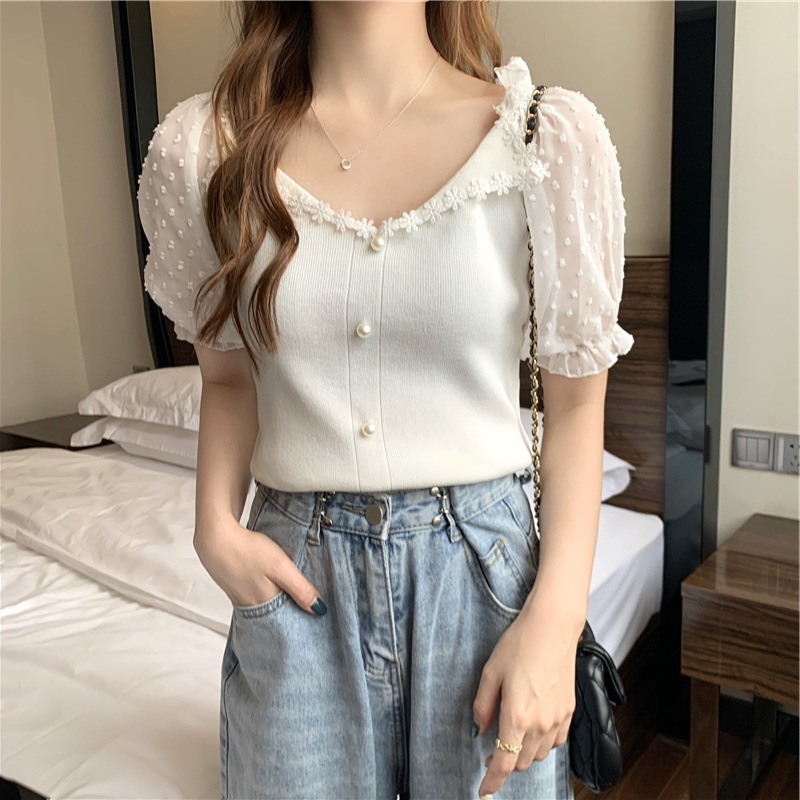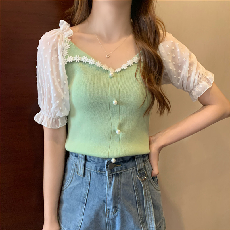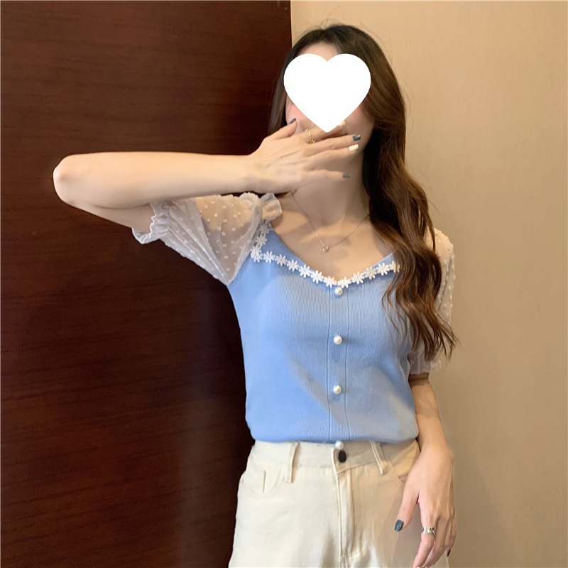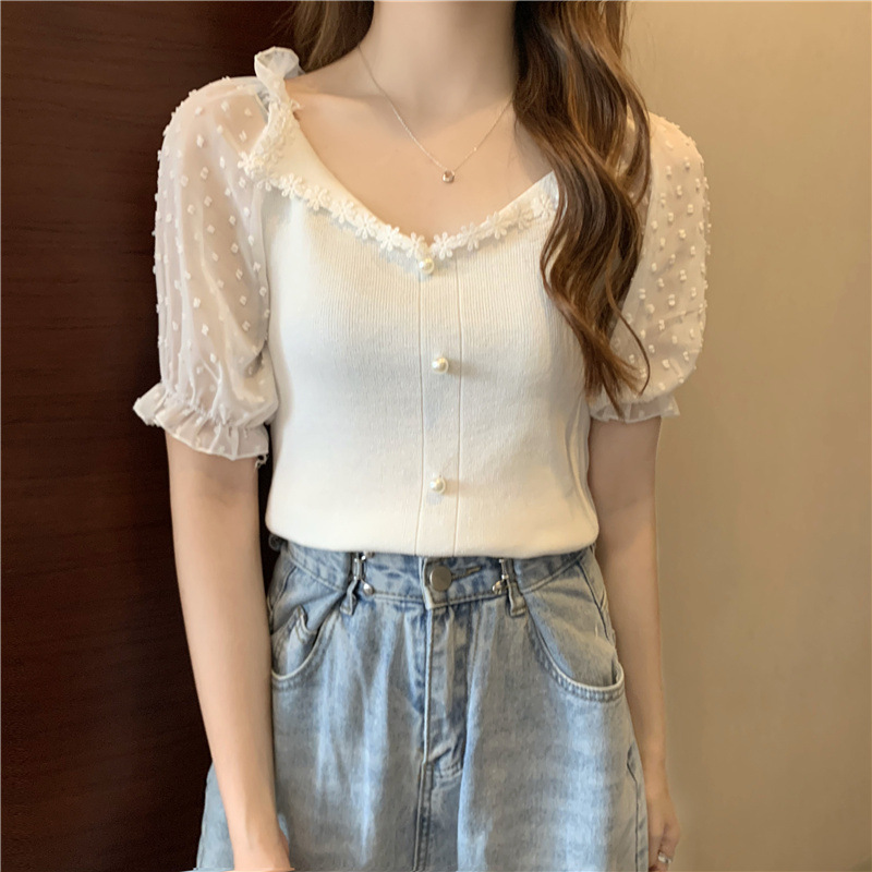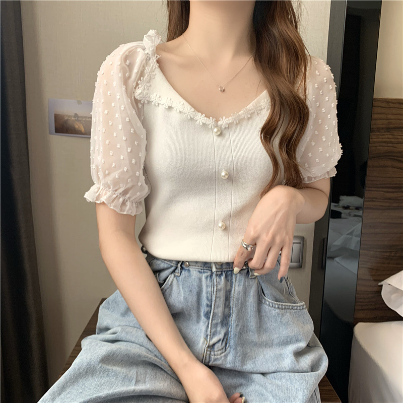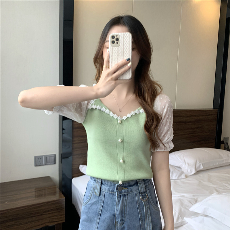 레이스 스플 라이스 퍼프 슬리브 2025 뉴 여름 스퀘어 넥 반팔 티셔츠 여성스러운 짧은 스웨터