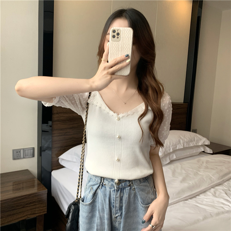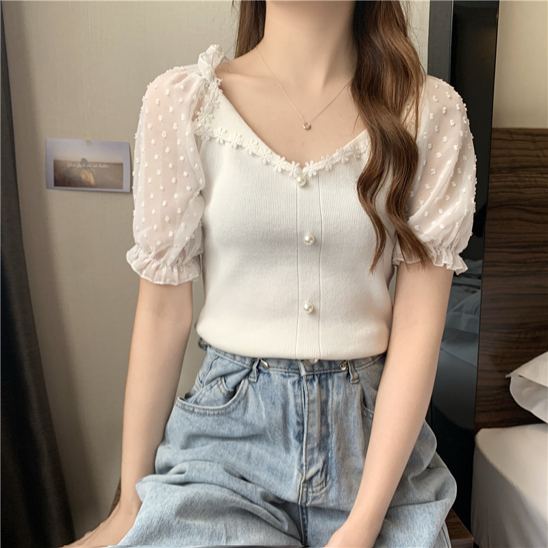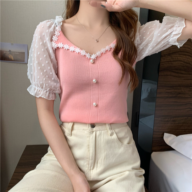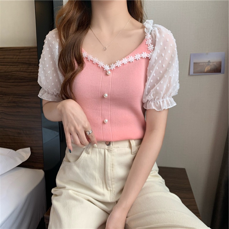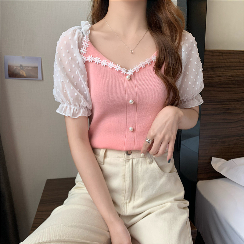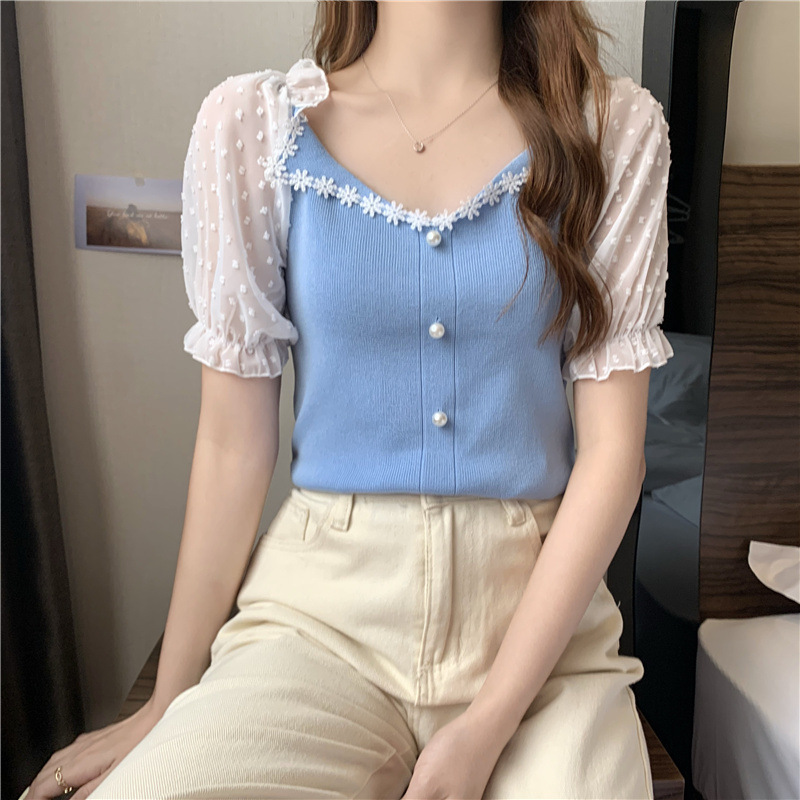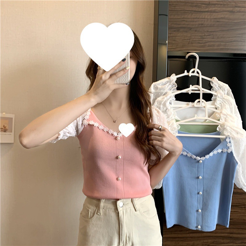 레이스 스플 라이스 퍼프 슬리브 2025 뉴 여름 스퀘어 넥 반팔 티셔츠 여성스러운 짧은 스웨터
