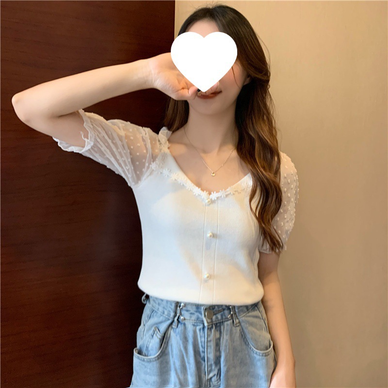 레이스 스플 라이스 퍼프 슬리브 2025 뉴 여름 스퀘어 넥 반팔 티셔츠 여성스러운 짧은 스웨터스토어 가기