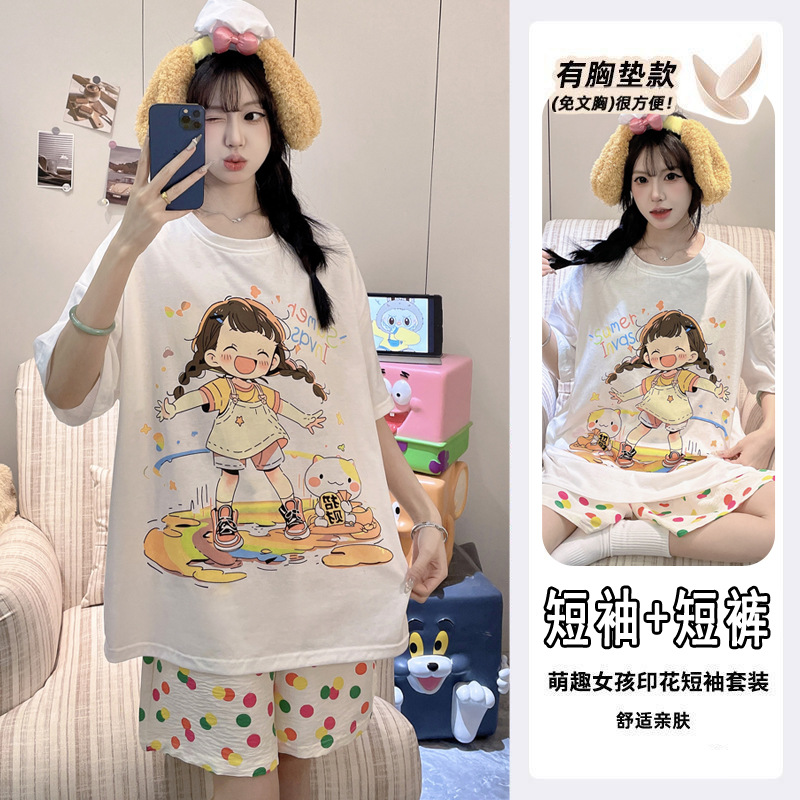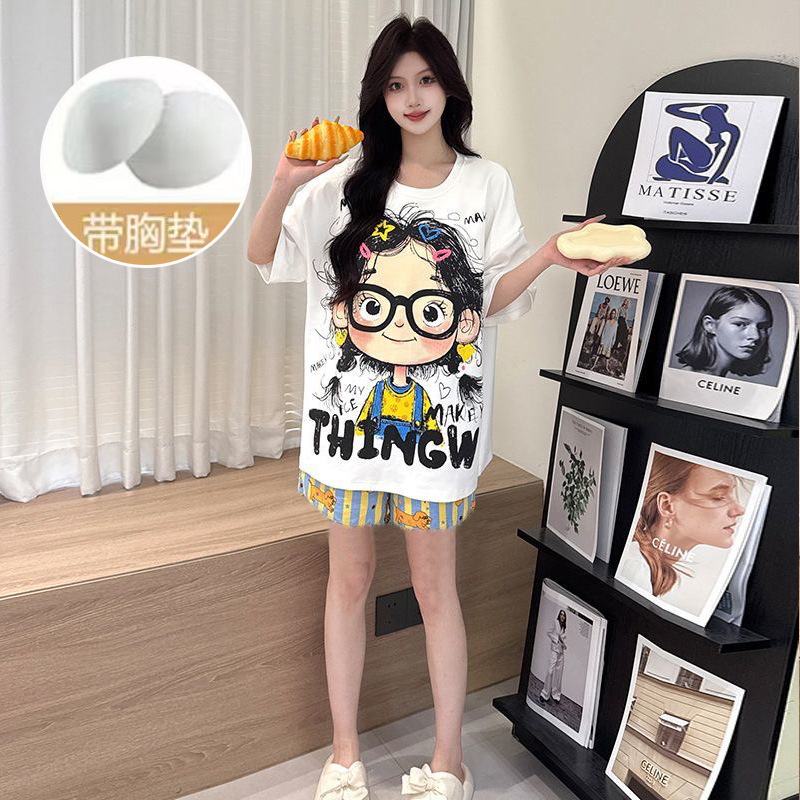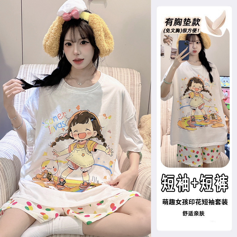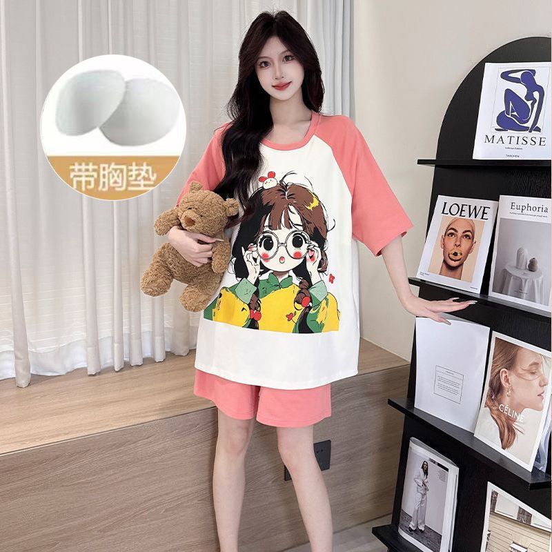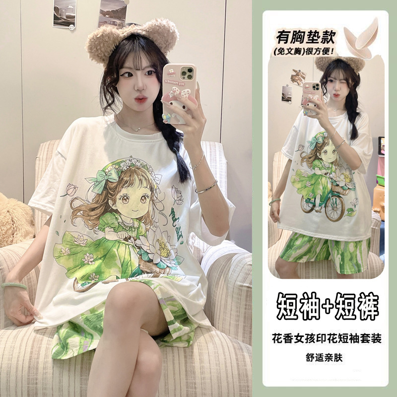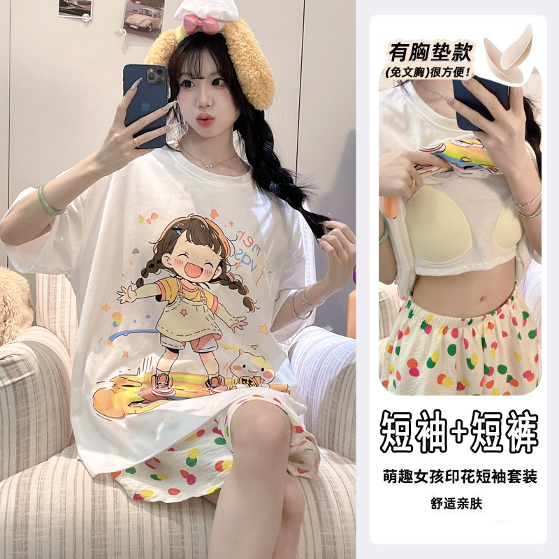 2025 여성을위한 유방 패드가있는 잠옷 여름 반팔 반바지 달콤한 만화 소녀 한국어 버전 인쇄 된 가정 의류 세트