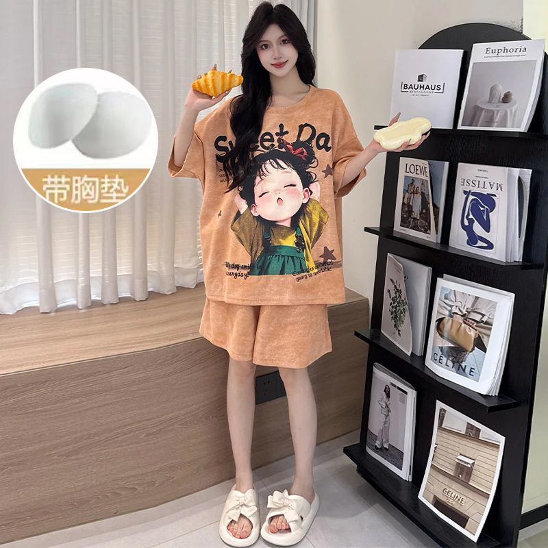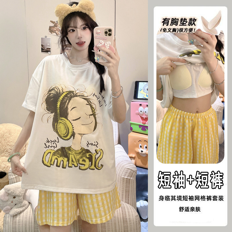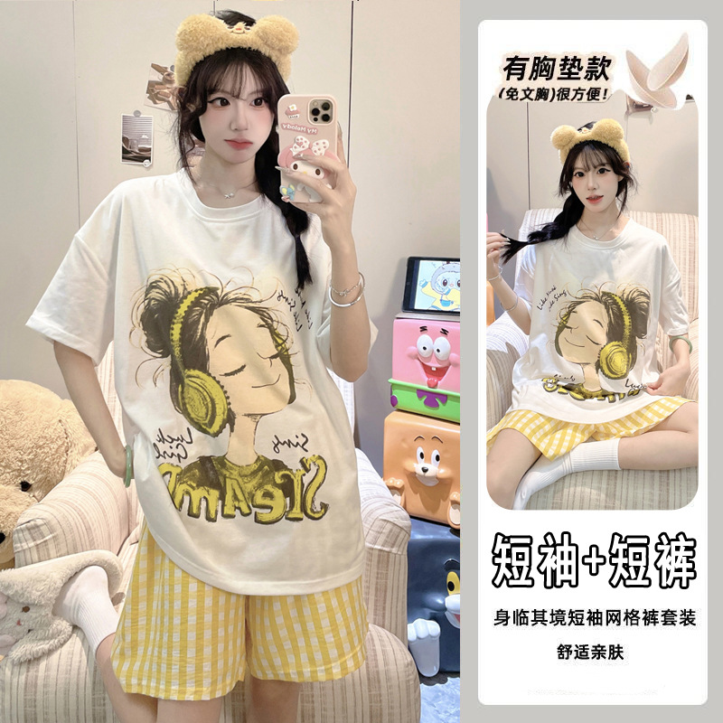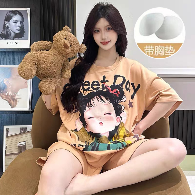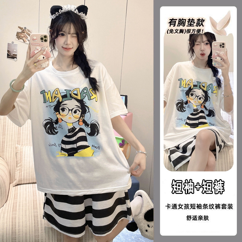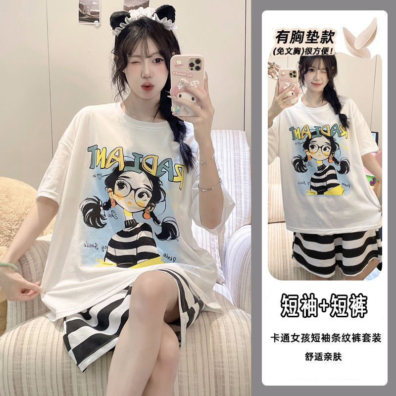 2025 여성을위한 유방 패드가있는 잠옷 여름 반팔 반바지 달콤한 만화 소녀 한국어 버전 인쇄 된 가정 의류 세트