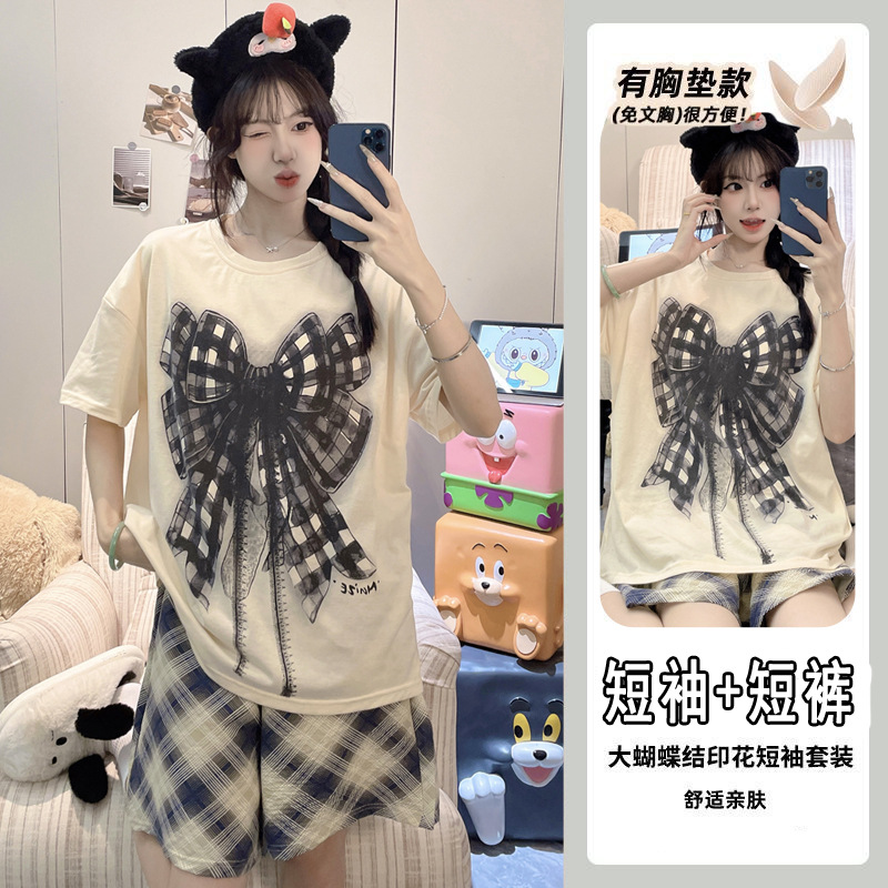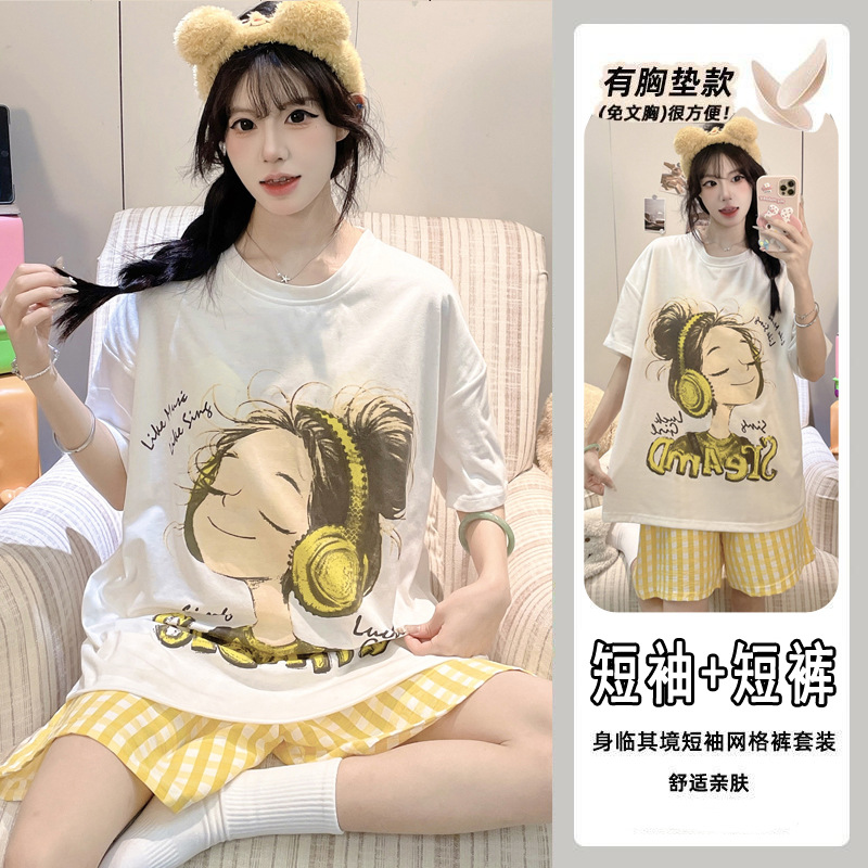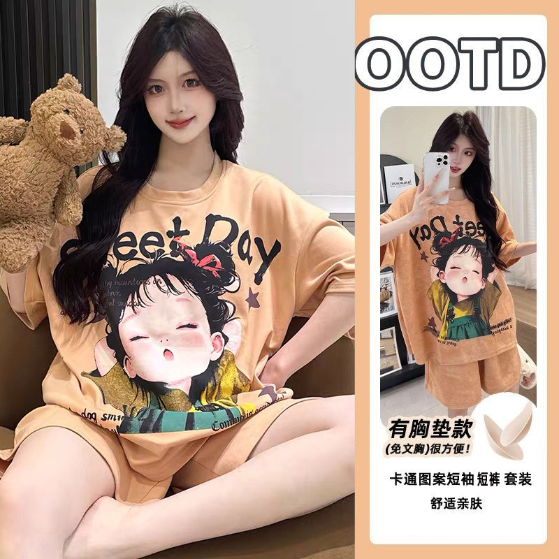 2025 여성을위한 유방 패드가있는 잠옷 여름 반팔 반바지 달콤한 만화 소녀 한국어 버전 인쇄 된 가정 의류 세트스토어 가기