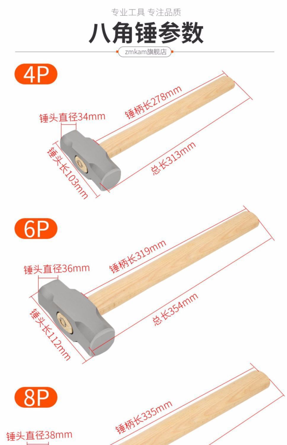 철망치, 팔각형 망치, 사각머리, 나무 손잡이, 중량 벽 파괴 망치, 석공 건설 현장용 망치, 도구 배송스토어 가기