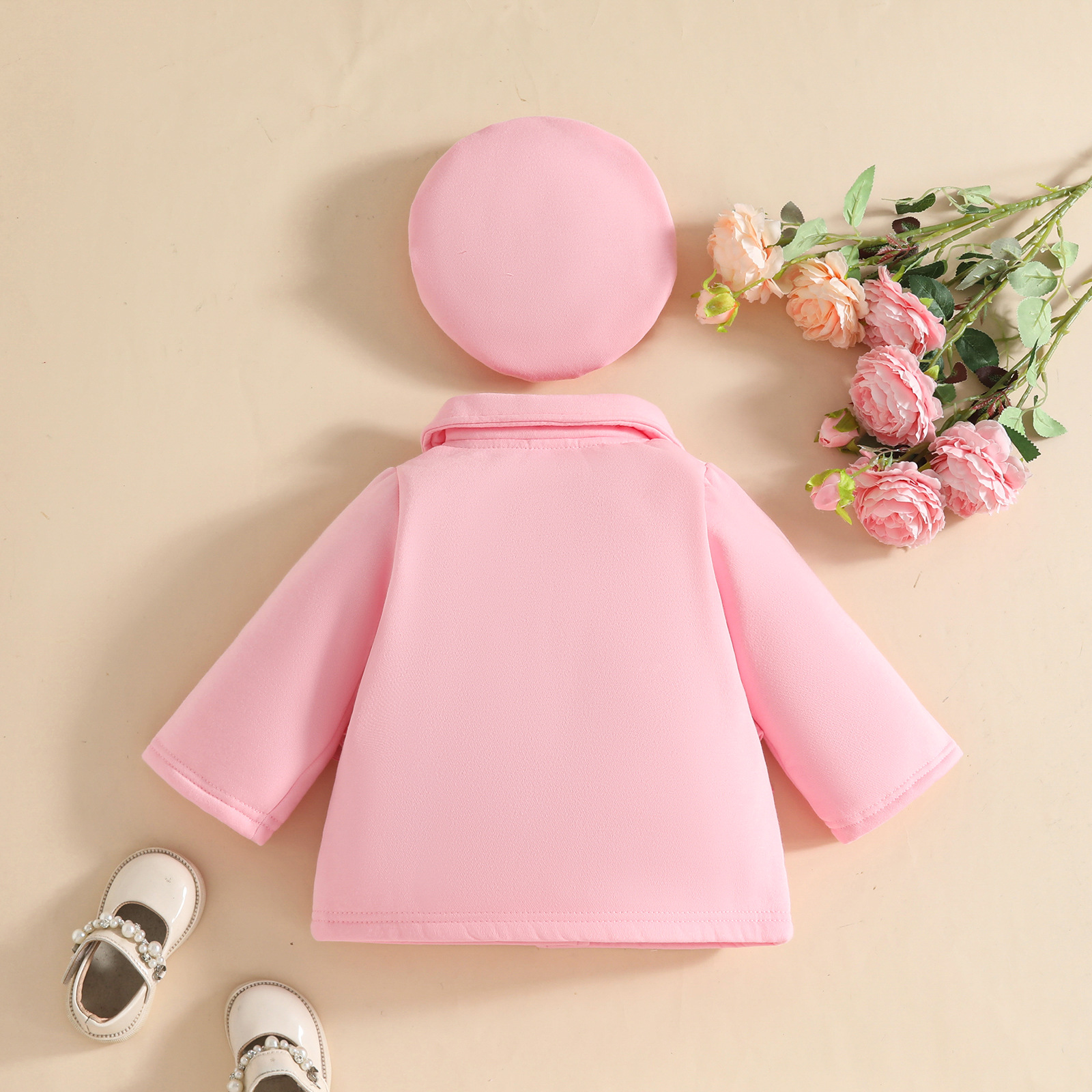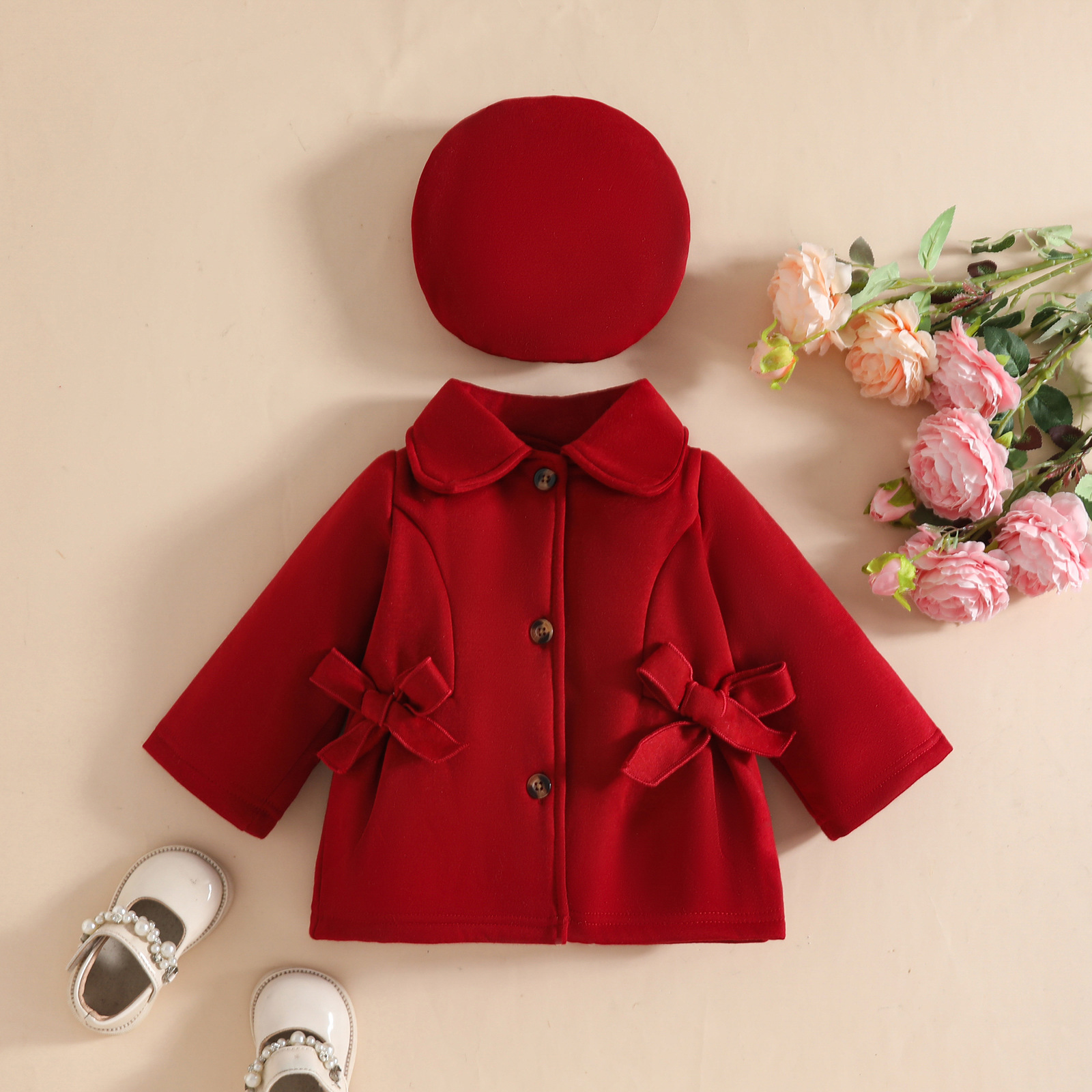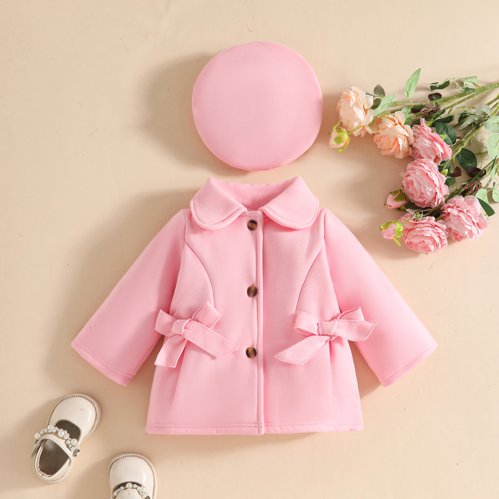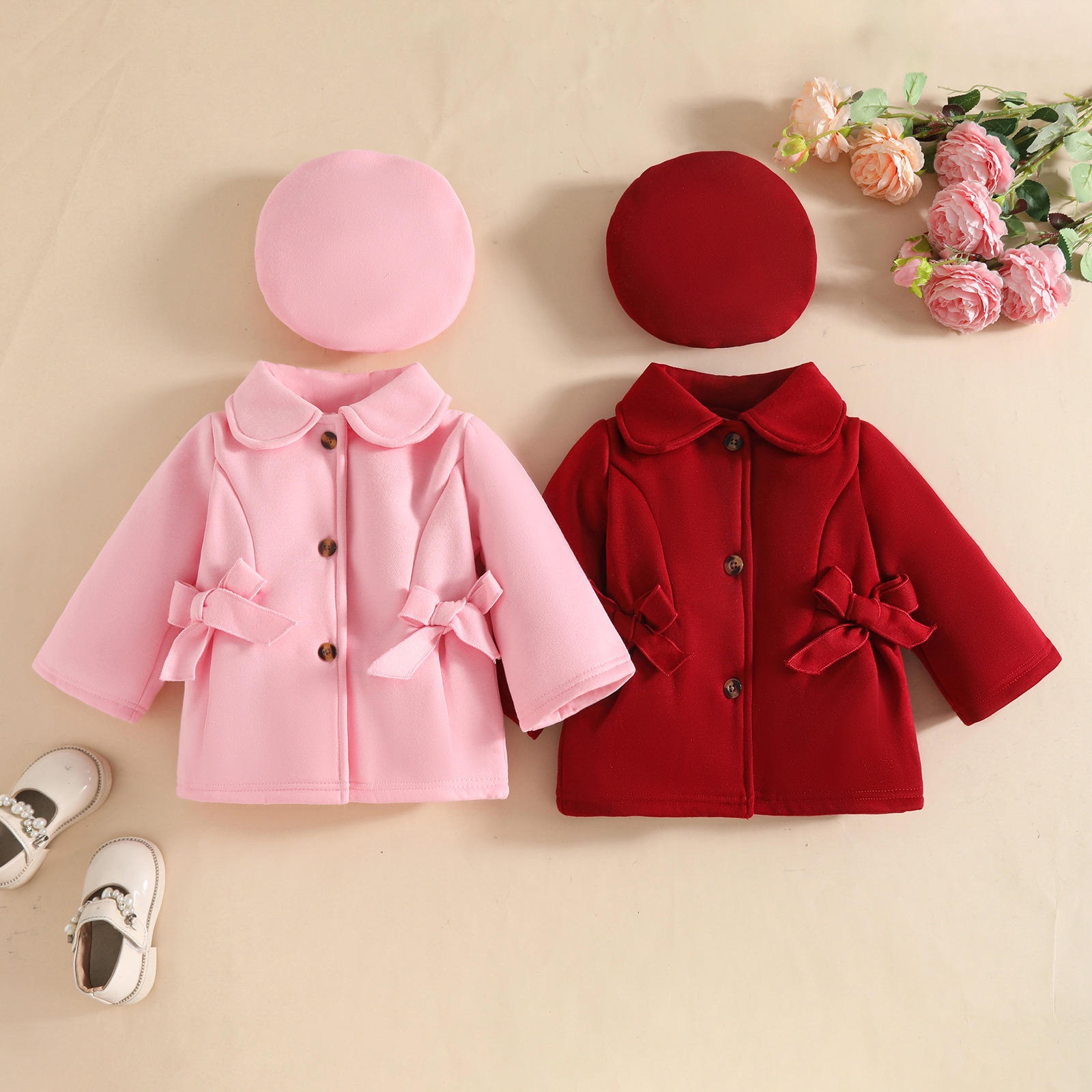 가을 겨울 여아용 카라 달린 단색 리본 장식 긴팔 코트+베레모 세트 도매
