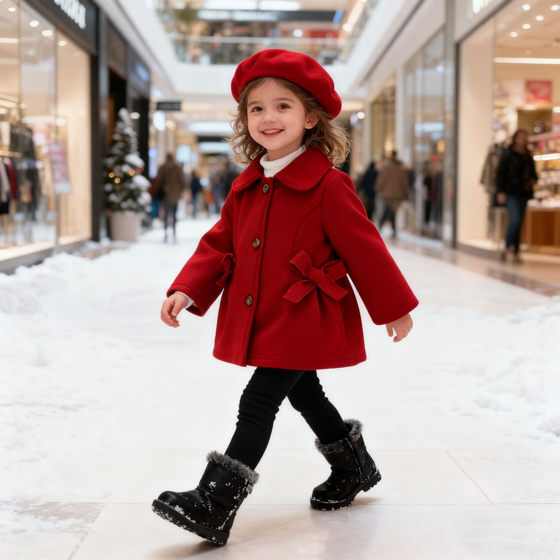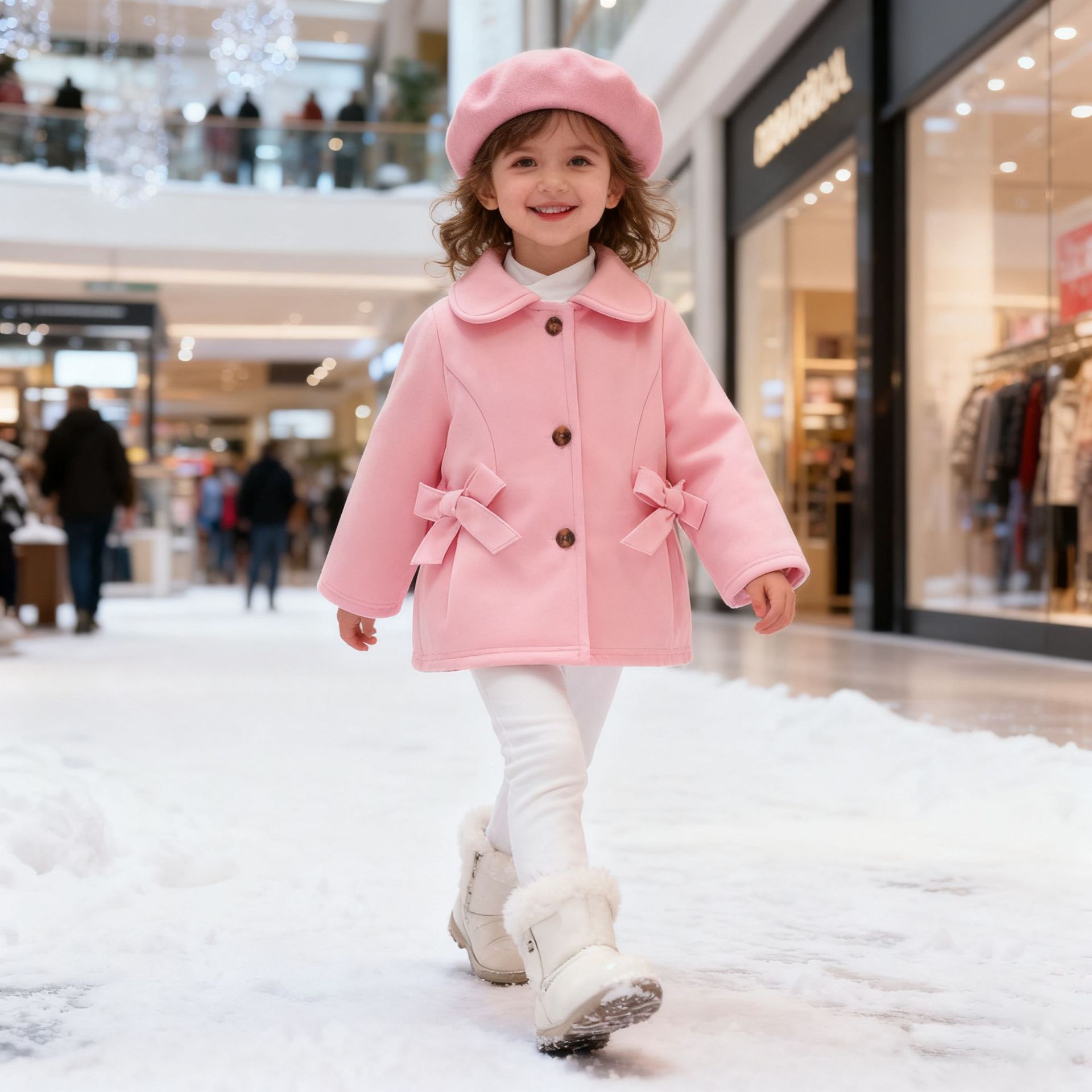 가을 겨울 여아용 카라 달린 단색 리본 장식 긴팔 코트+베레모 세트 도매스토어 가기