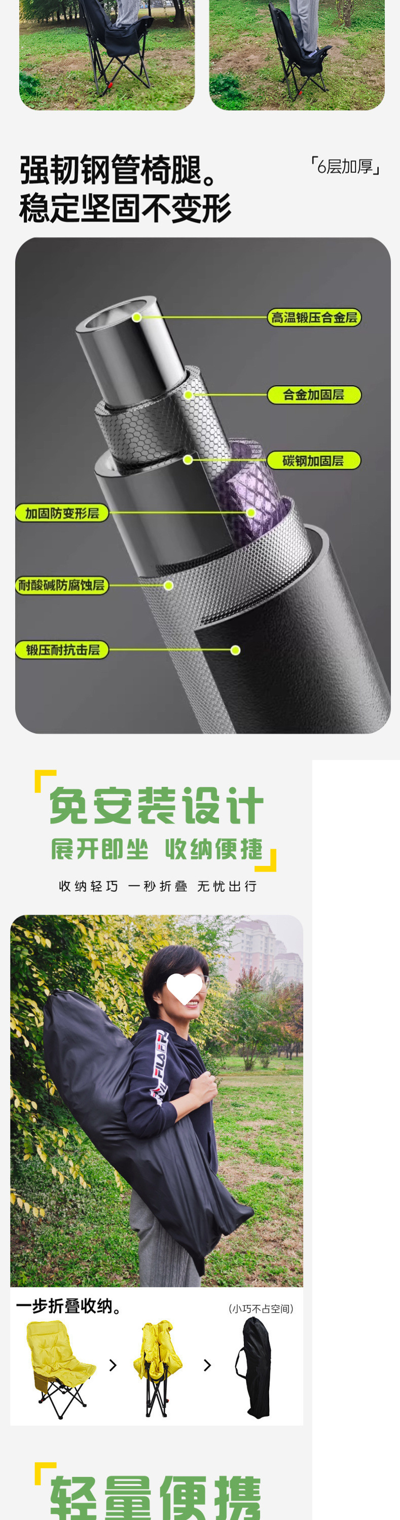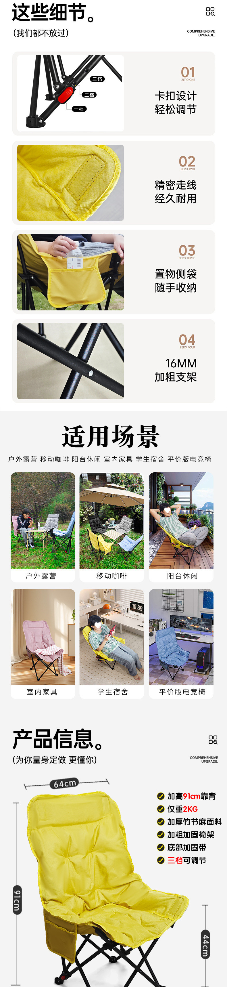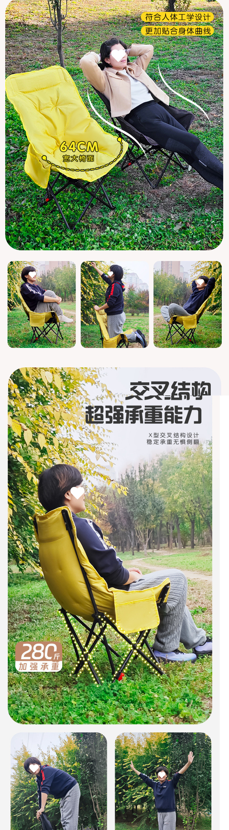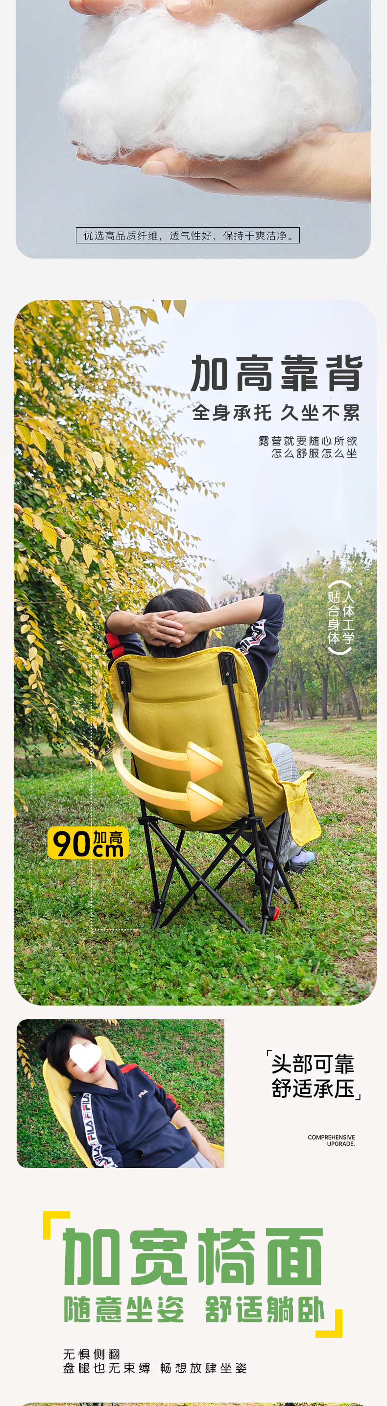 3단 조절 가능/면 접이식 게으른 달 의자 캠핑 휴대용 높은 등받이 피크닉 의자 낚시 야외
