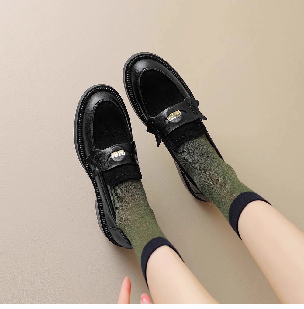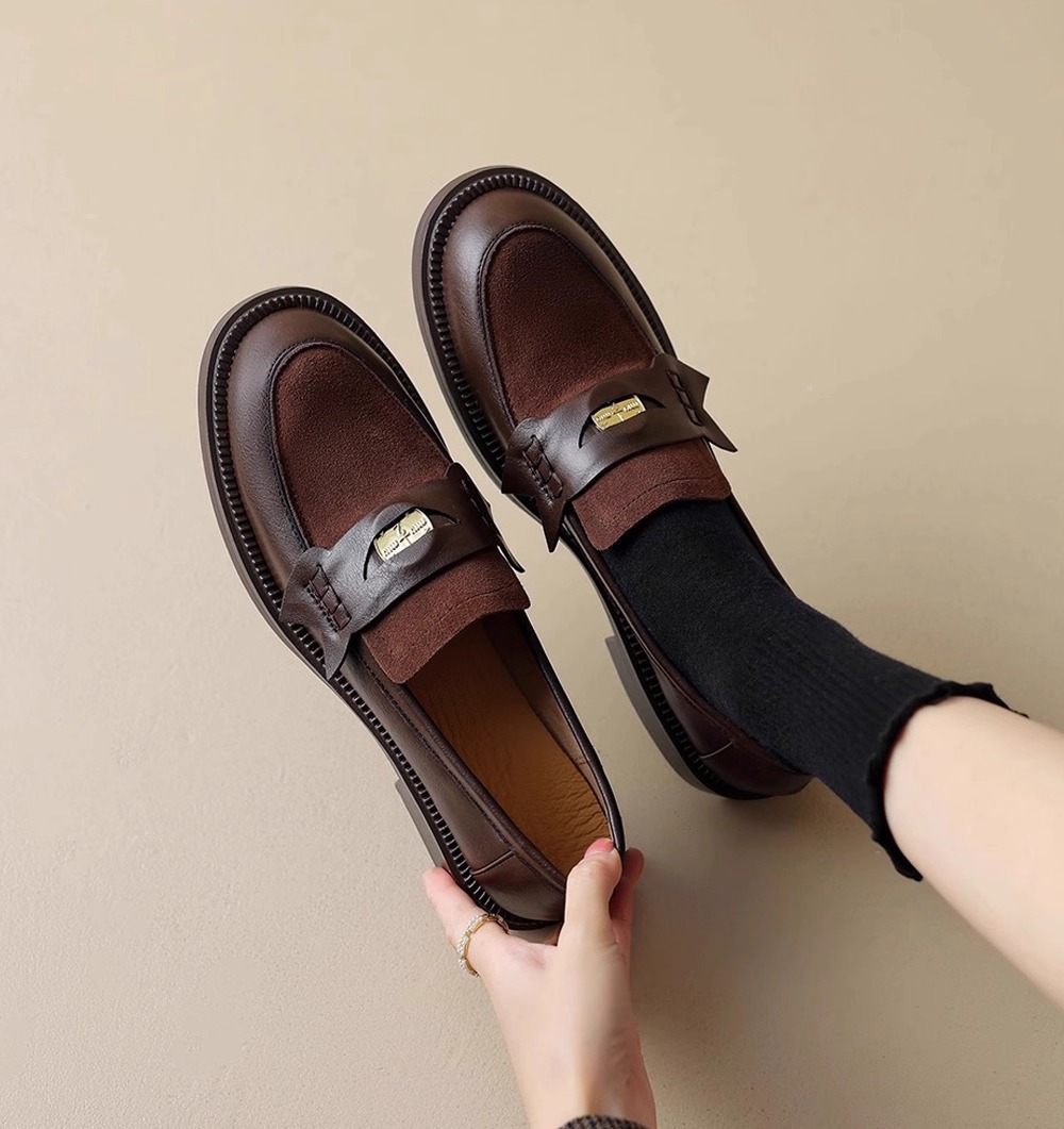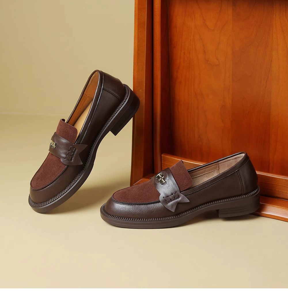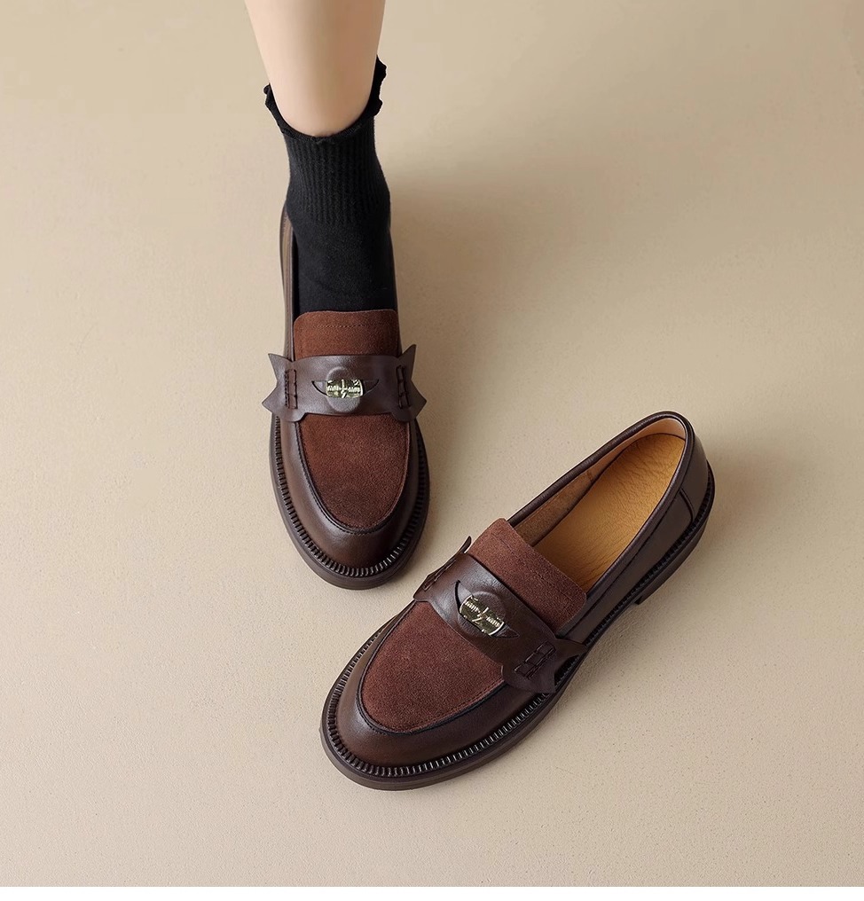 재고 있음 ~ 천연 가죽 브라운 로퍼 미드힐 싱글 슈즈 2025 신작 유럽 영국 스타일 두꺼운 굽 다용도 소형 가죽 신발스토어 가기