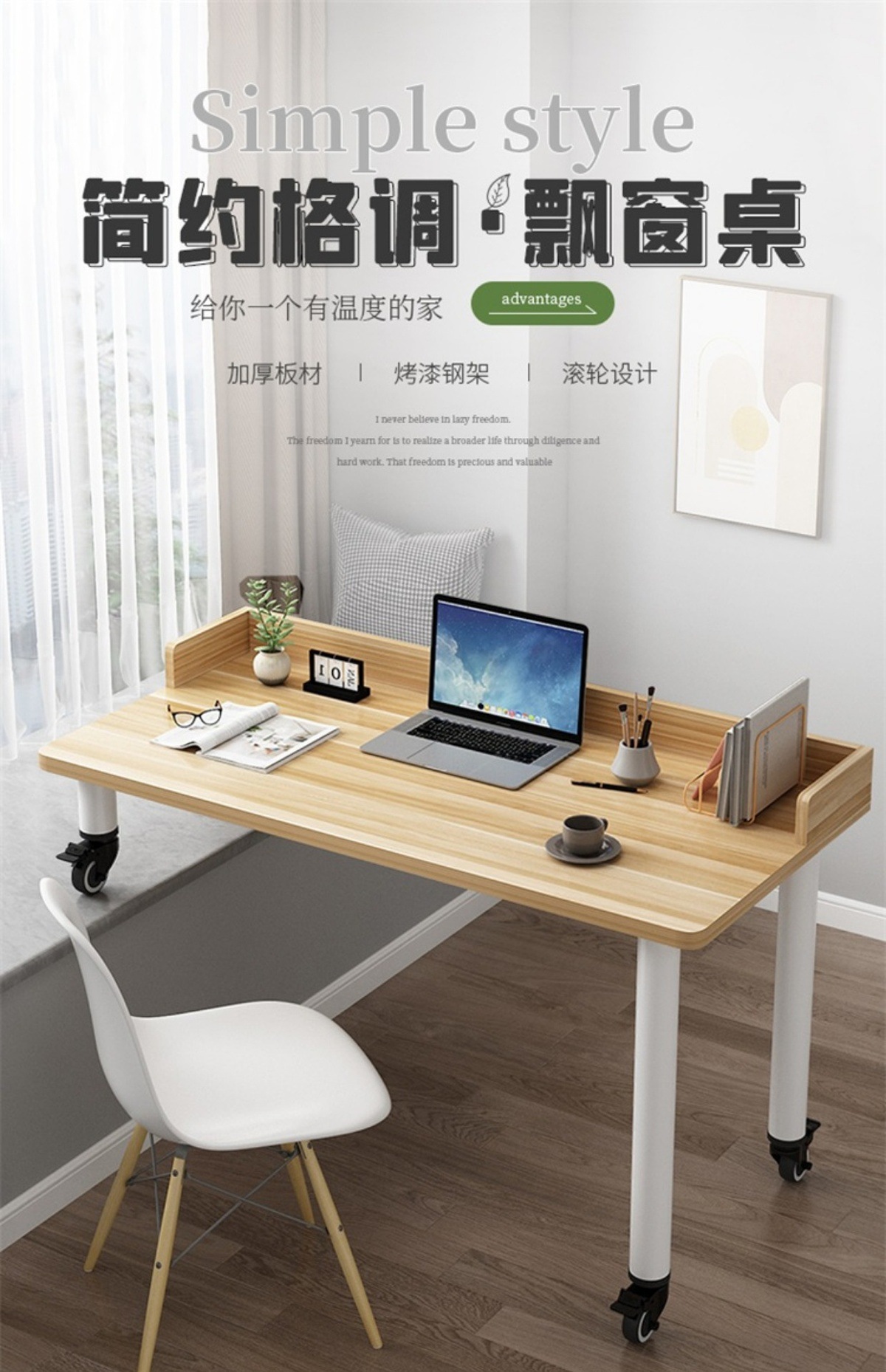 • 라이트 월넛 테이블 상판 + 흰색 다리, 브레이크가 있는 저소음 범용 휠