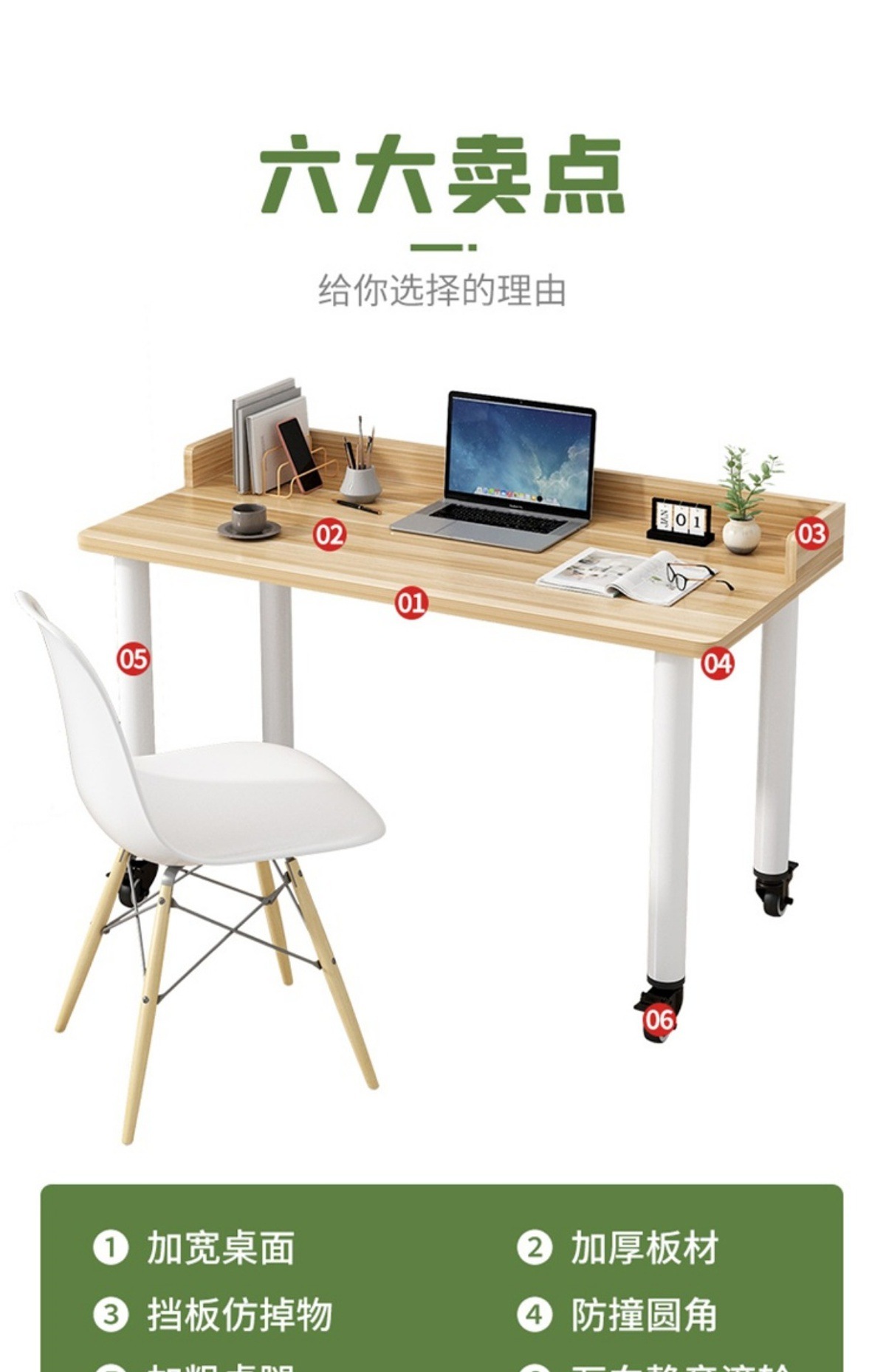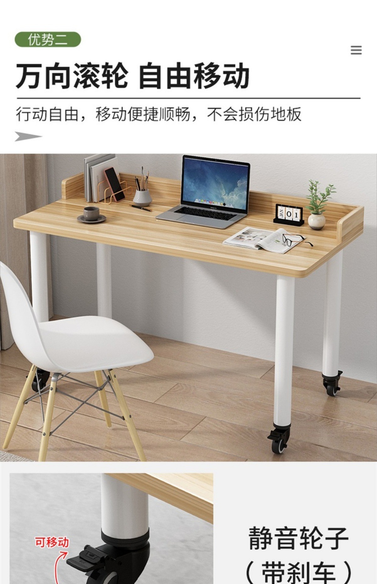• 흰색 테이블 상판 + 흰색 다리, 브레이크가 있는 조용한 범용 바퀴