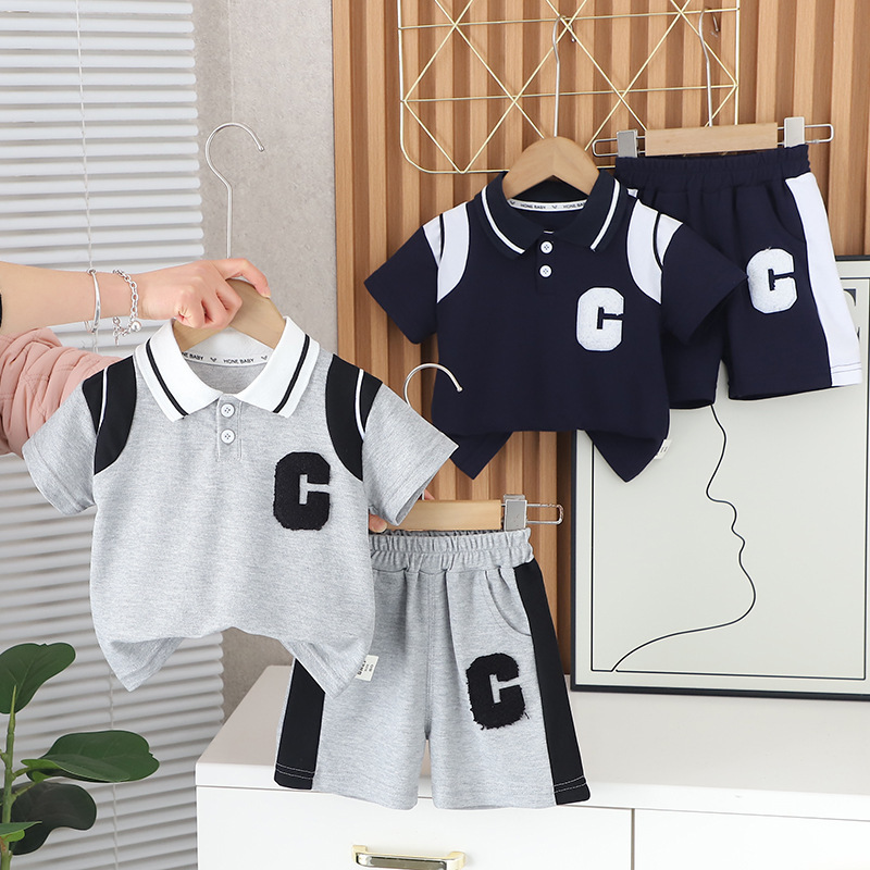 2025 새로운 유행 소년 여름 옷 아기 소년 얇은 편지 폴로 셔츠 반팔 반바지 투피스 세트 크로스 보더
