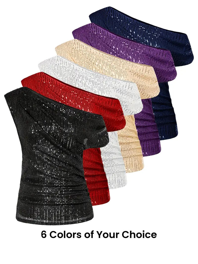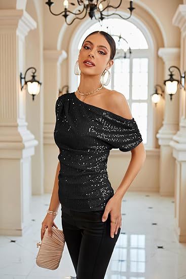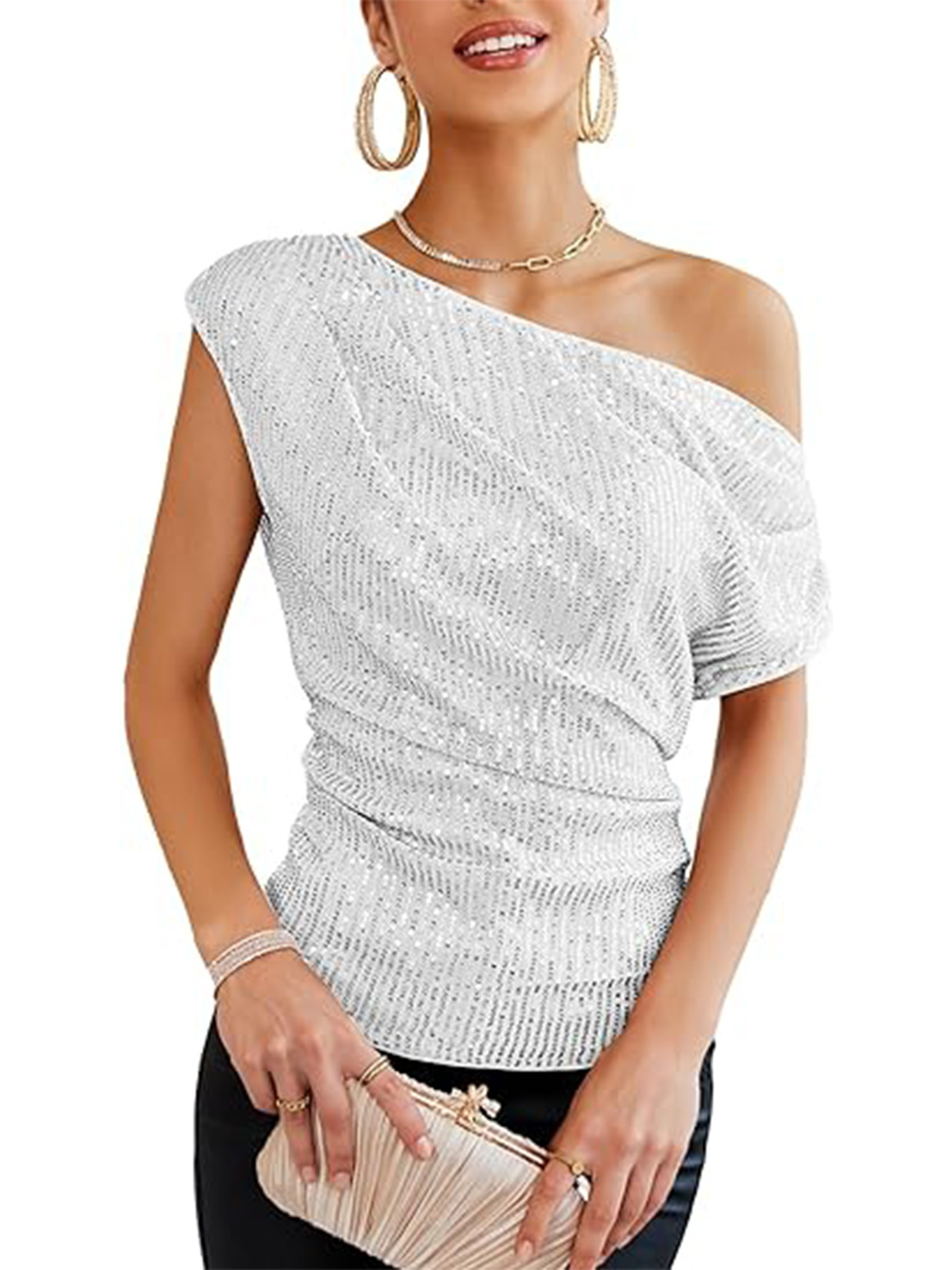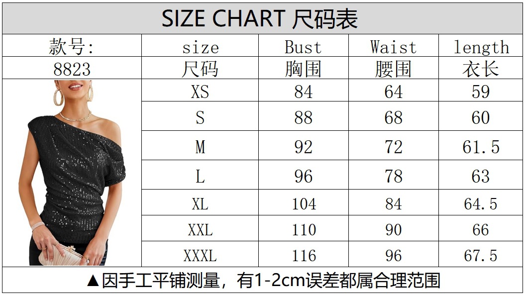 크로스보더 슬로프 숄더 스팽글 우아한 반팔 플리츠 원 숄더 슬림 패션 여성 티셔츠스토어 가기