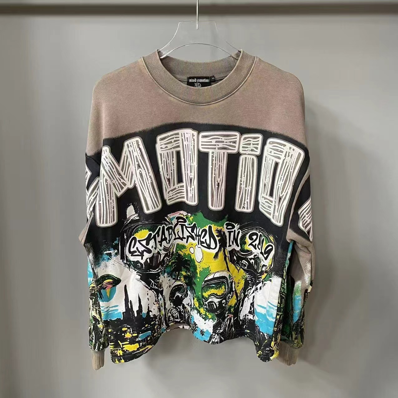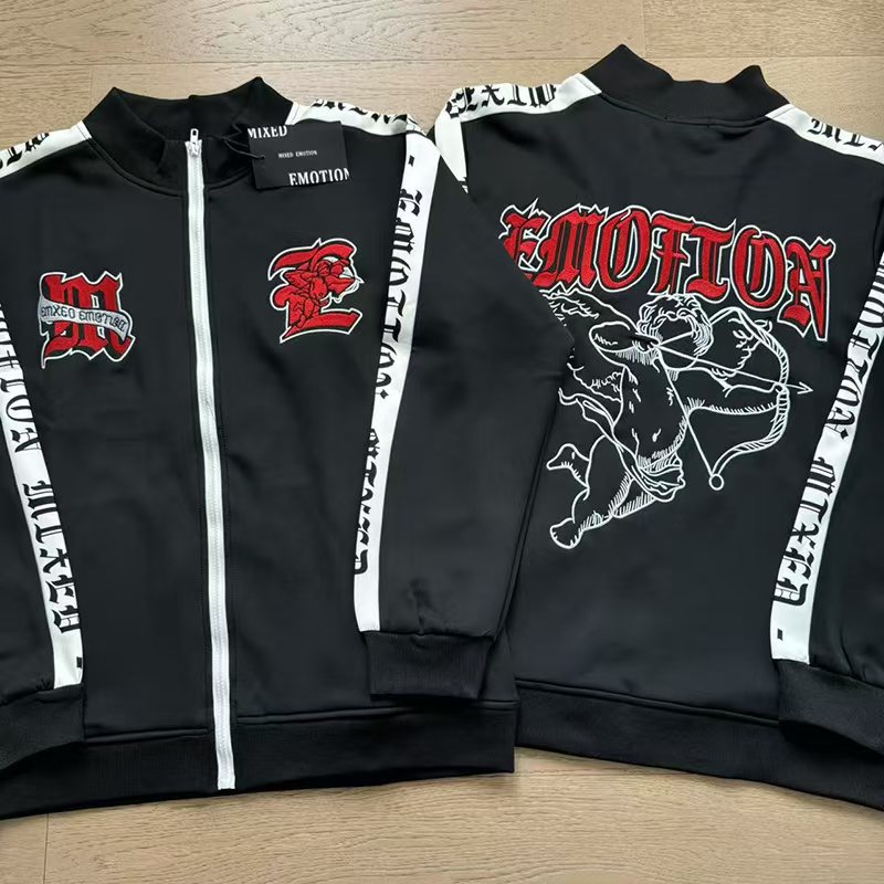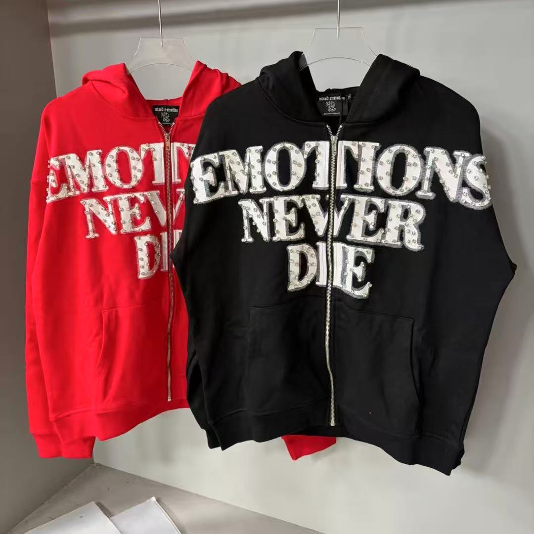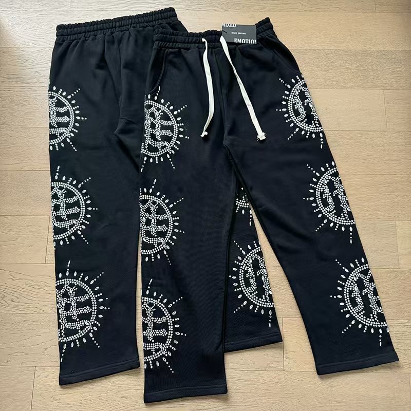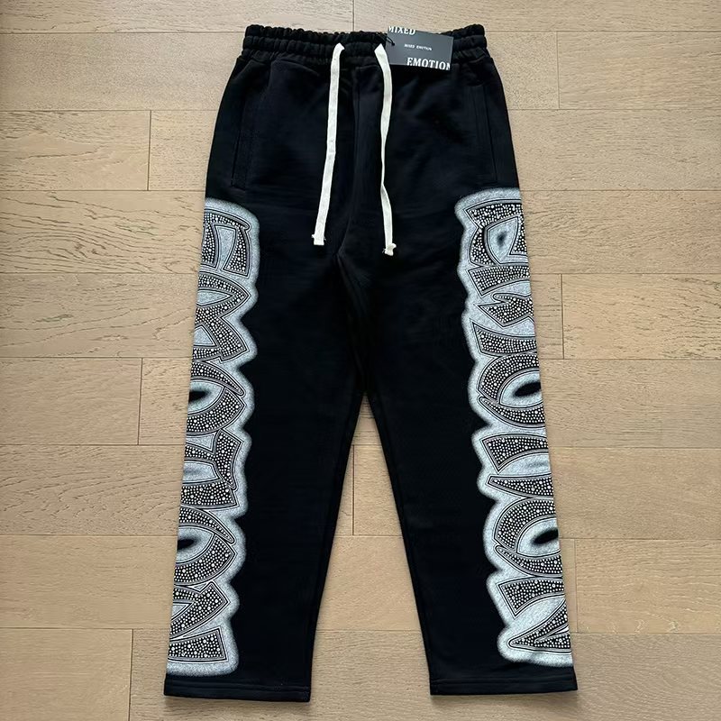 트렌디 브랜드 MIXED EMOTION 신상 레터 자수 큐빅 장식 캐주얼 바지 루즈핏 후드티 남성용스토어 가기