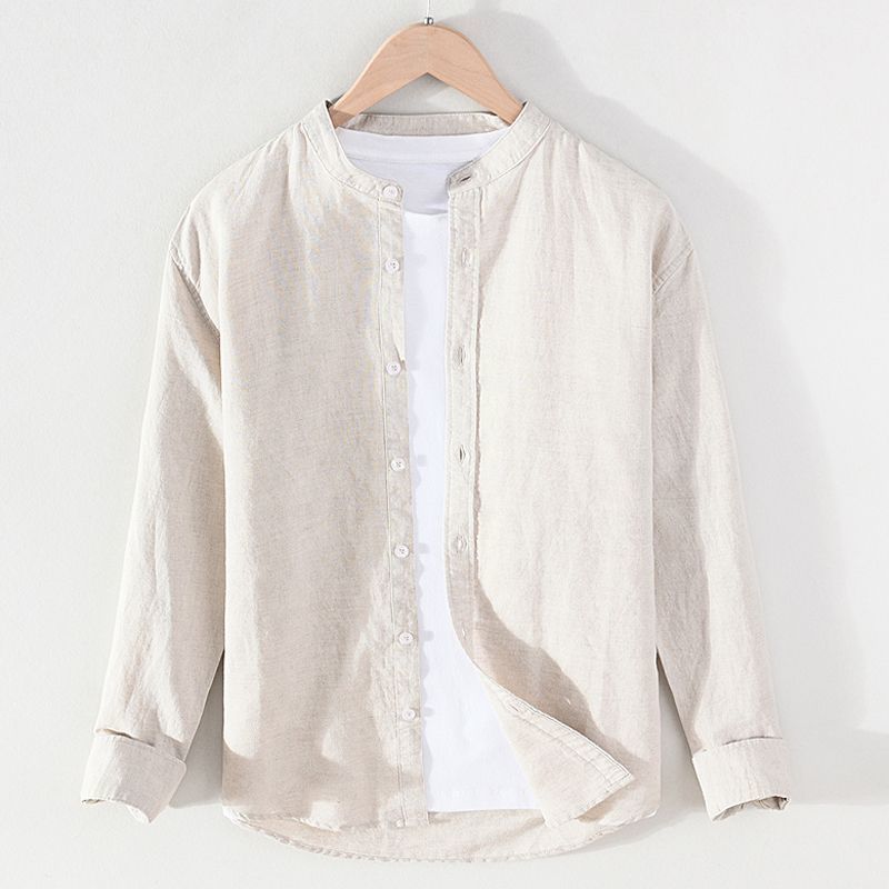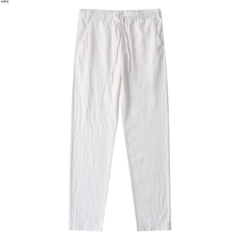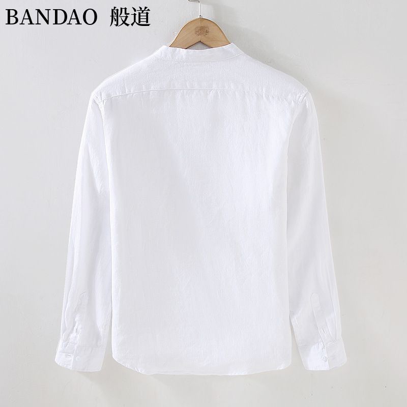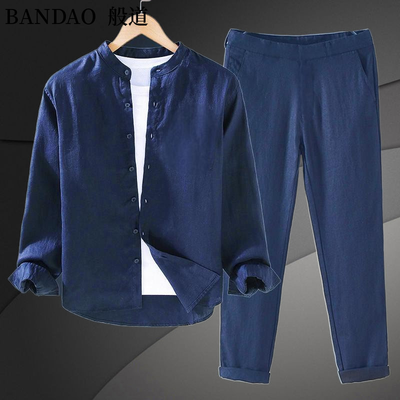 흰색 긴팔 셔츠 정장 남성 바지 여름 느슨한 통기성 면 및 린넨 중국 스탠드 칼라 셔츠 남성 스트레이트 바지스토어 가기