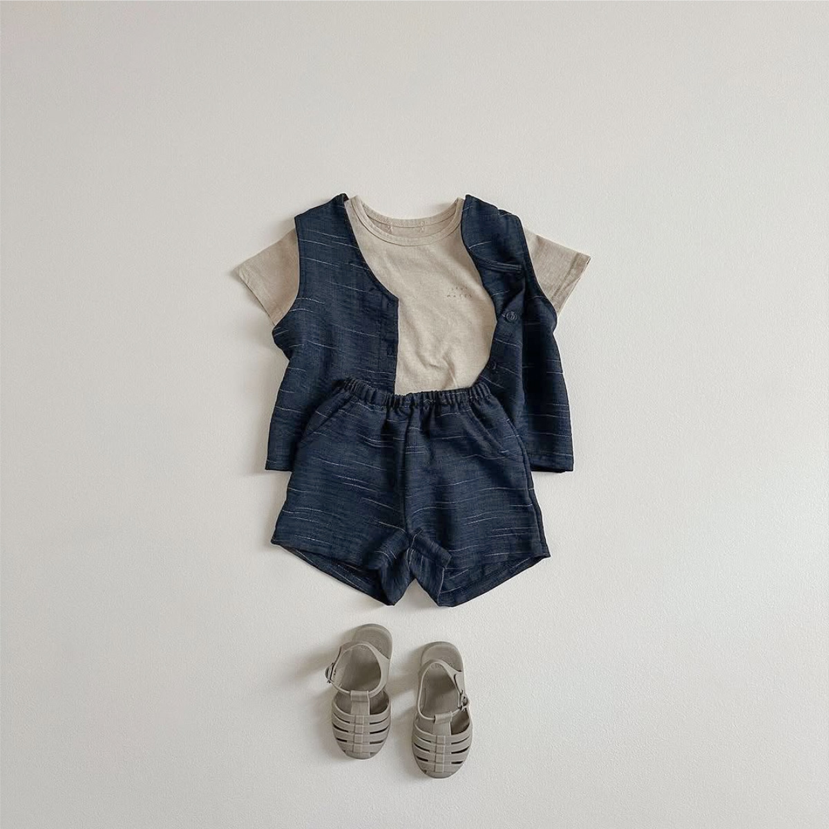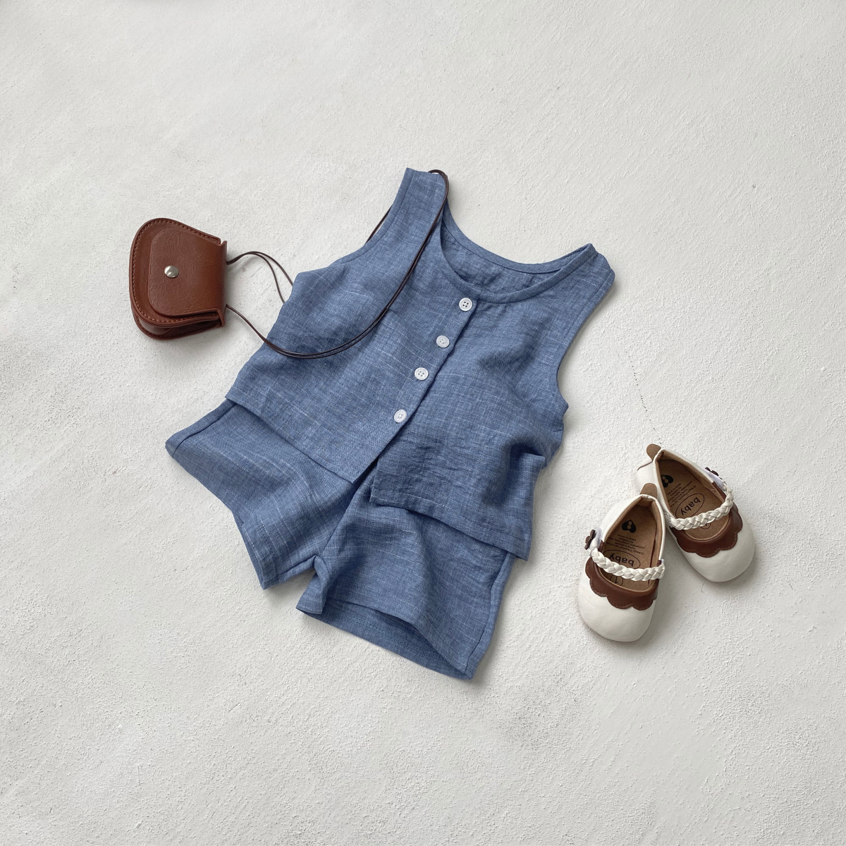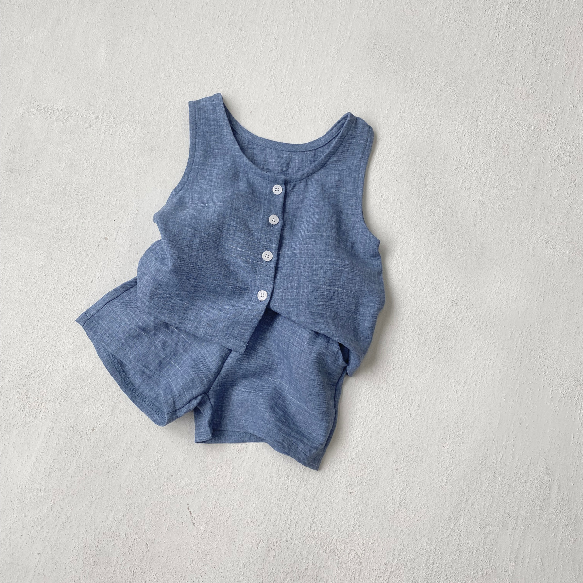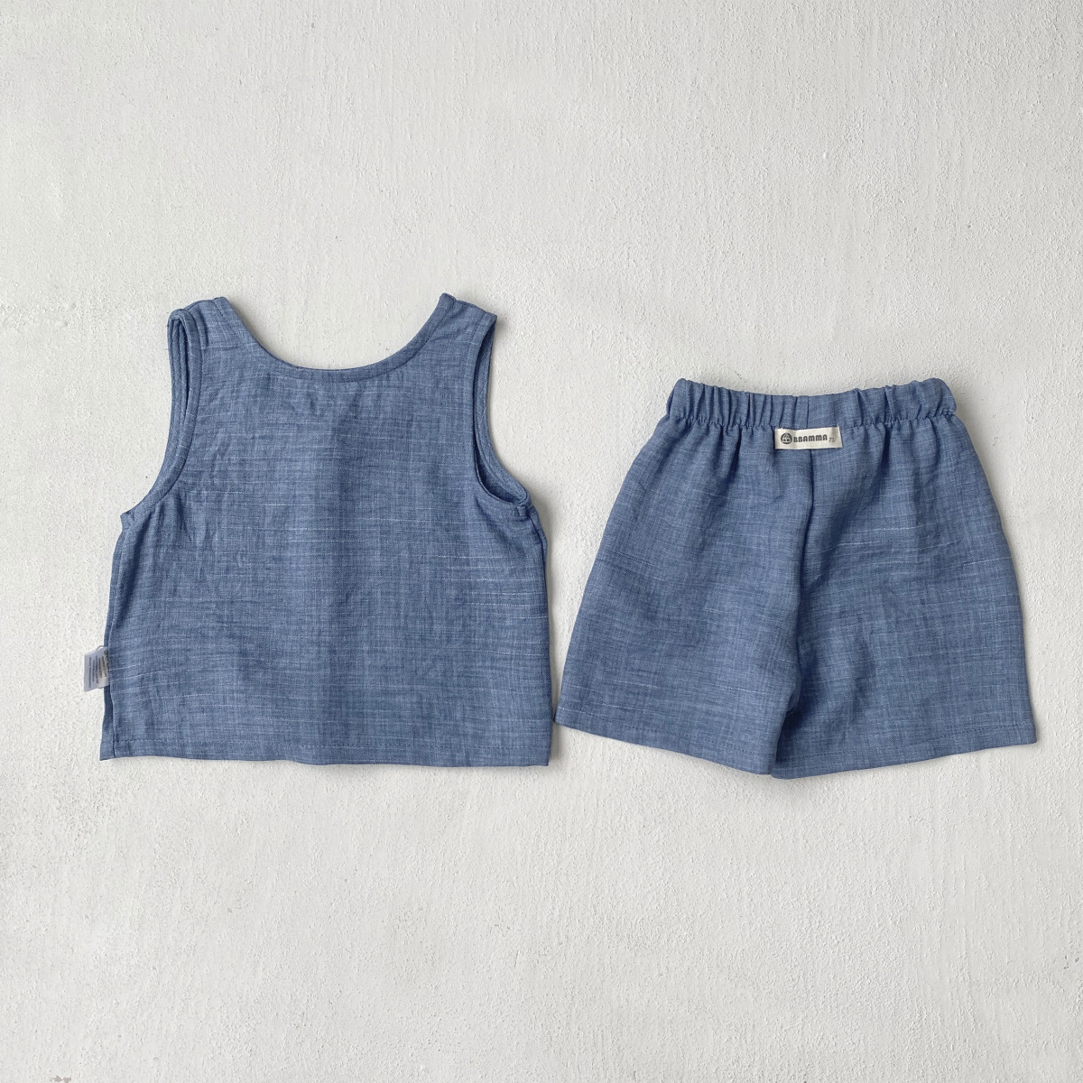 소년과 소녀를위한 아동복 모조 데님 원사 염색 면 양면 셔틀 우븐 민소매 티셔츠 반바지 정장 투피스 세트