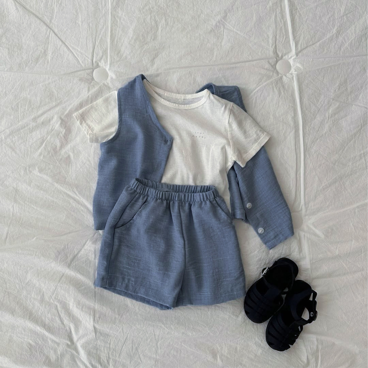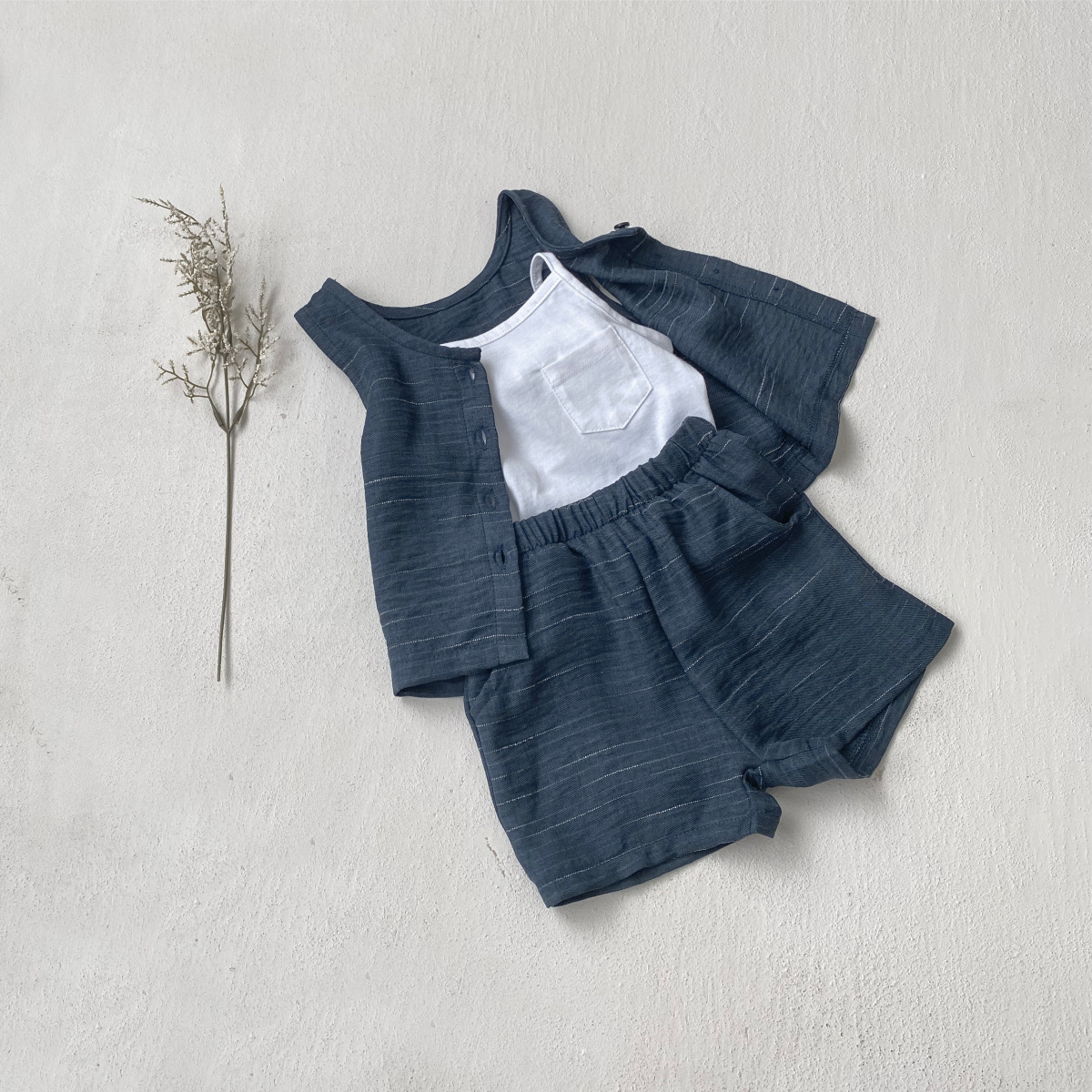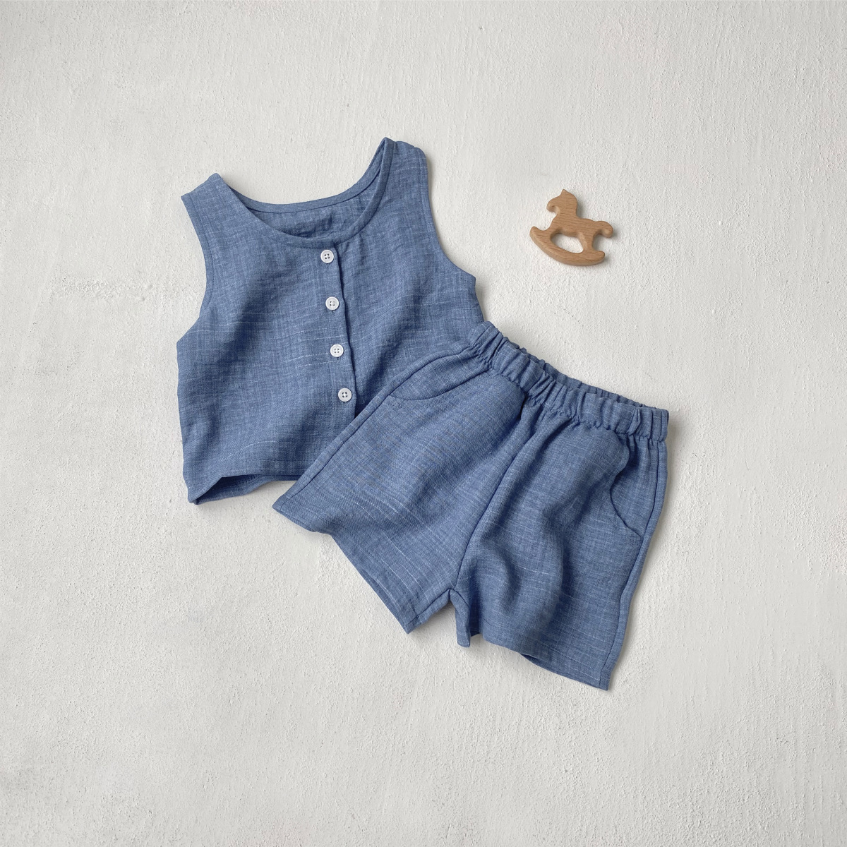 소년과 소녀를위한 아동복 모조 데님 원사 염색 면 양면 셔틀 우븐 민소매 티셔츠 반바지 정장 투피스 세트