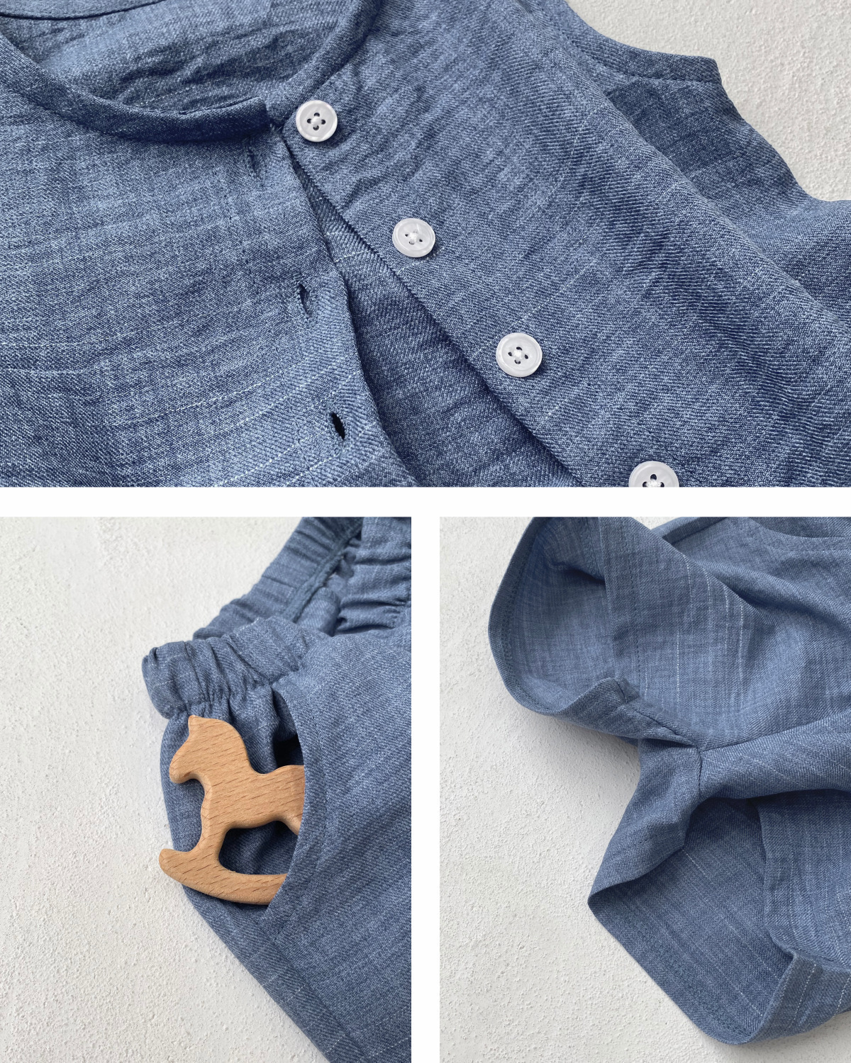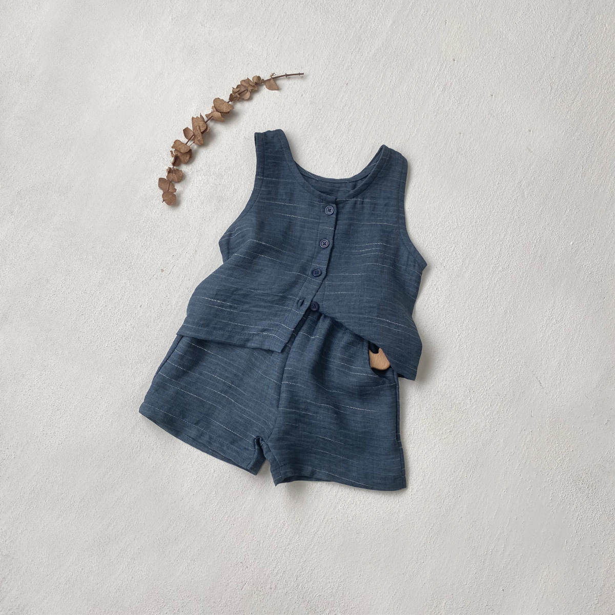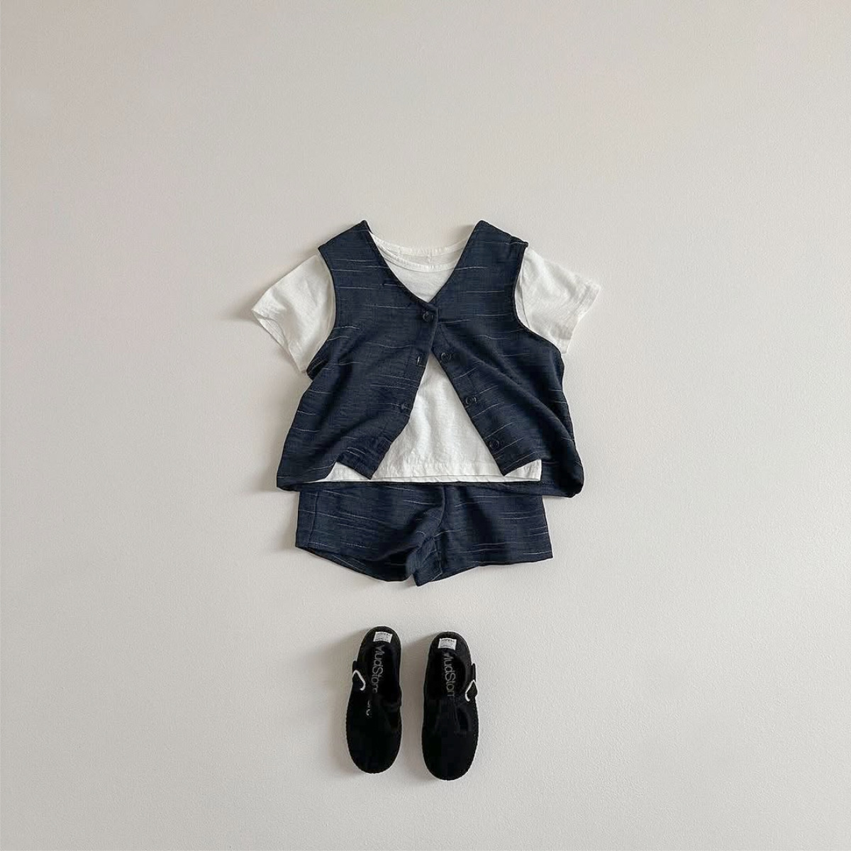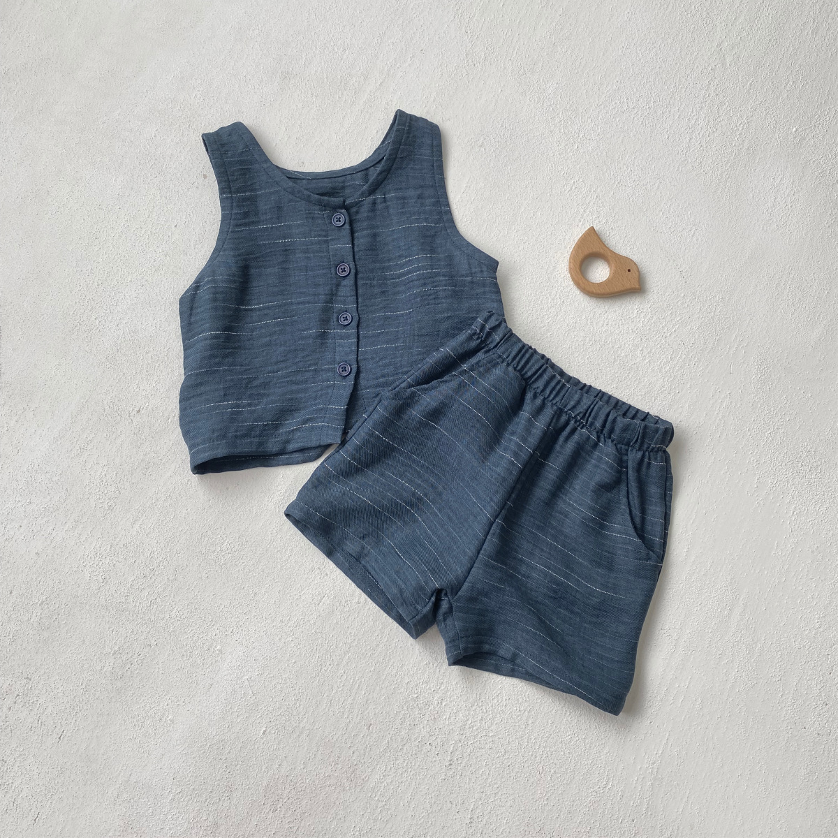 소년과 소녀를위한 아동복 모조 데님 원사 염색 면 양면 셔틀 우븐 민소매 티셔츠 반바지 정장 투피스 세트