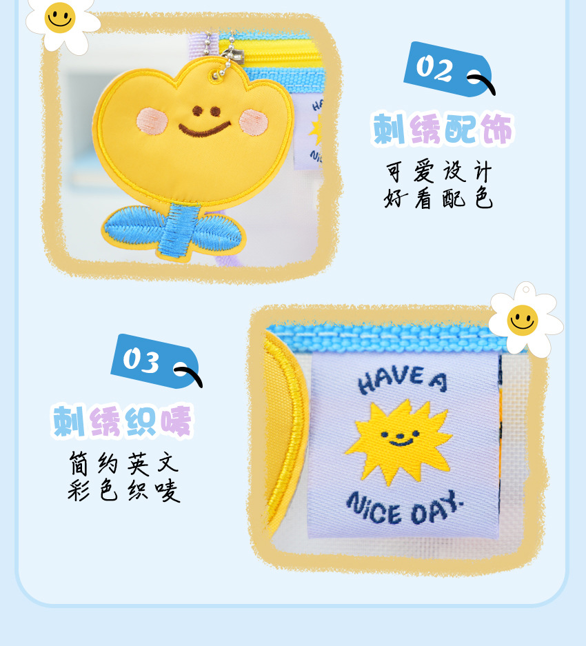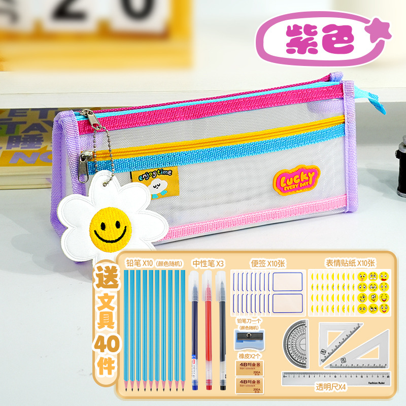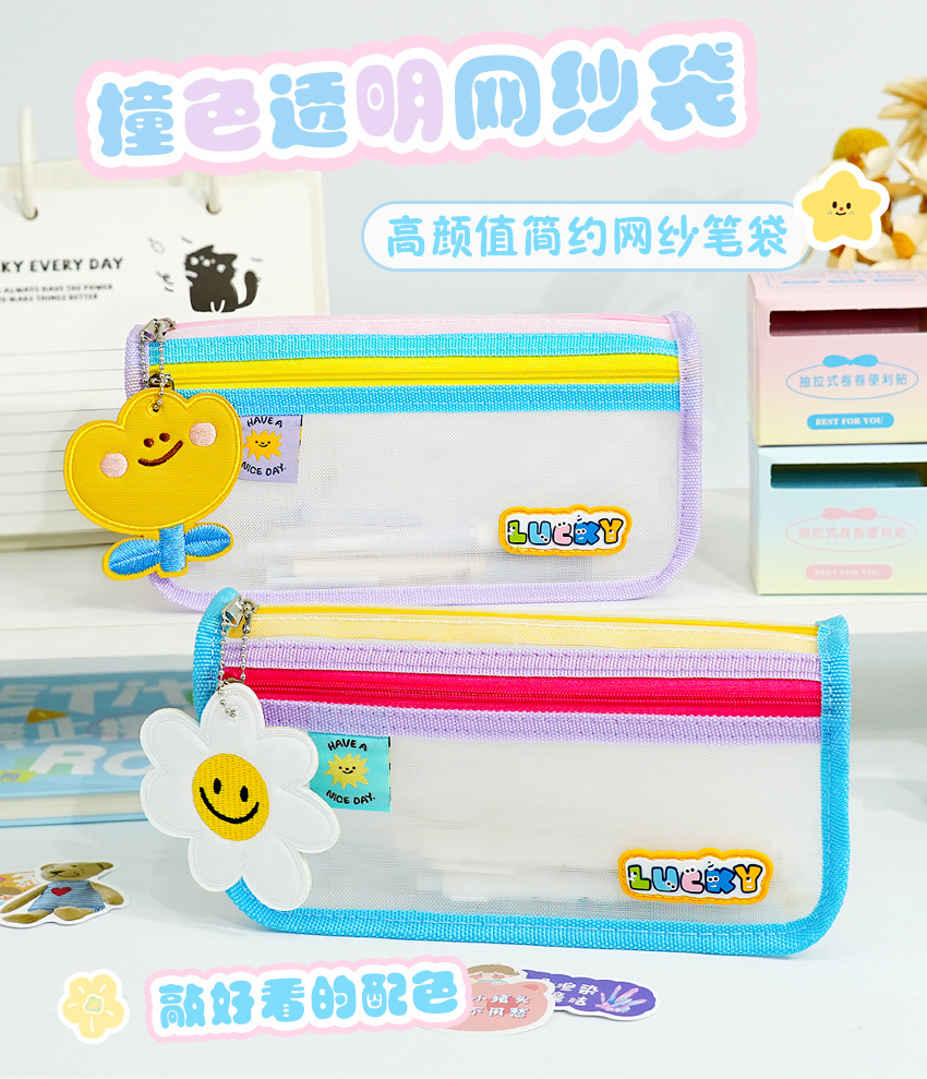 새로운 귀여운 만화 대비 색상 투명 문구 가방 잡다한 보관 학생 고급스러운 연필 가방 대용량 메쉬 가방