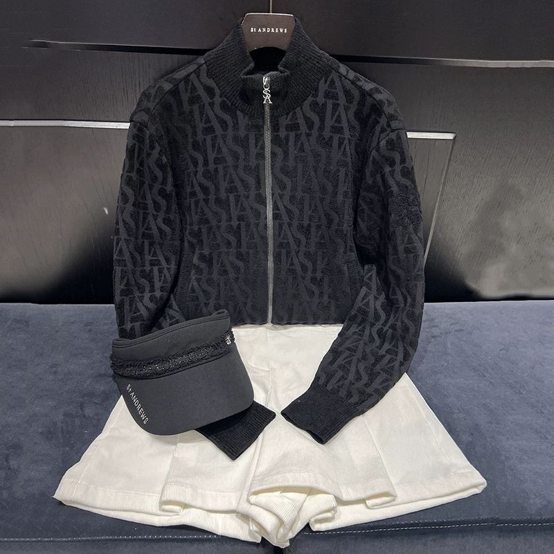 한국 골프 의류 여성 봄, 가을 새로운 스탠드 칼라 지퍼 패턴 인쇄 흑백 색상 캐주얼 골프웨어스토어 가기