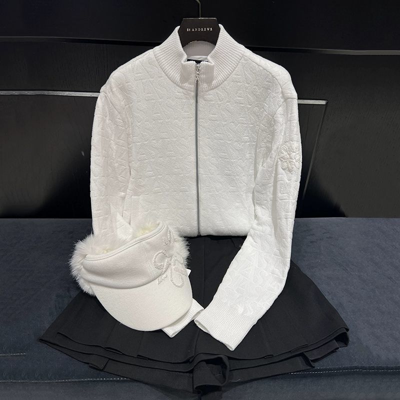 한국 골프 의류 여성 봄, 가을 새로운 스탠드 칼라 지퍼 패턴 인쇄 흑백 색상 캐주얼 골프웨어