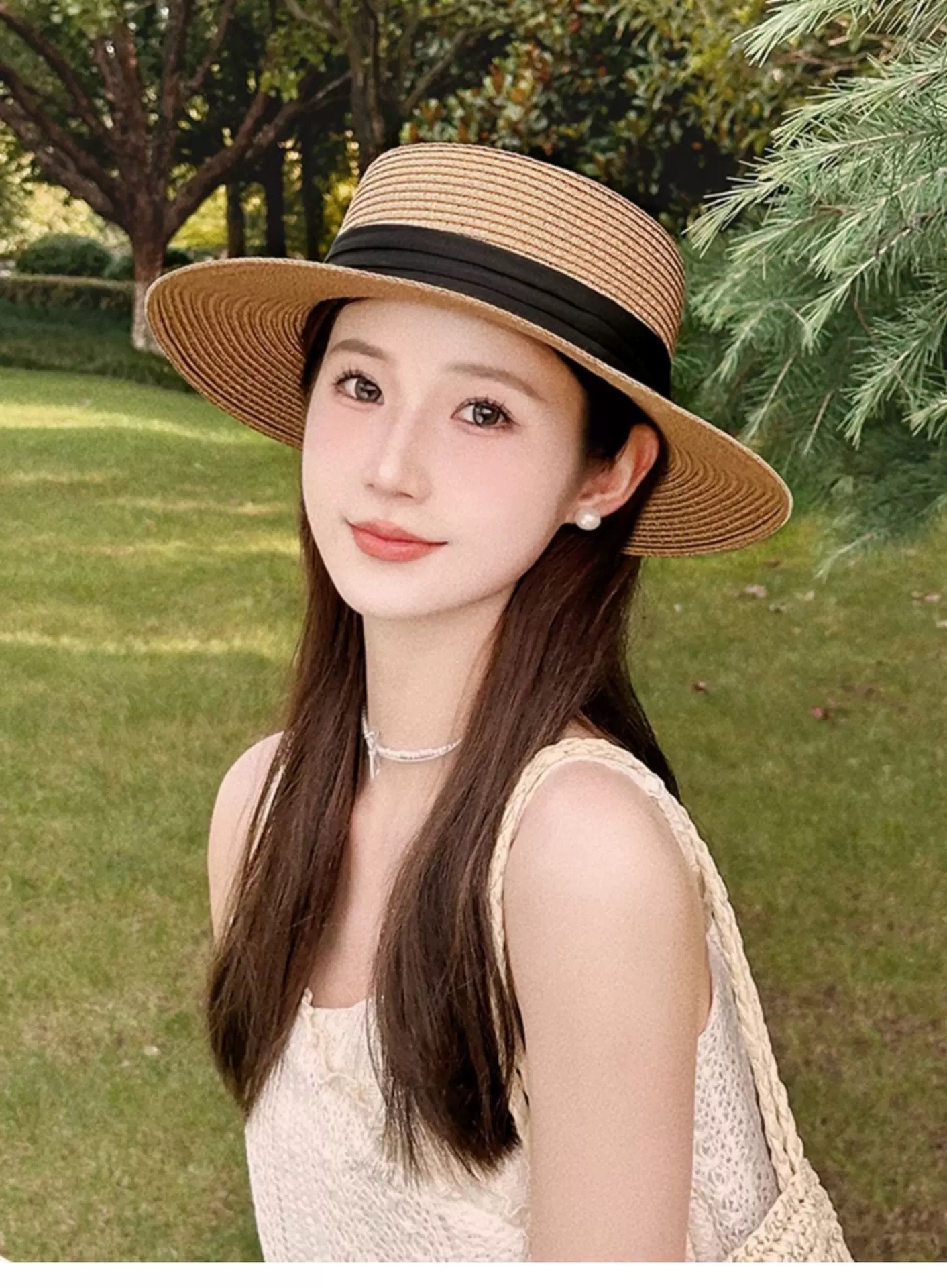 플랫 탑 밀짚 모자 여성 프랑스 밀짚 모자 2025 새로운 여름 큰 챙 태양 모자 해변 휴가 태양 모자스토어 가기