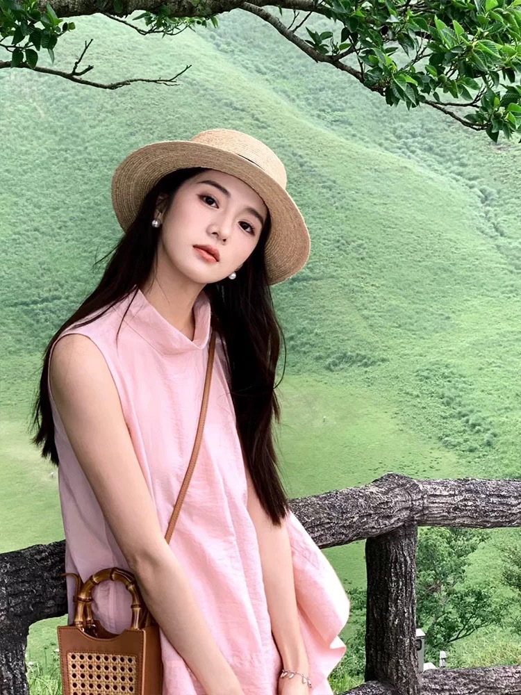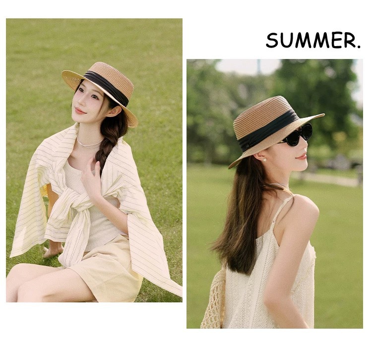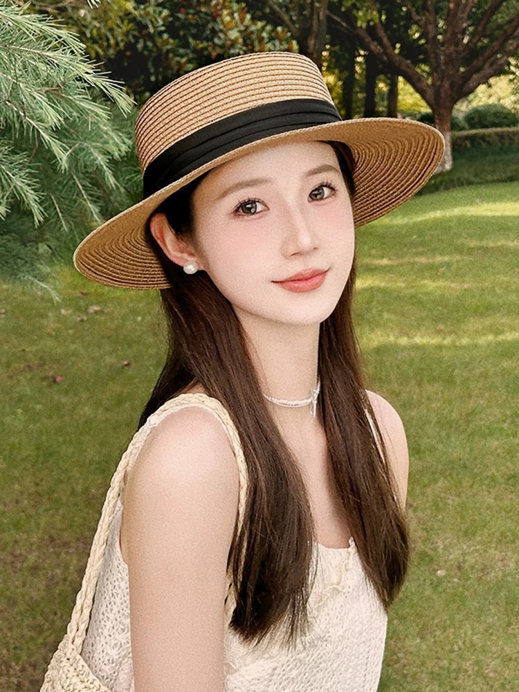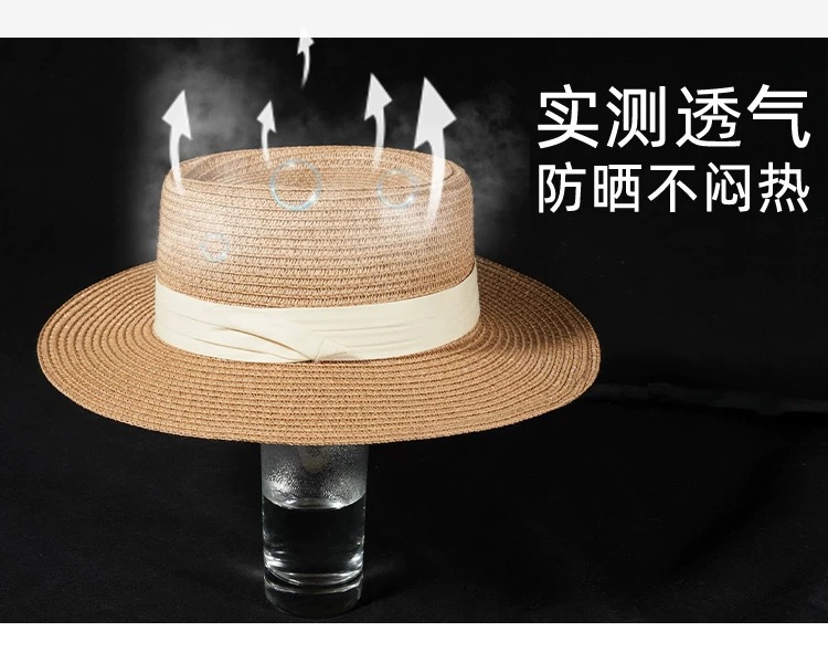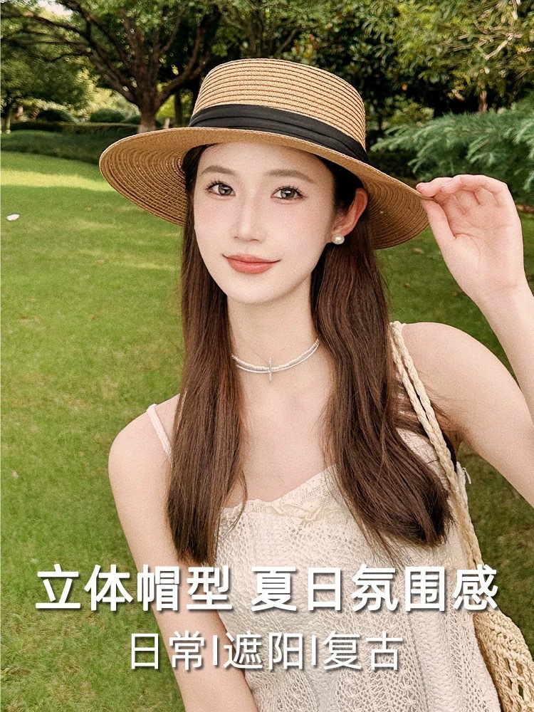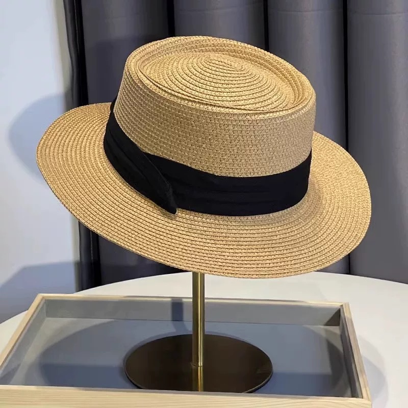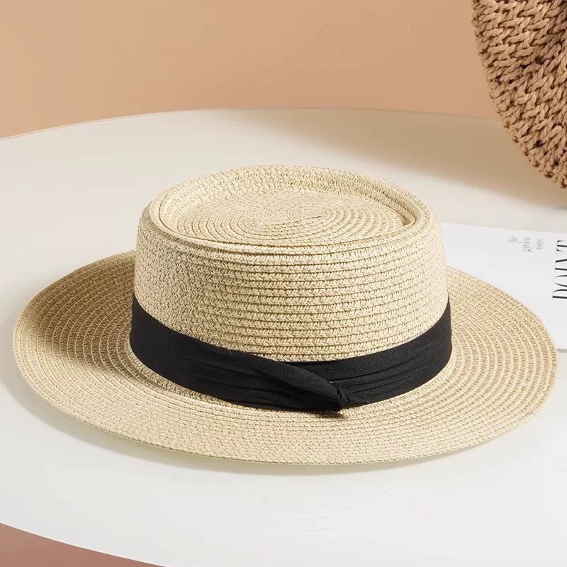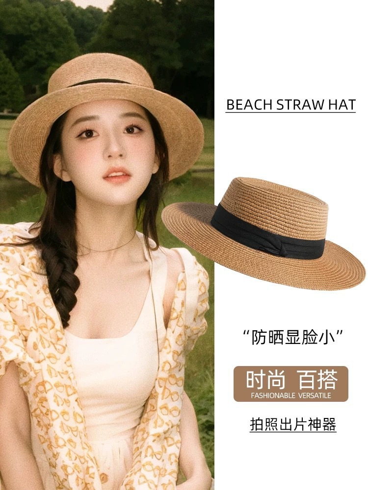 플랫 탑 밀짚 모자 여성 프랑스 밀짚 모자 2025 새로운 여름 큰 챙 태양 모자 해변 휴가 태양 모자