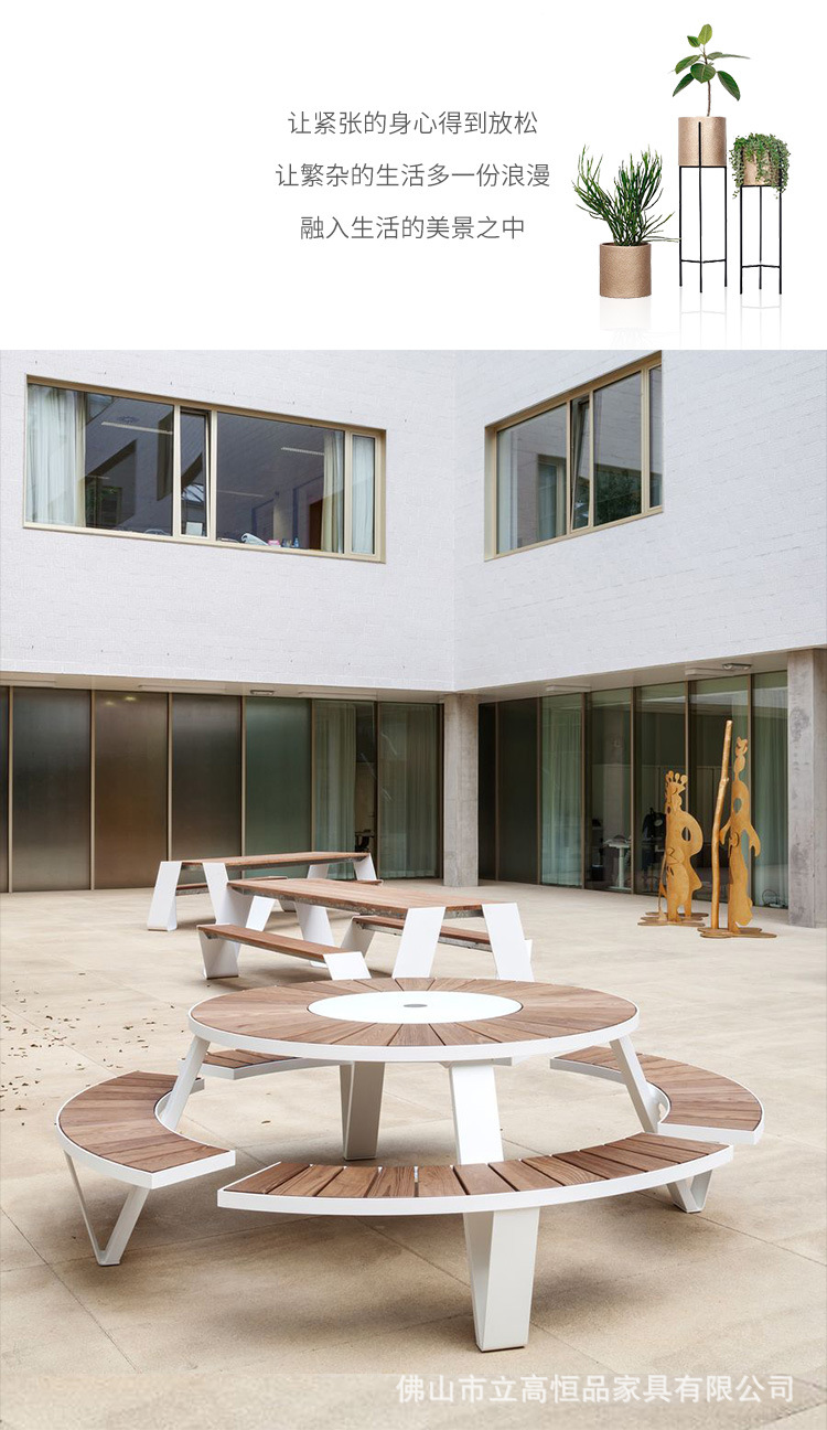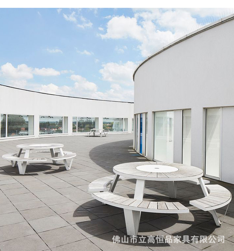 • 흰색 원형 일체형 테이블과 의자 [플라스틱 목재 소재 + 아연 도금 강철 프레임]