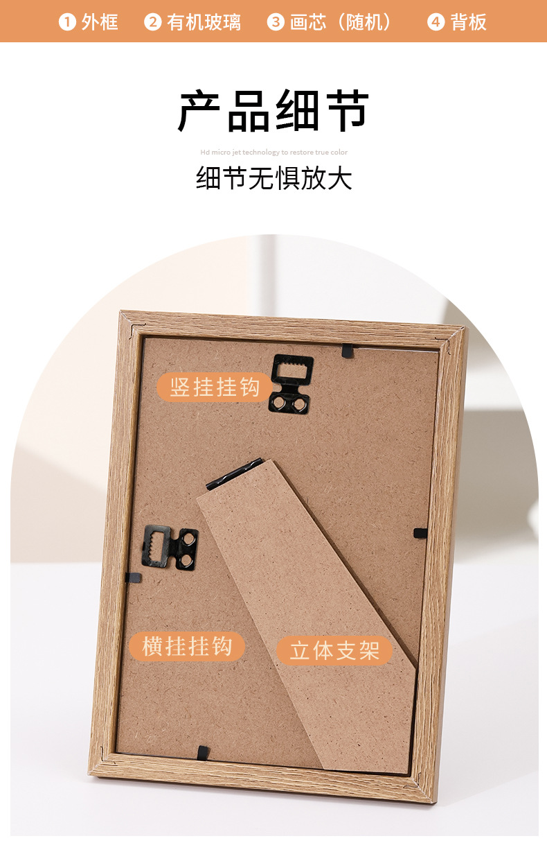 二、相框成品包含:外框、塑料有机玻璃面板、随机图案画芯,后密度板背板、