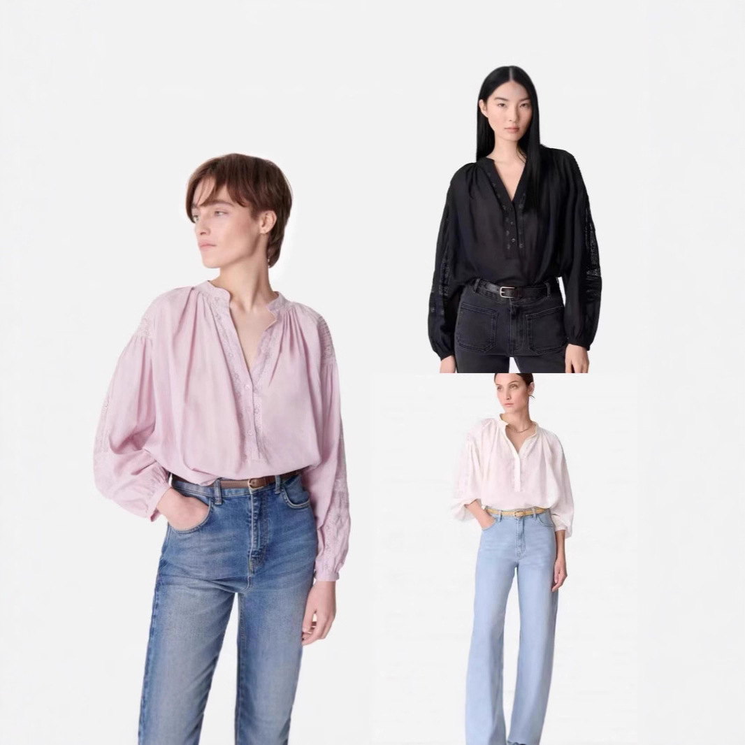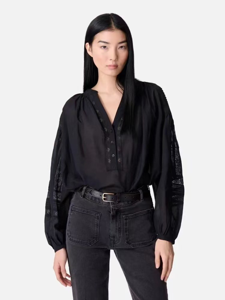 프랑스 스타일 여성 긴팔 셔츠 봄 여름 신상 달콤한 레이스 패치워크 셔츠 루즈한 V넥 퍼프 슬리브 탑 여성용스토어 가기