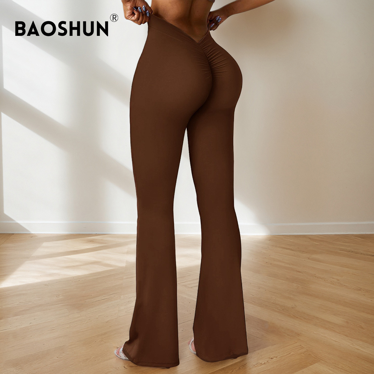 유럽과 미국의 이음매없는 탄성 속건성 통기성 요가 바지 V 허리 엉덩이 리프팅 허리 야외 피트니스 스포츠 마이크로 플레어 바지스토어 가기