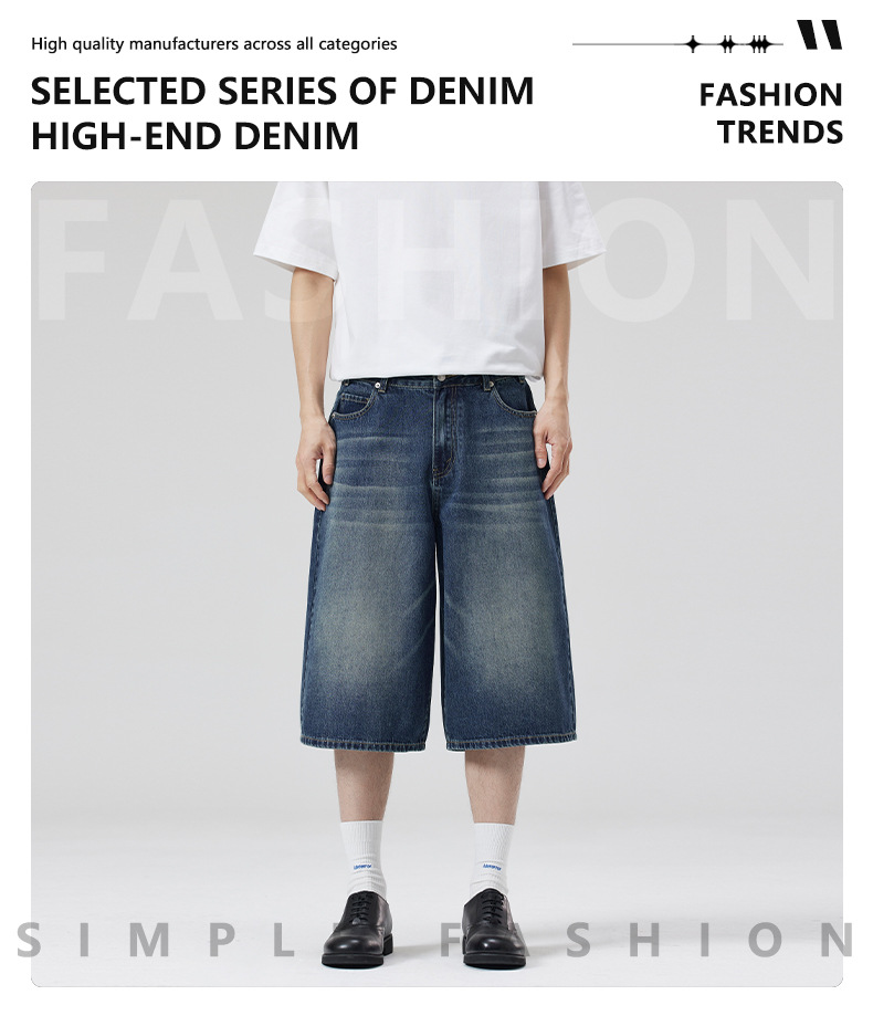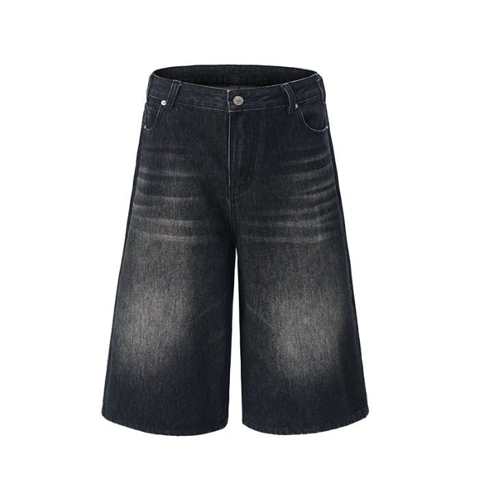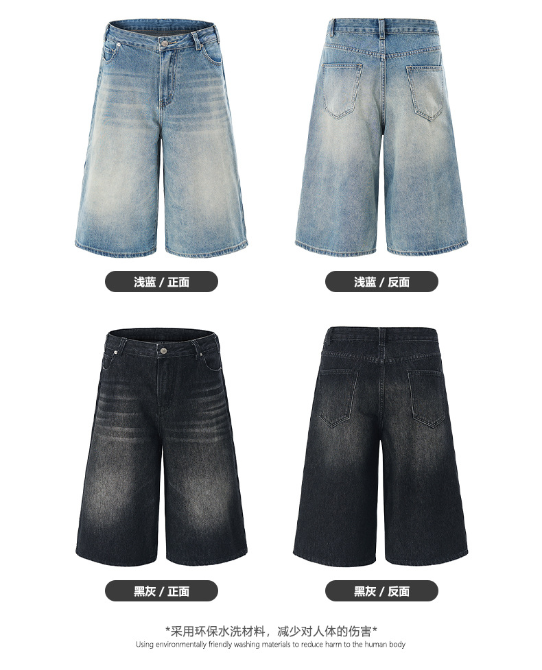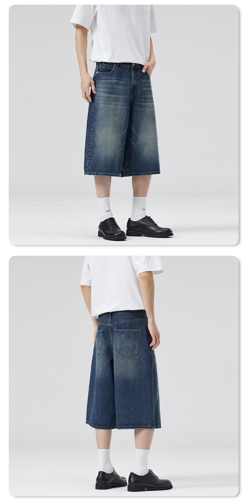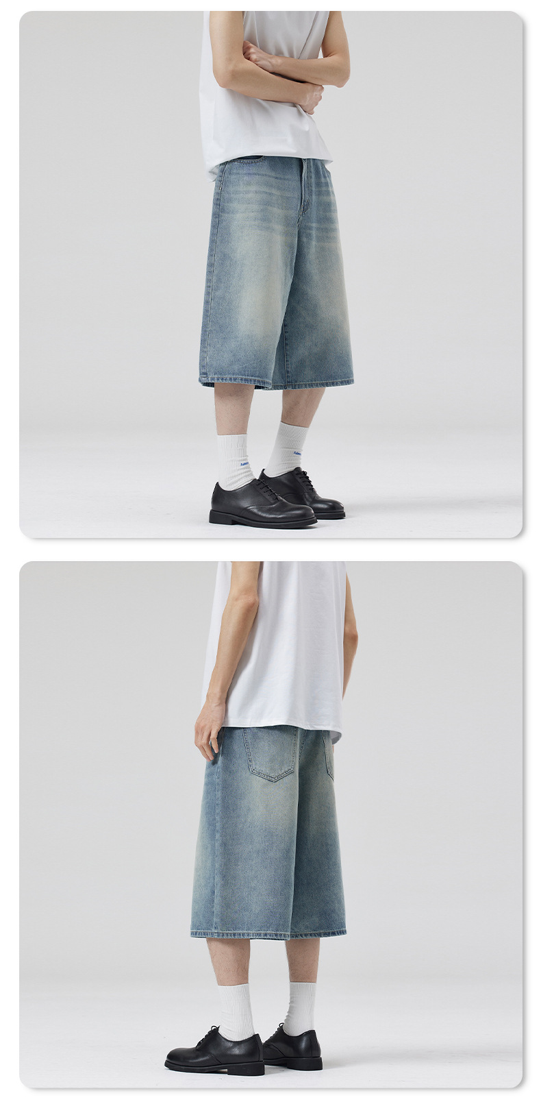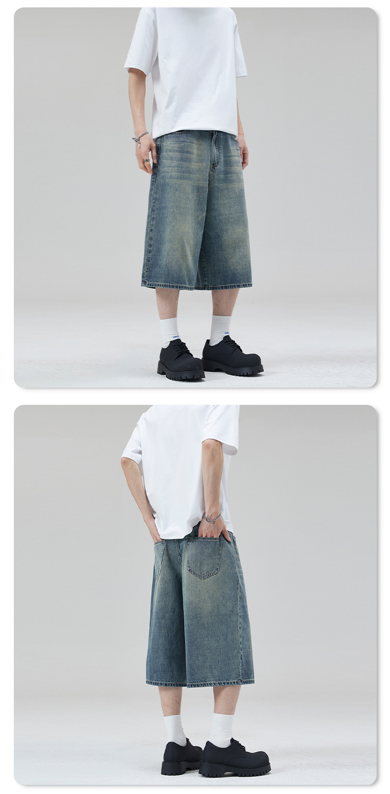 여름 신작 미국 복고풍 트렌디 브랜드 커플 루즈한 와이드 레그 크롭 팬츠 남성용 디스트레스드 스트레이트 슬림 데님 반바지