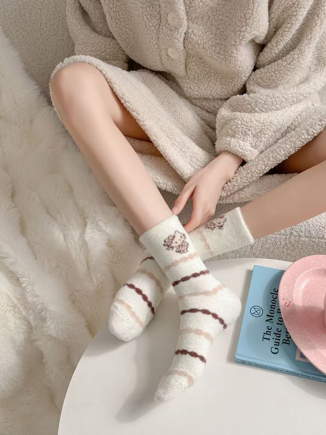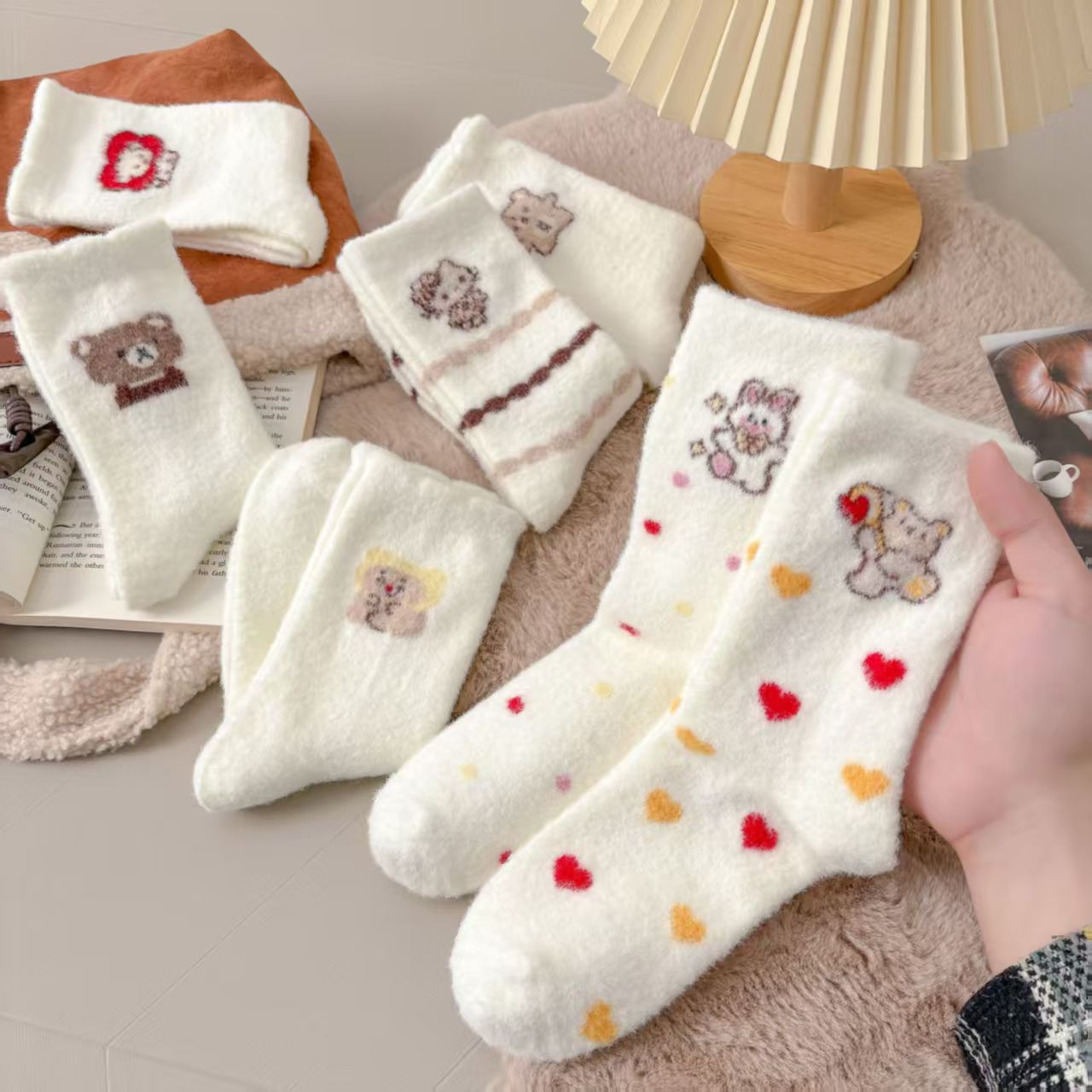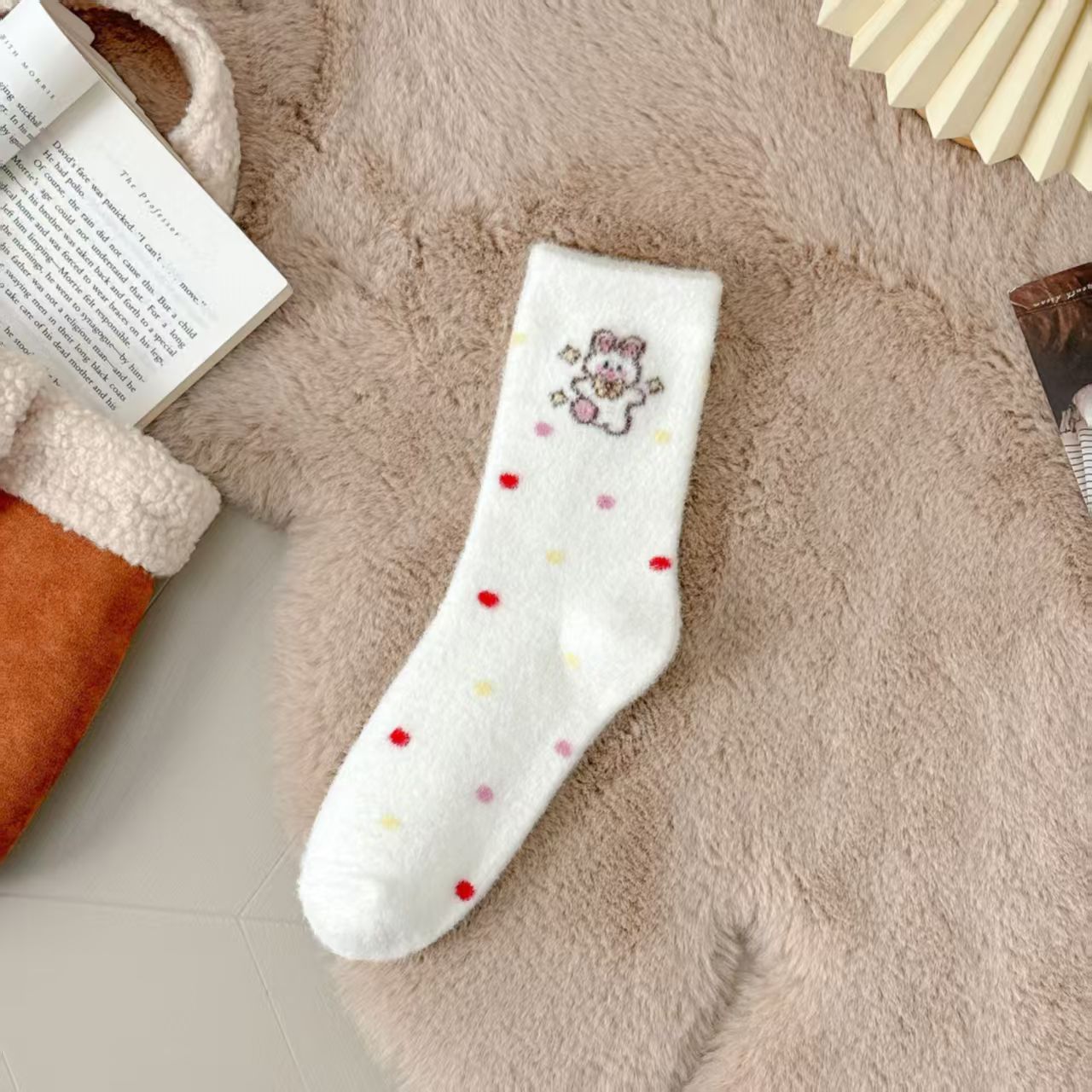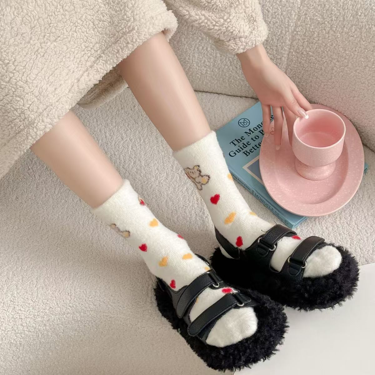 여성을위한 핑크색 달콤하고 귀여운 양말 겨울 모피 중간 튜브 양말 홈 슬리핑 양말 홈 플로어 양말 두꺼운 바닥 양말