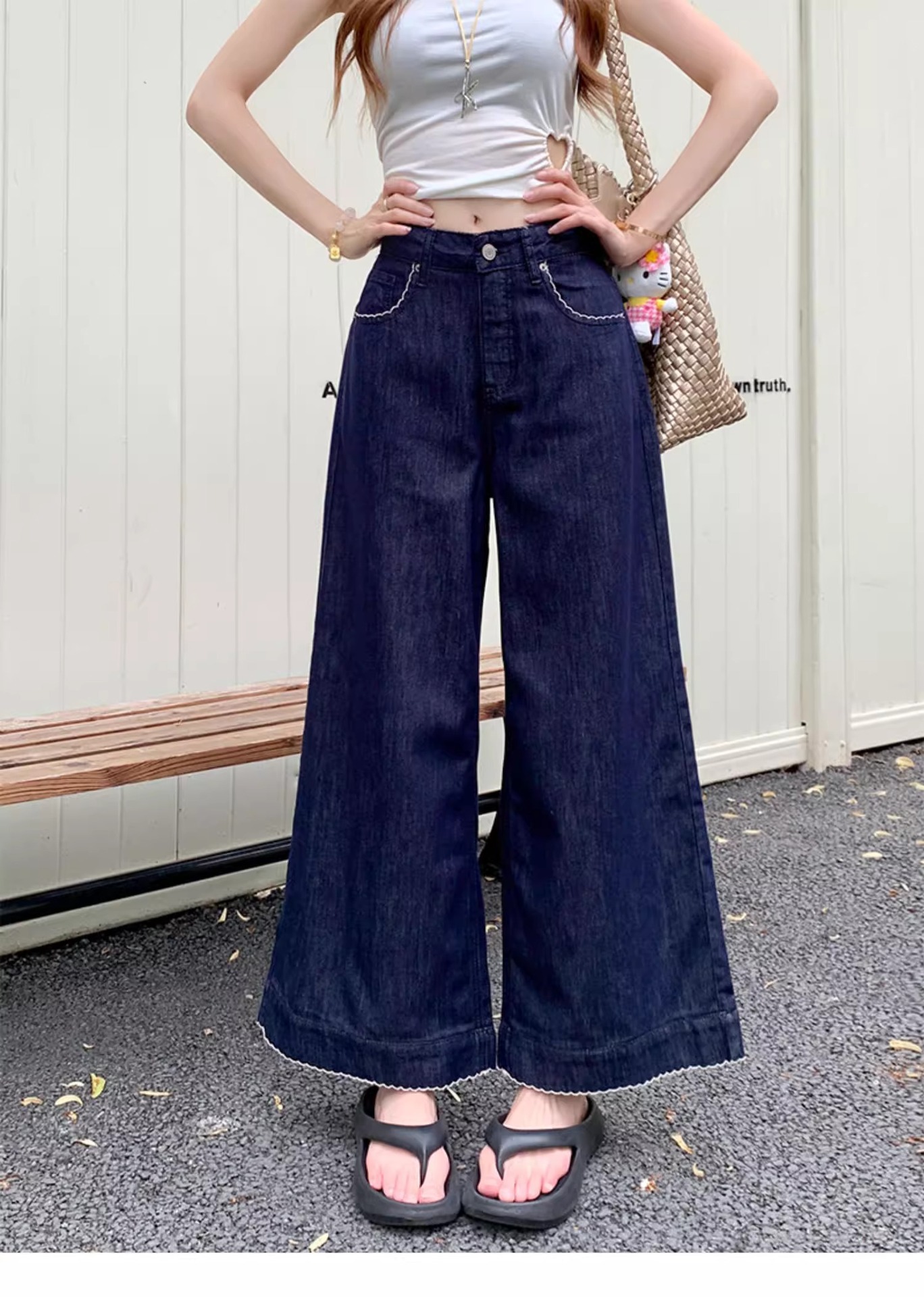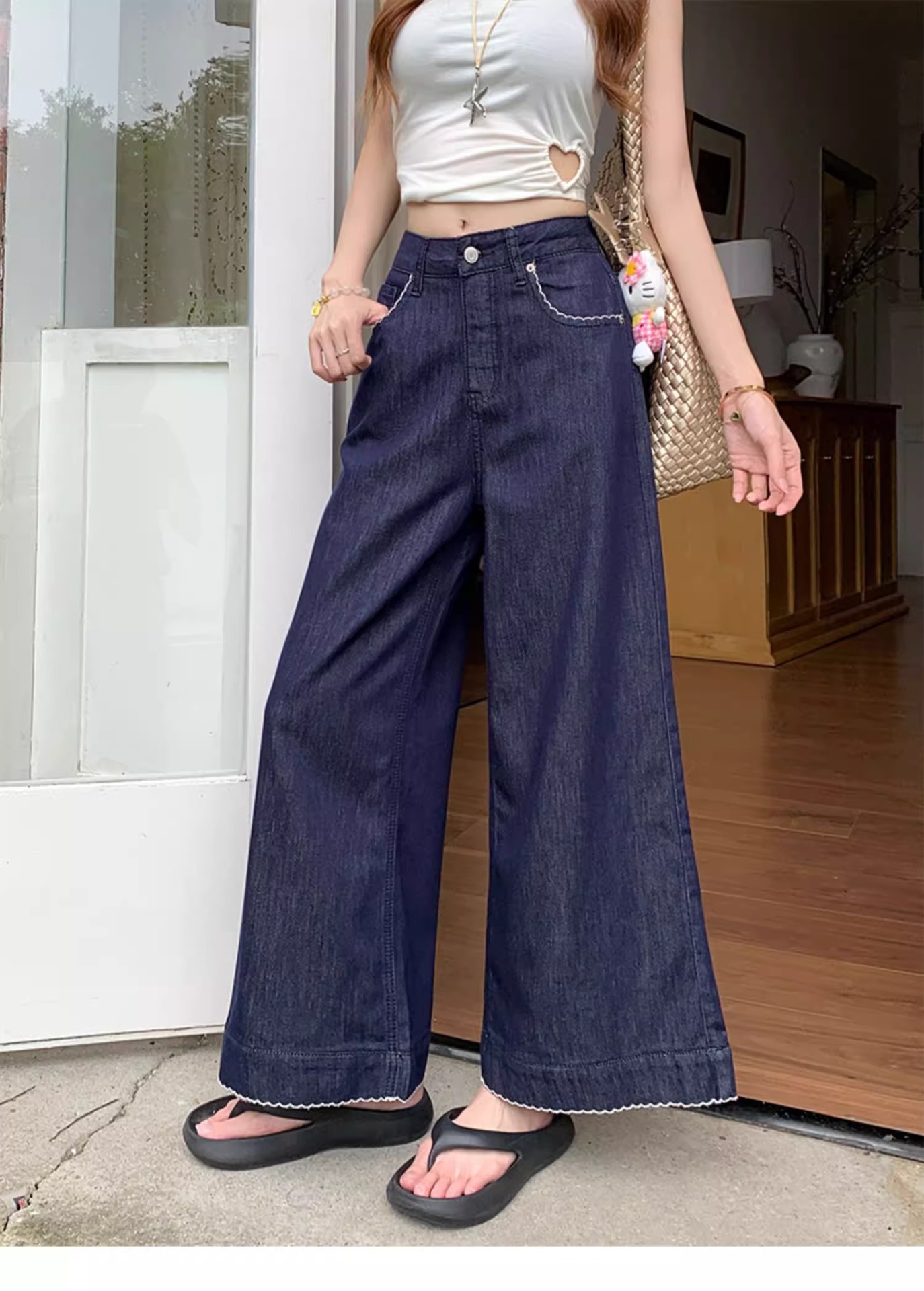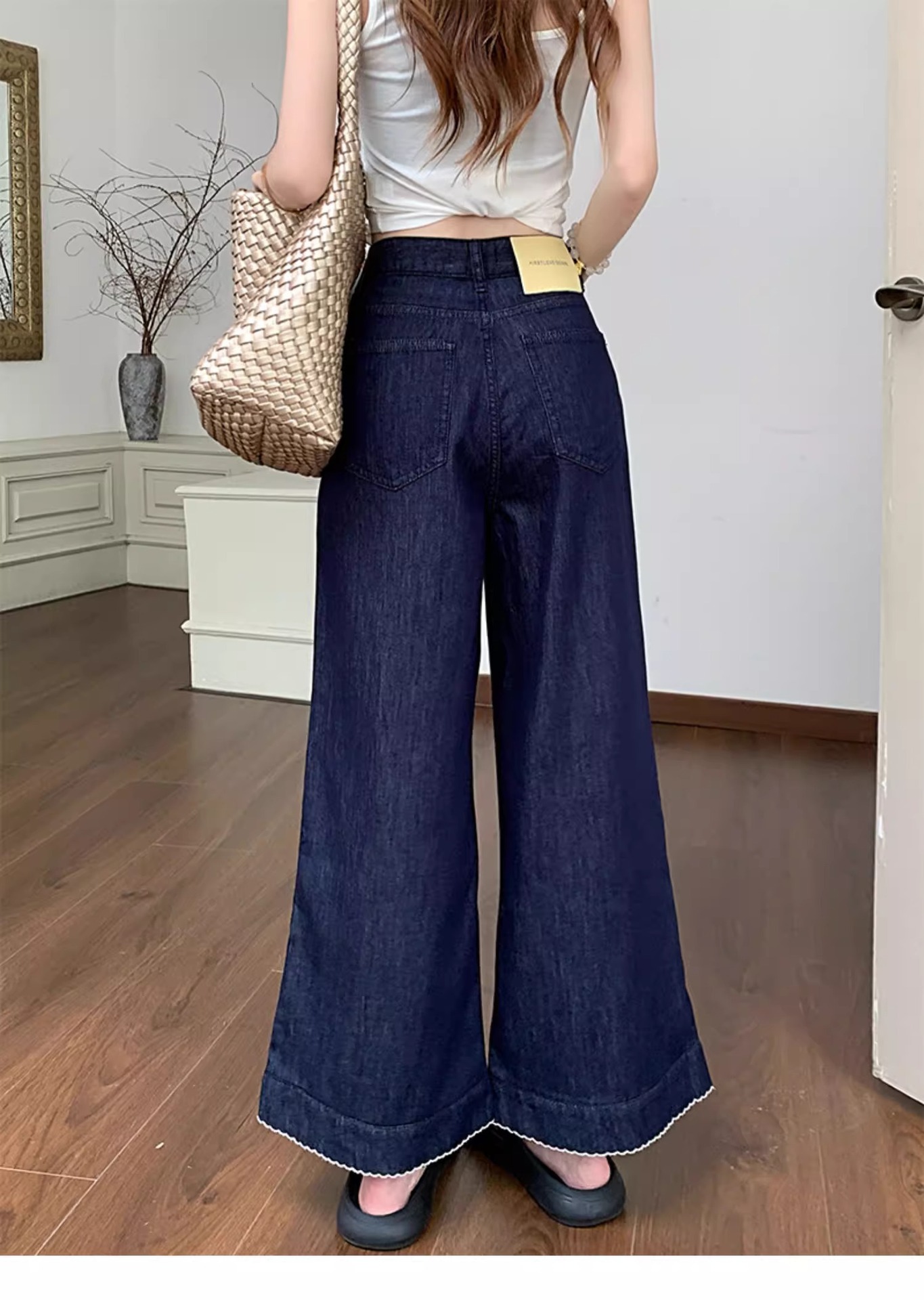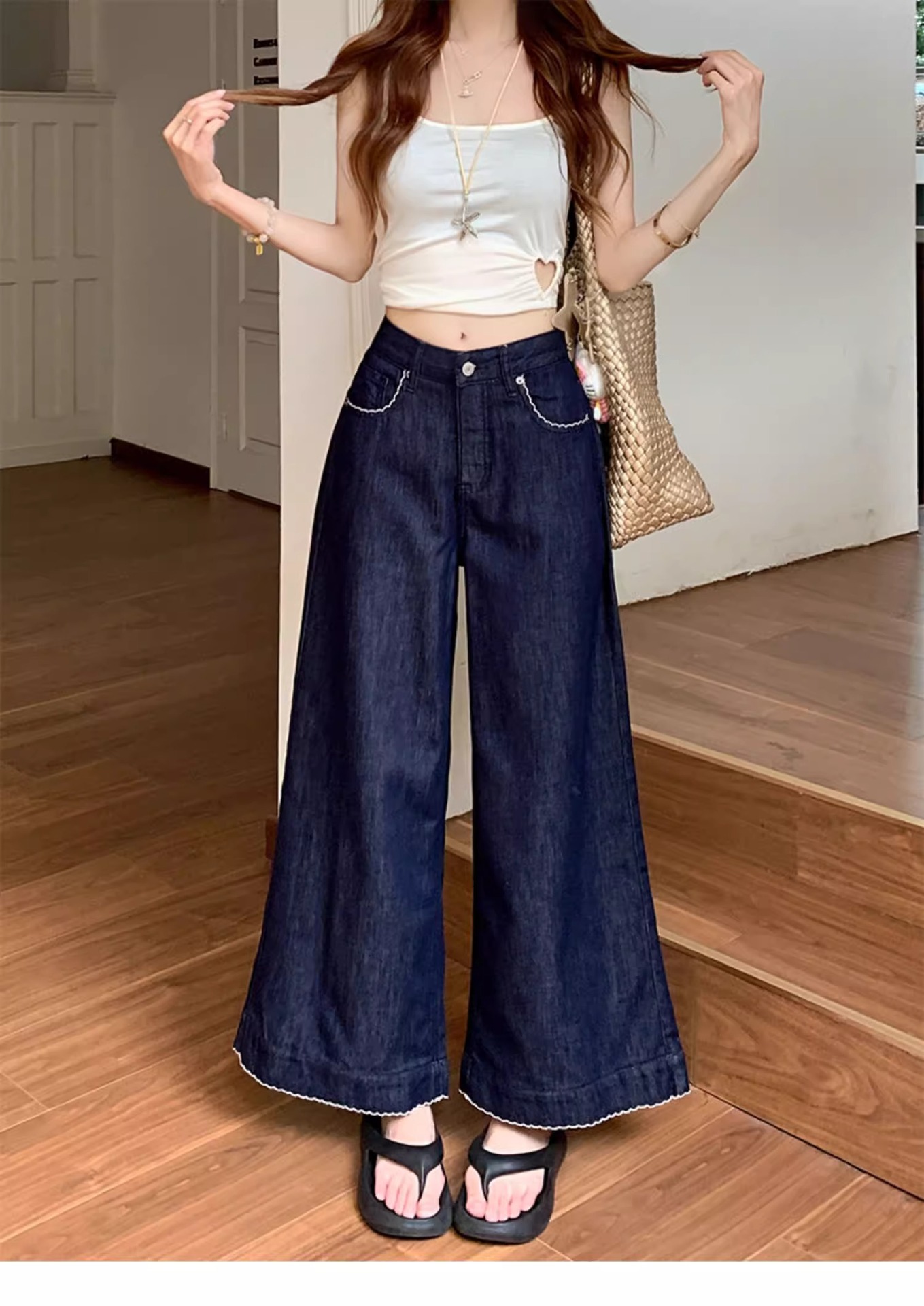 여름용 여성용 레트로 다크 블루 청바지 얇은 뚱뚱한 mm 루즈한 하이 웨이스트 슬리밍 스트레이트 와이드 레그 9부 바지스토어 가기