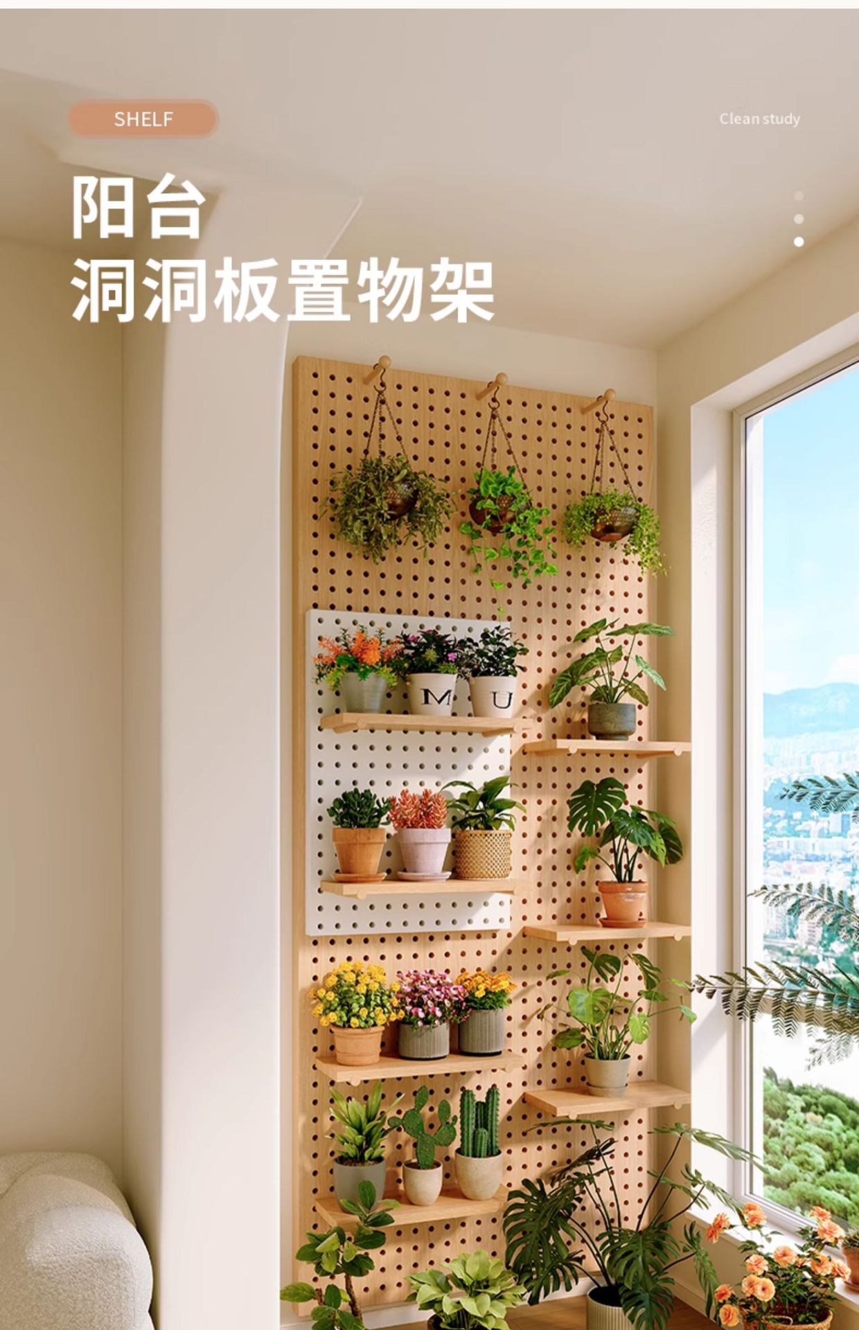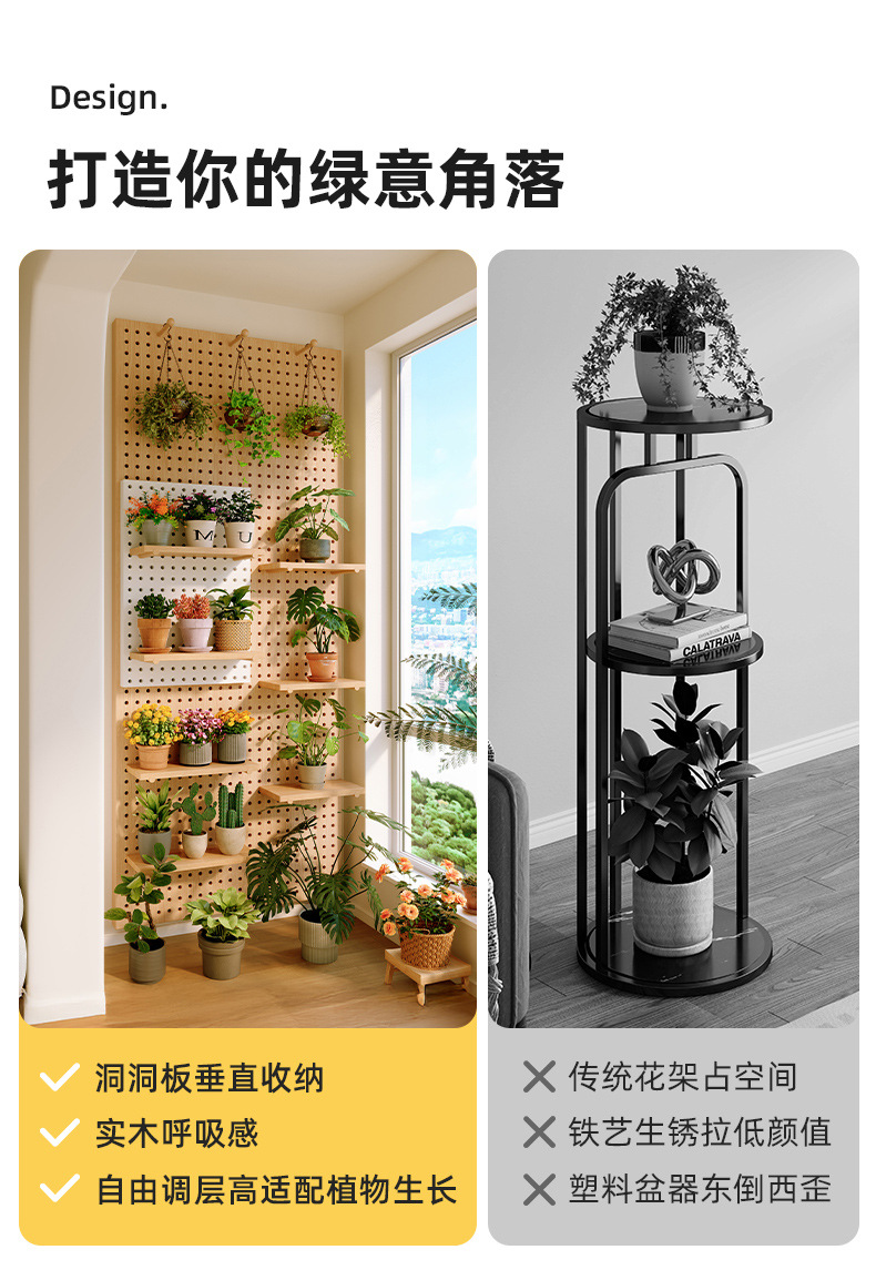 단단한 나무 구멍 보드 보관 랙 발코니 스타일 벽걸이 옷걸이 통합 벽 꽃 스탠드 녹색 식물 디스플레이 스탠드스토어 가기