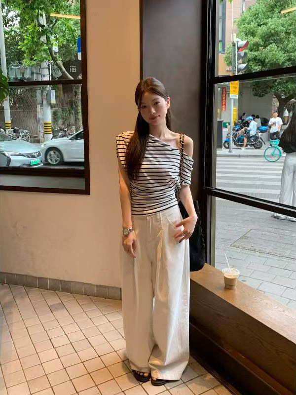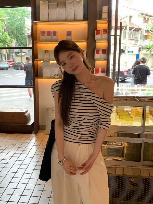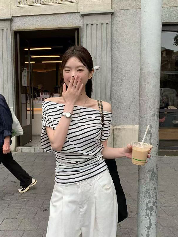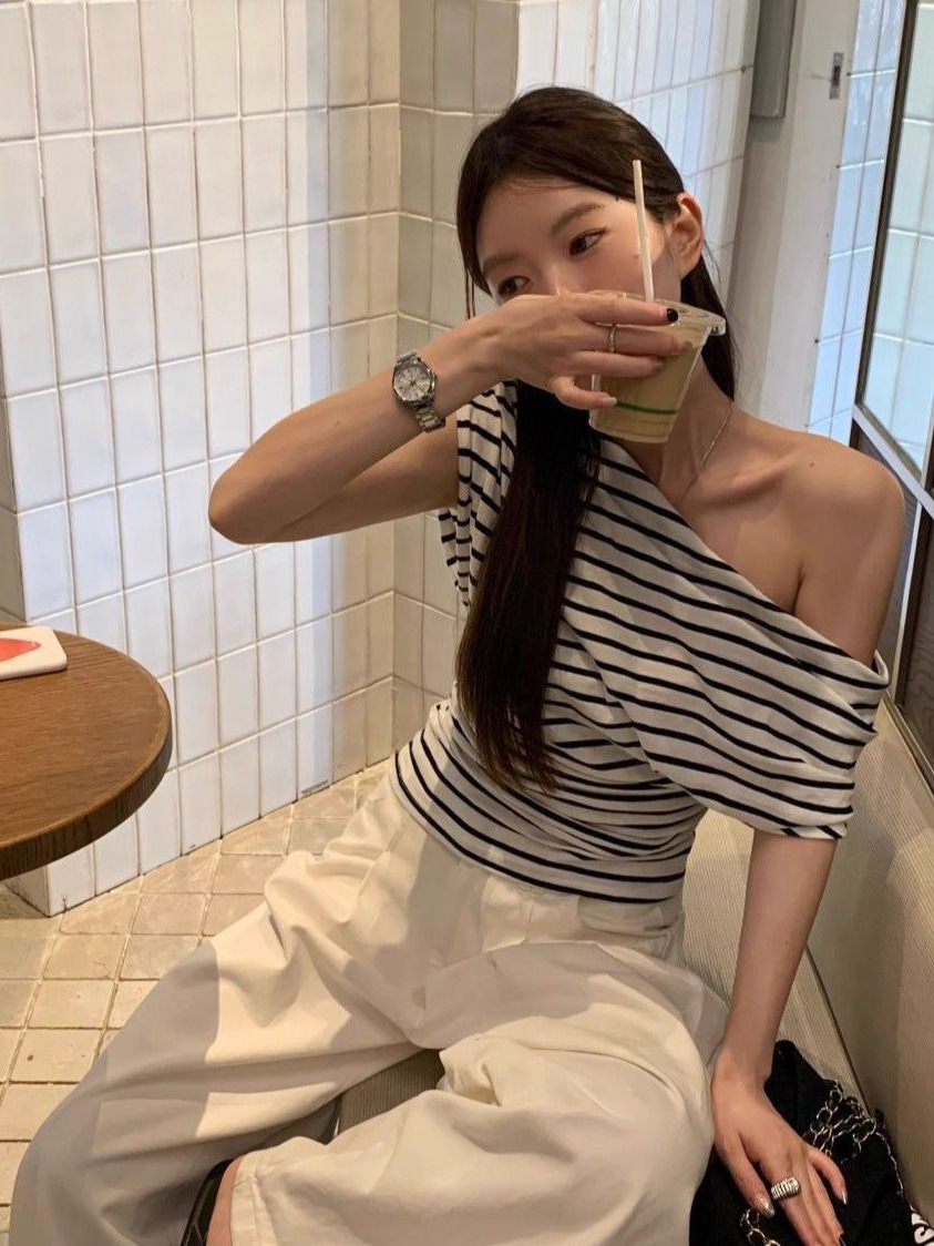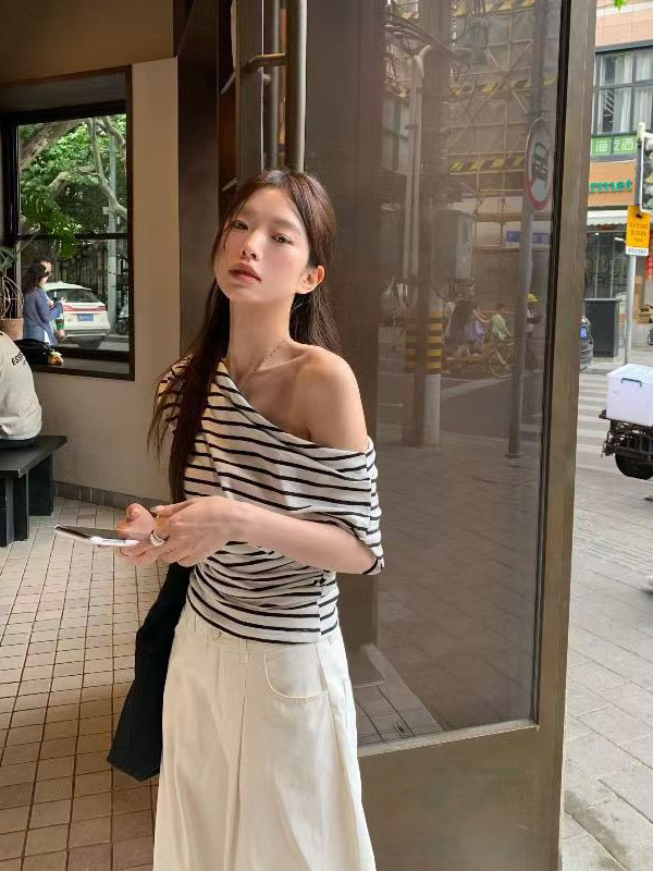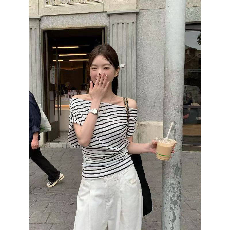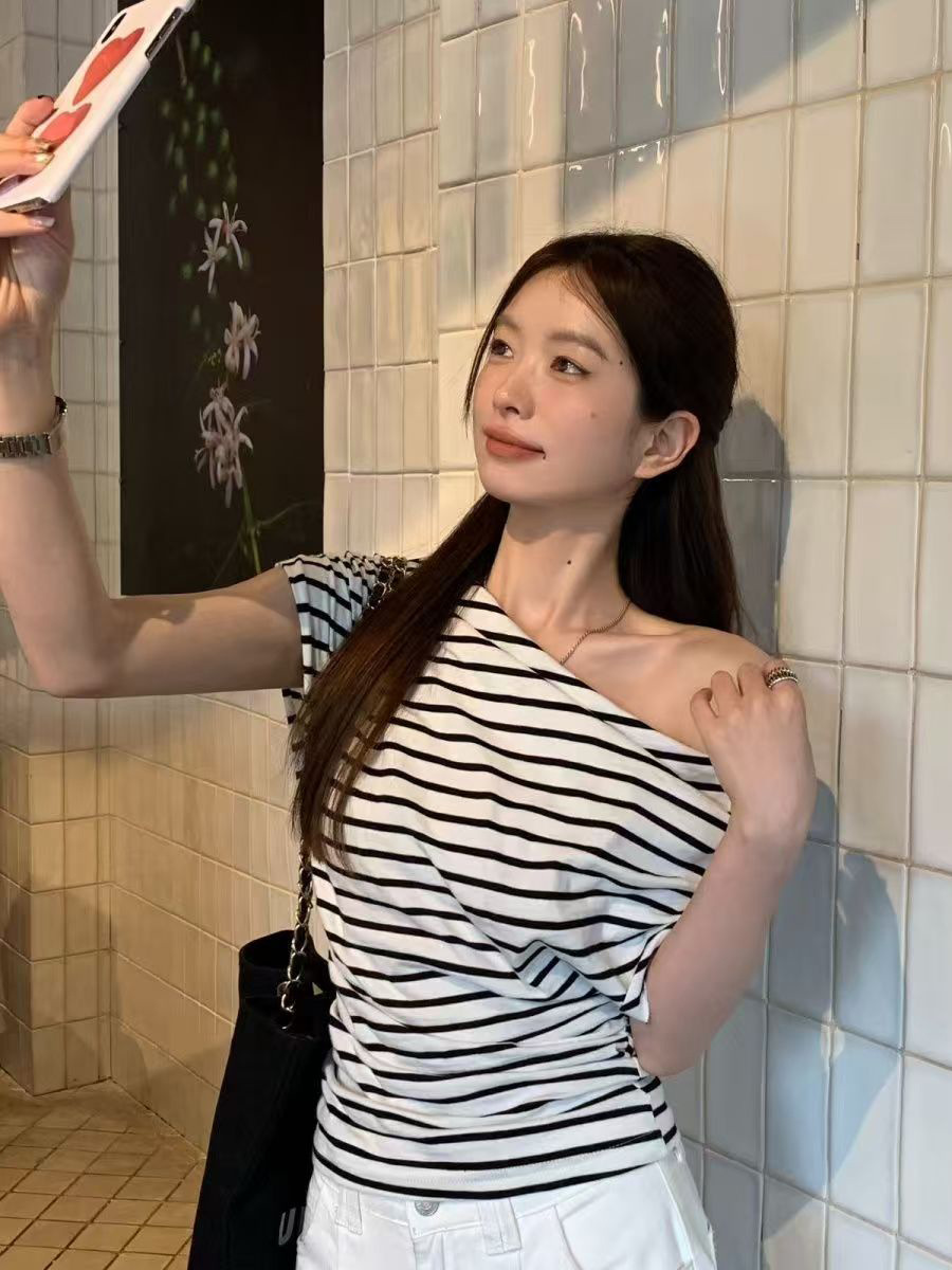여성을위한 Hanli Hanqi 슬로프 숄더 반팔 티셔츠 2025 여름 새 스타일 핫 소녀 슬림 원 숄더 스트라이프 여성 탑스토어 가기